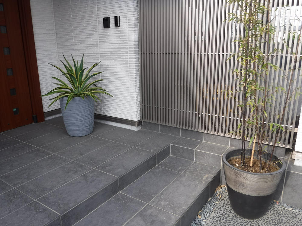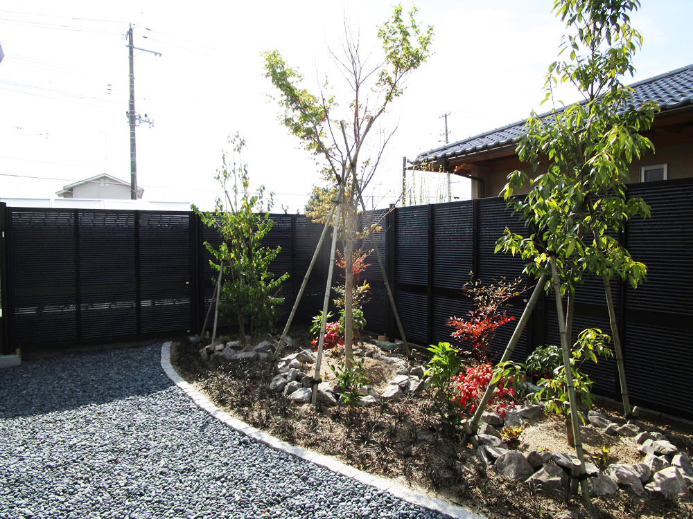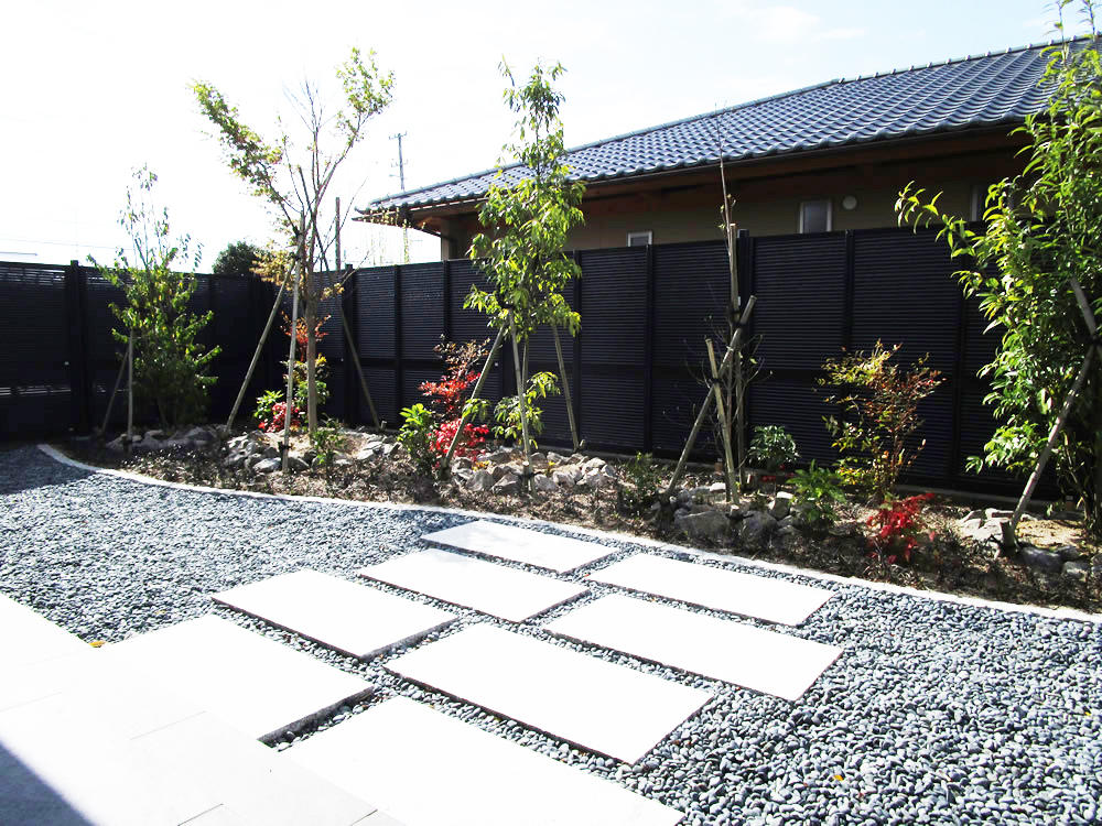 料亭のような建物に合わせた黒玉砂利と真っ白い敷石。 和モダンテイストのお庭には多彩な植物を植え、季節の移ろいを感じる箱庭風にしています。 プランター植栽の光る素敵なお庭になりました。