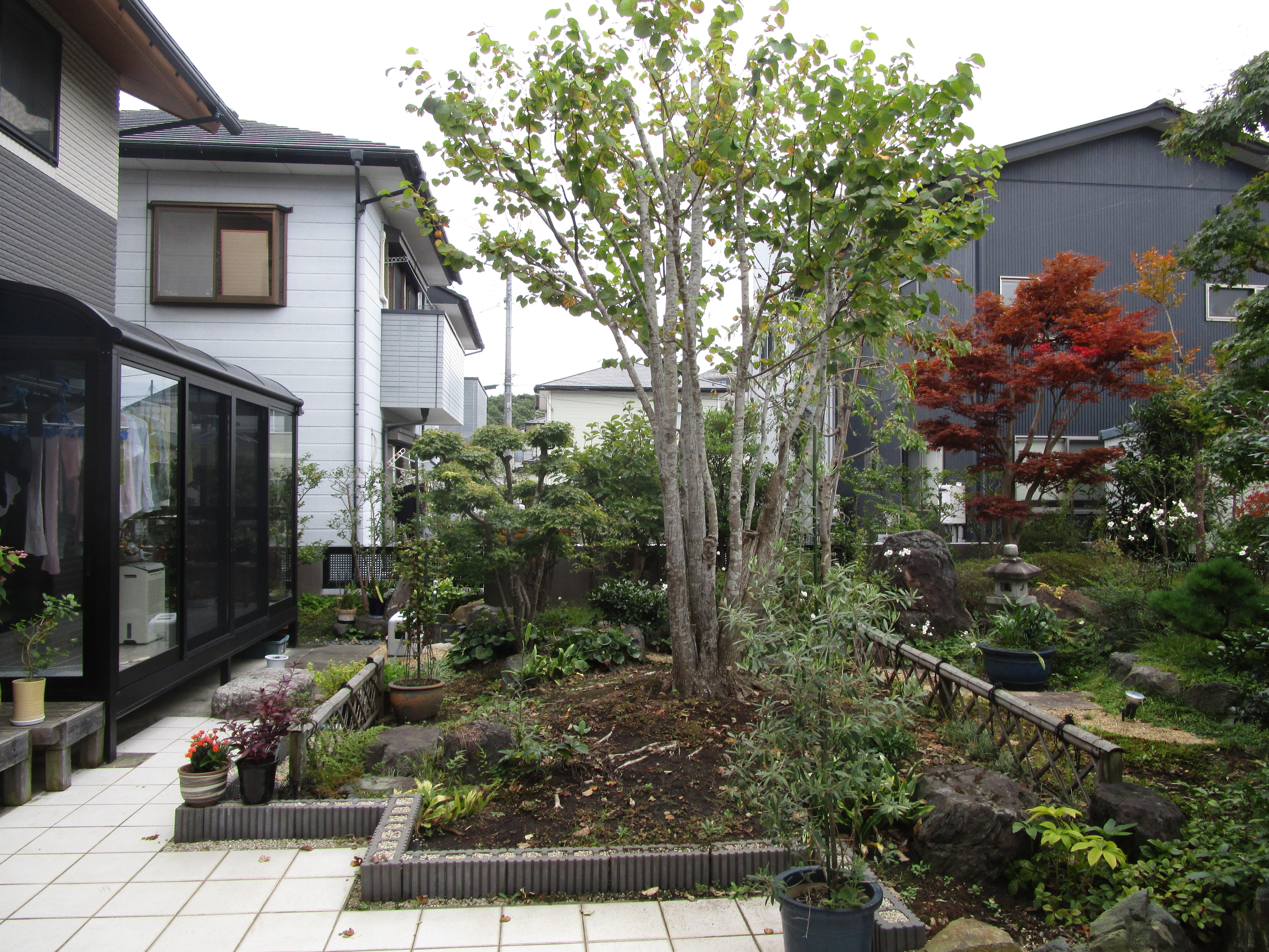 お気に入りの樹木を活かしながら有効スペースを確保しました。 お庭にたくさん植えられていた植栽も大幅に減らし、広々とした空間を作りました。 和と洋を組み合わせる施工でしたが、お施主様の意向を盛り込んだ納得のリフォームとなりました。