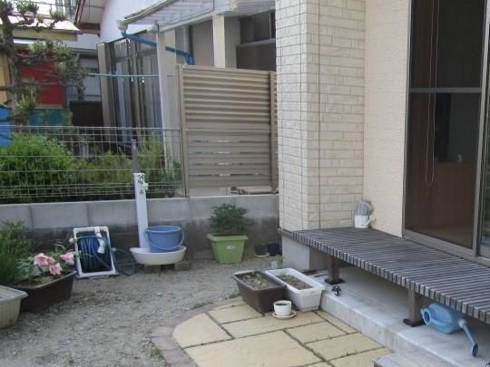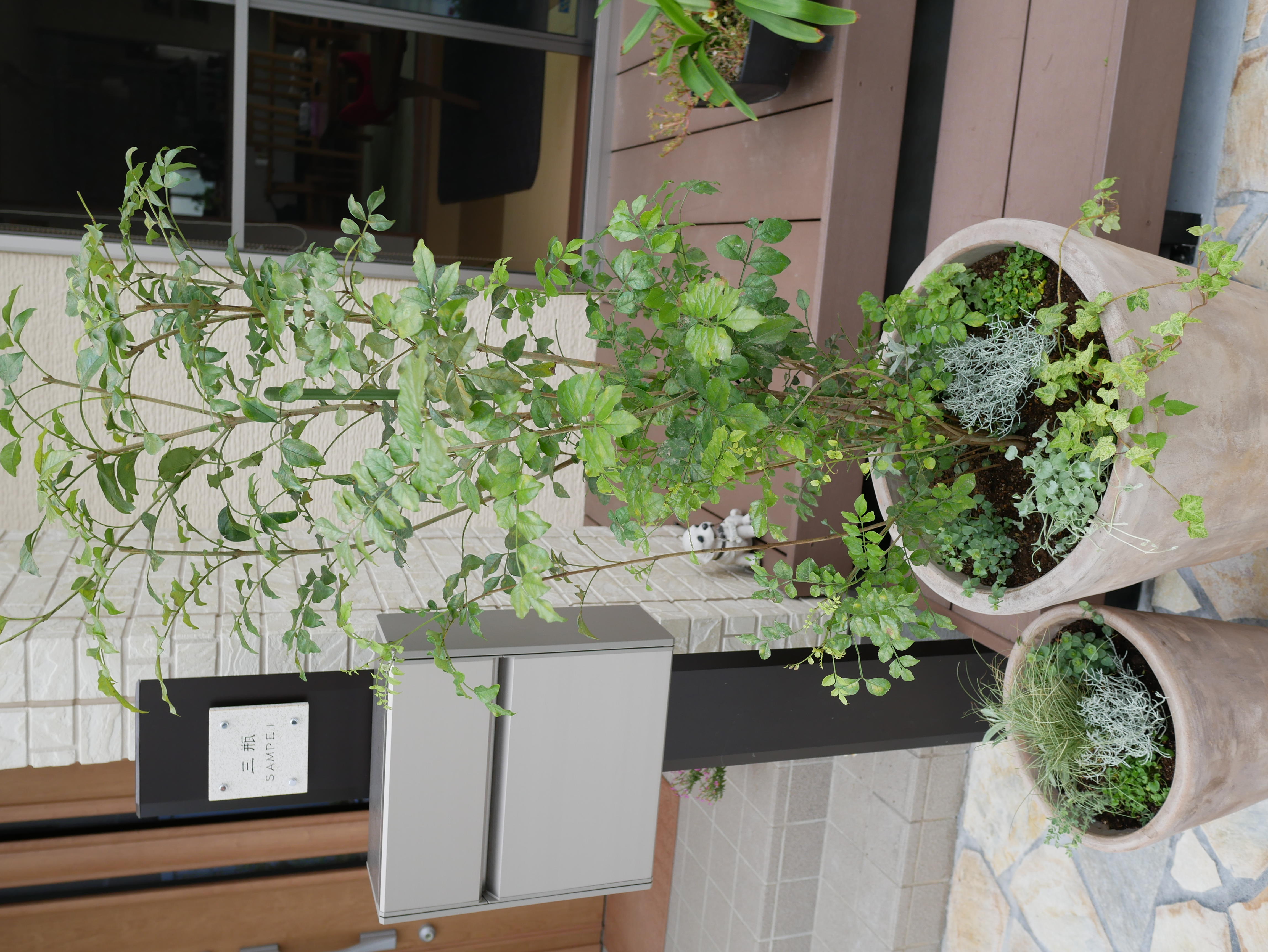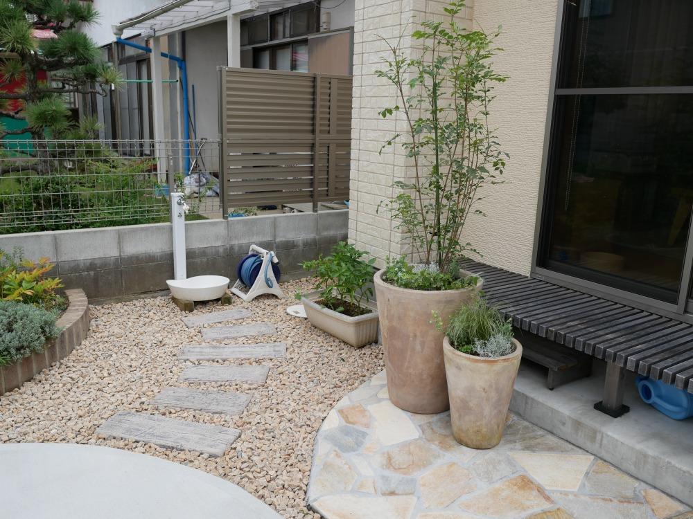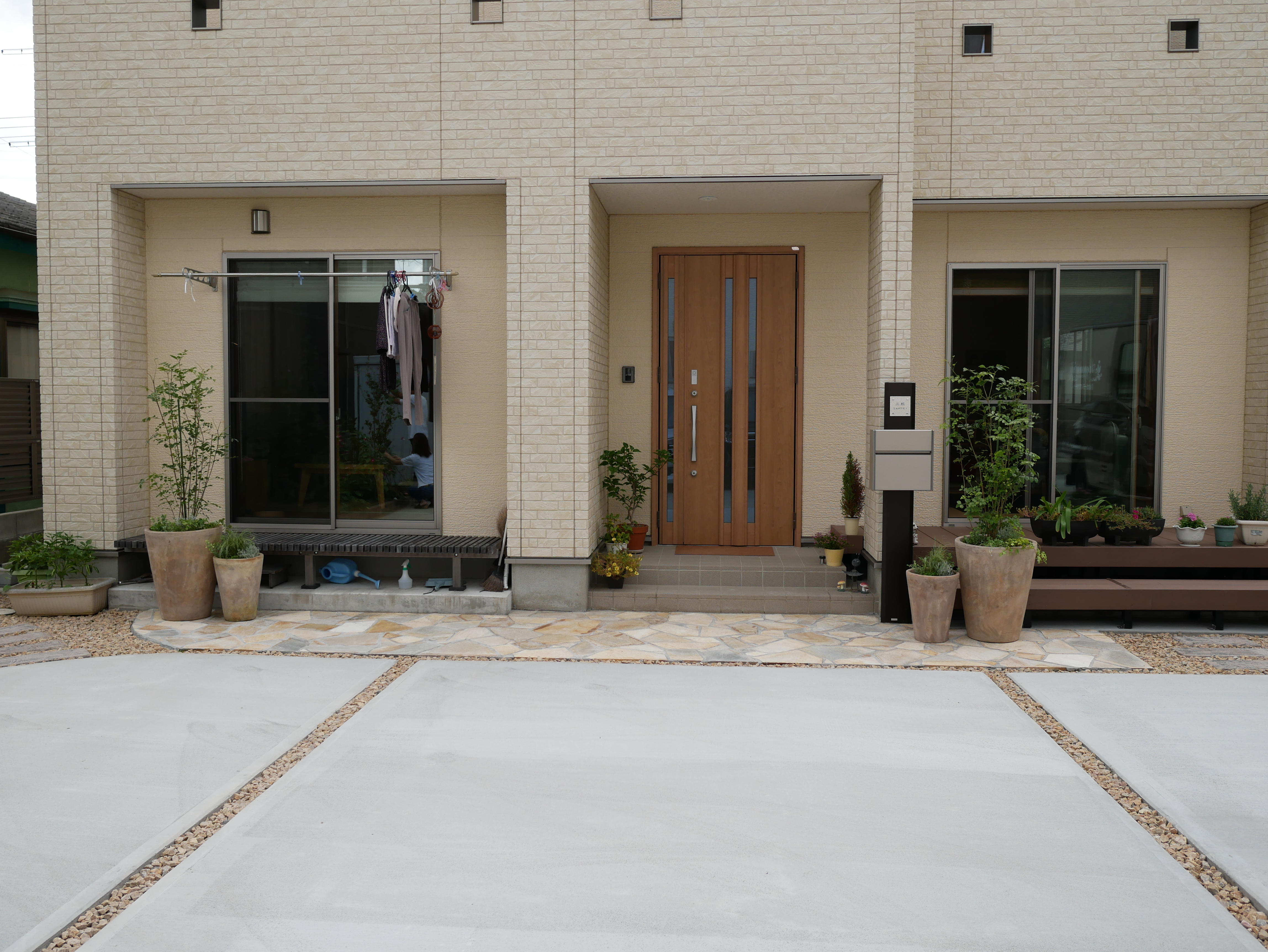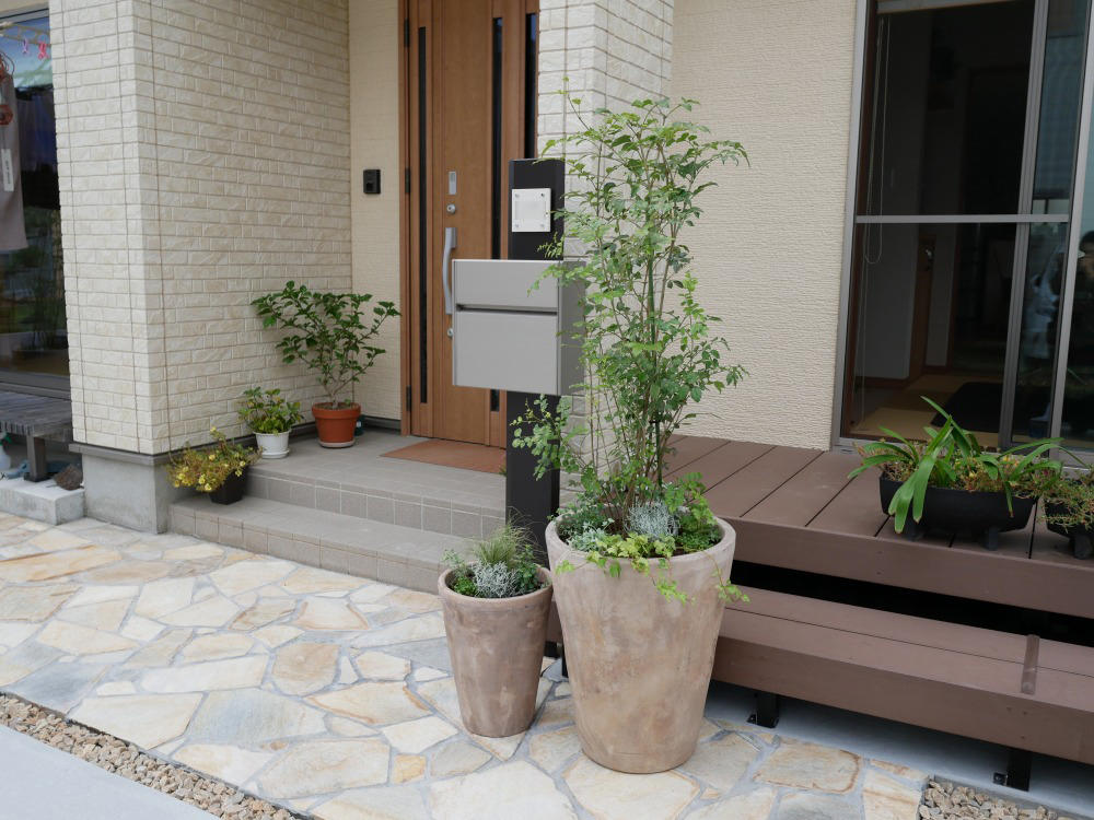 部材とデザインを変更することで全体的にワントーンアップ! 石貼りに合うテラコッタのプランター植栽をプラスすることで爽やかな玄関になりました。