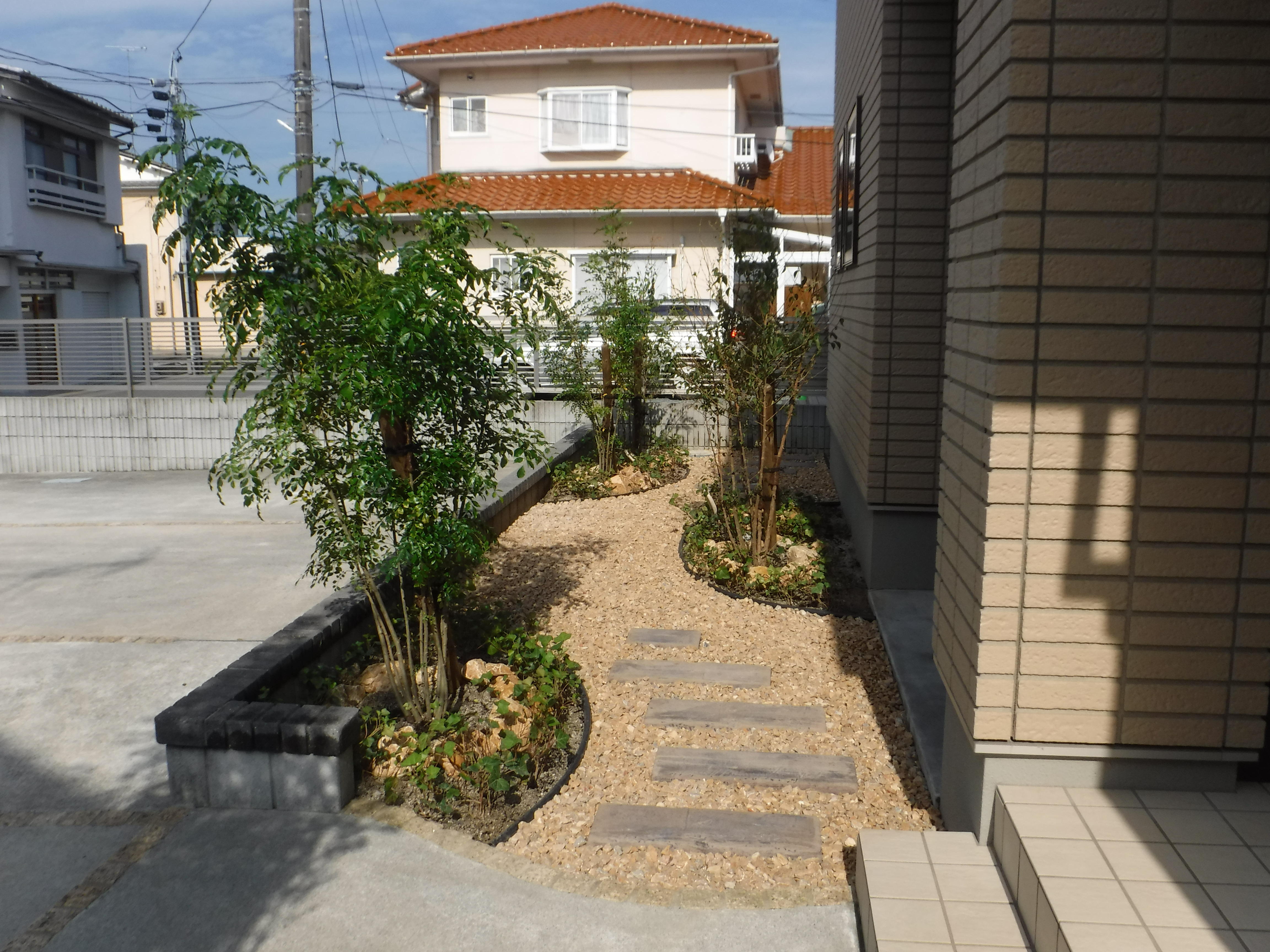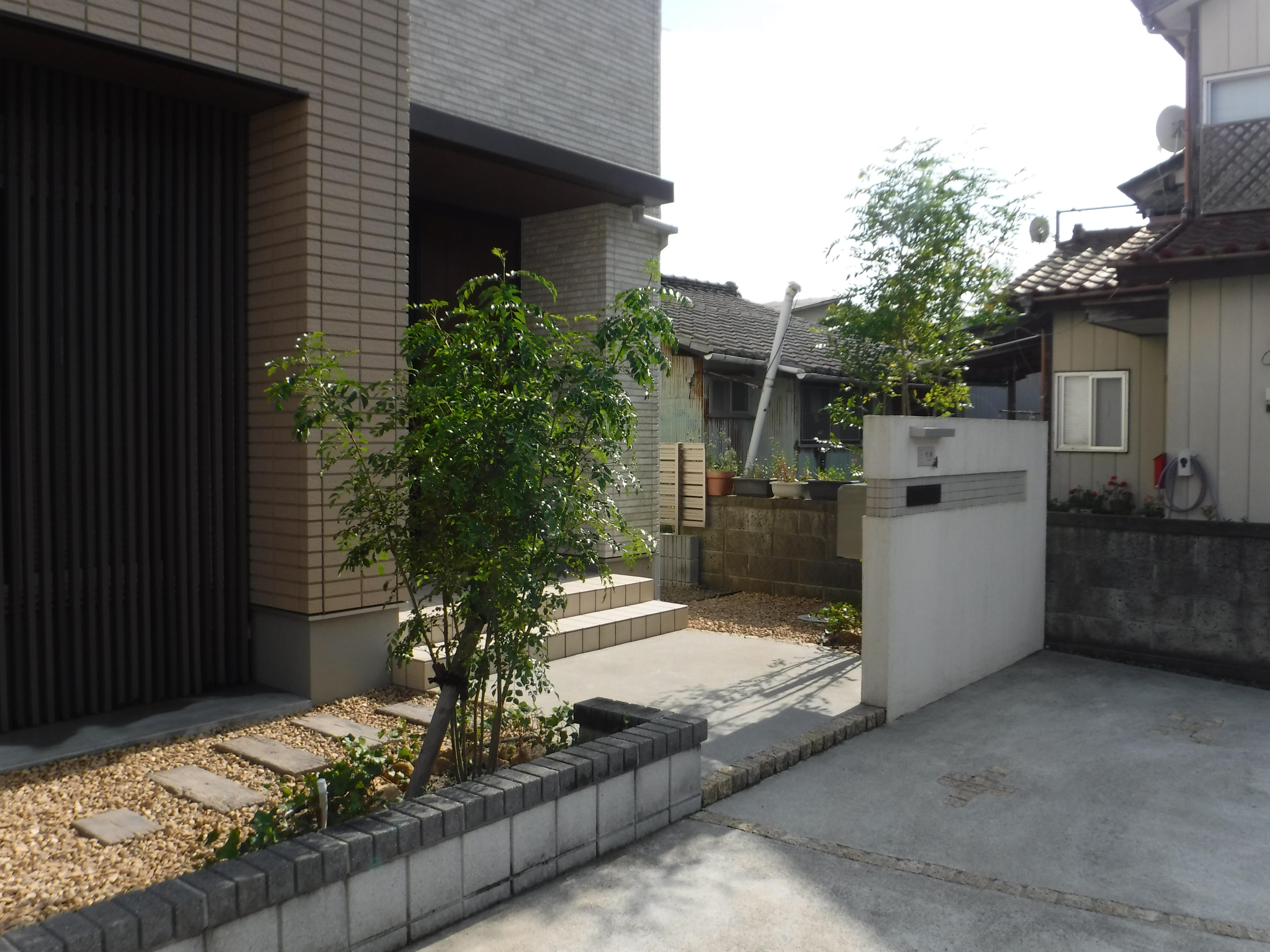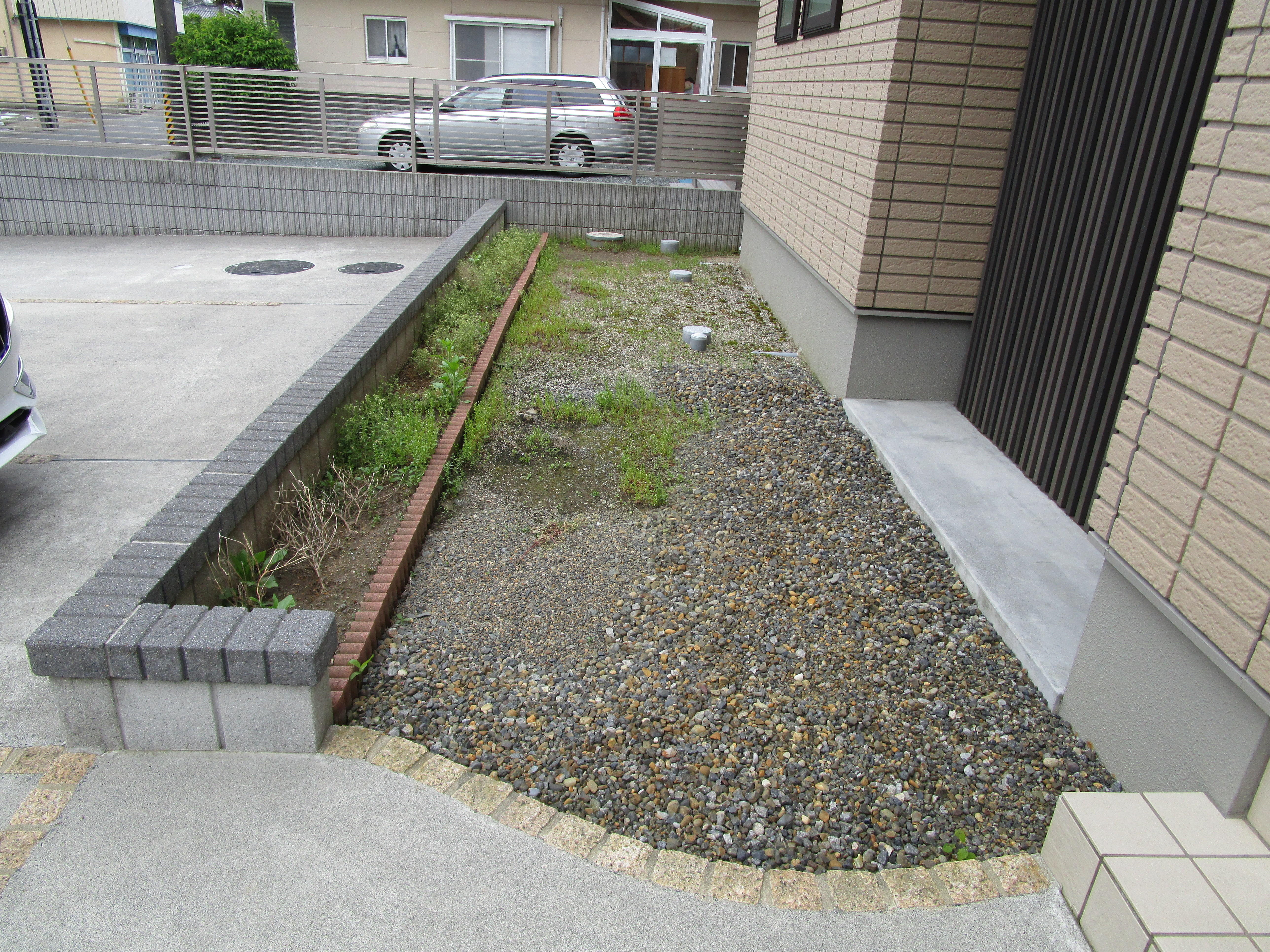 殺風景だった玄関前に植物を植えて爽やかに。 建物の淡い色合いを際立たせ表情豊かに演出するグリーンガーデン。
