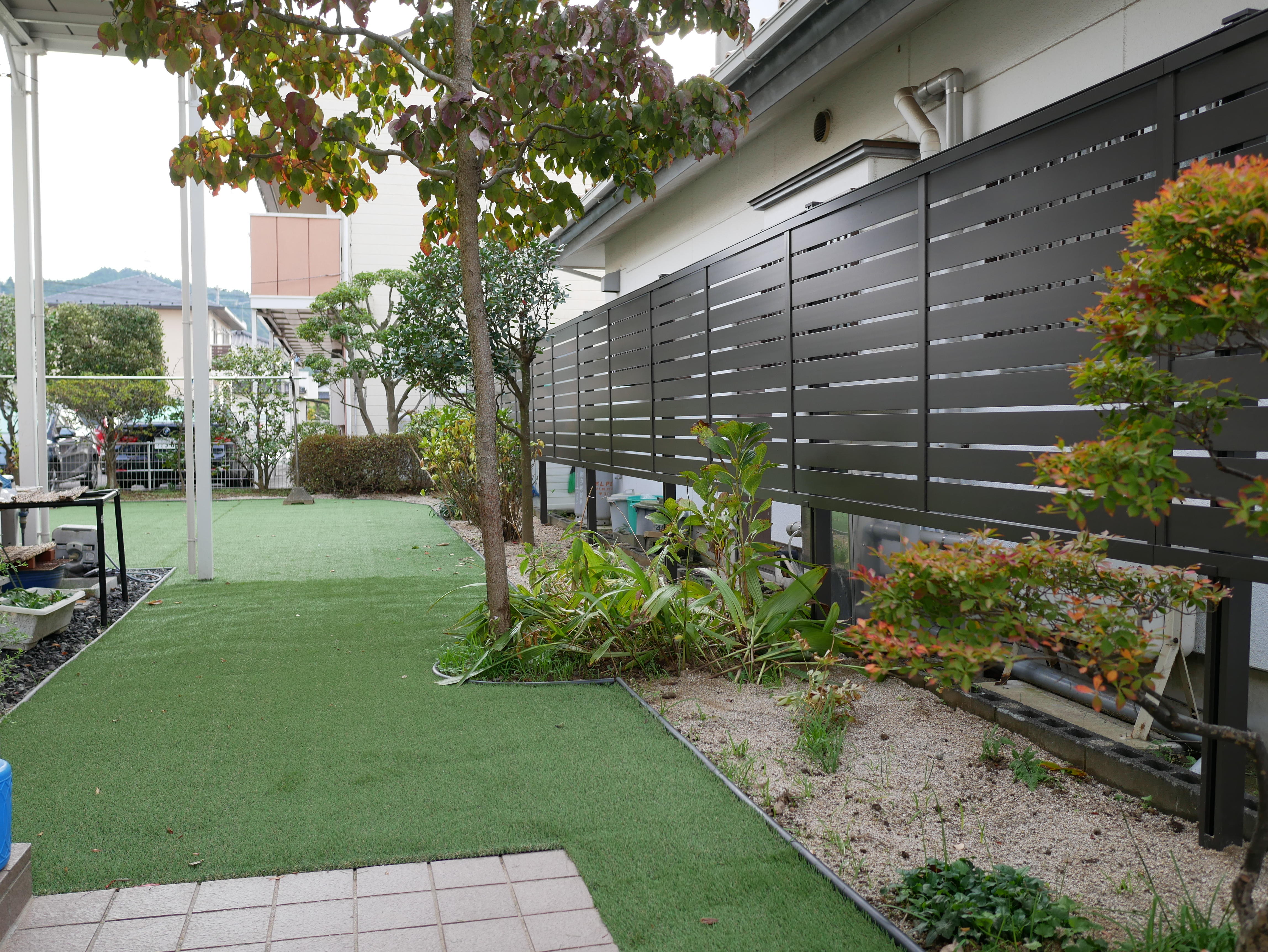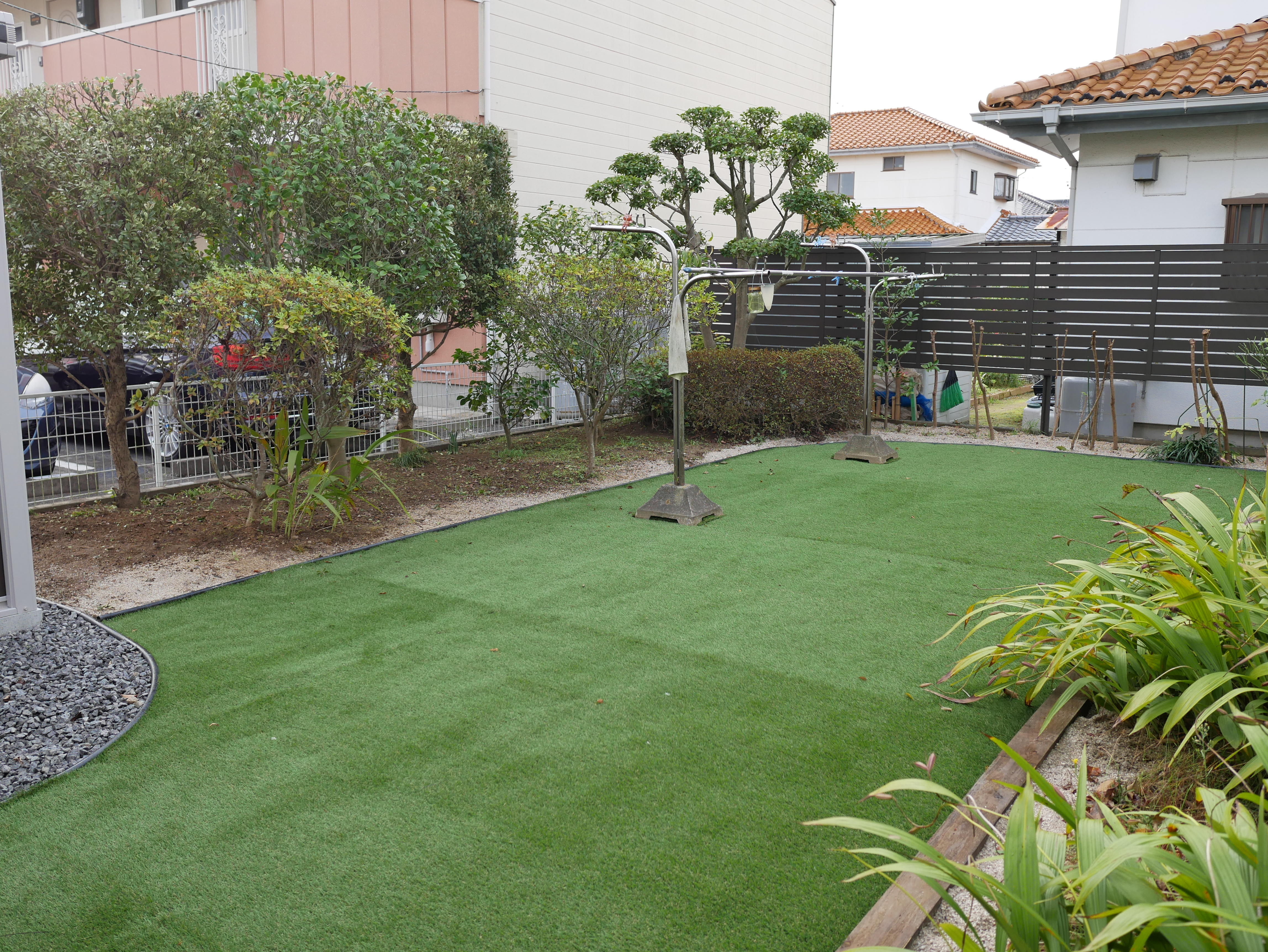 植物に覆われていたお庭から、人工芝を使用した広々空間に変わりました。 お手入れ簡単な快適ガーデンライフの始まりです!