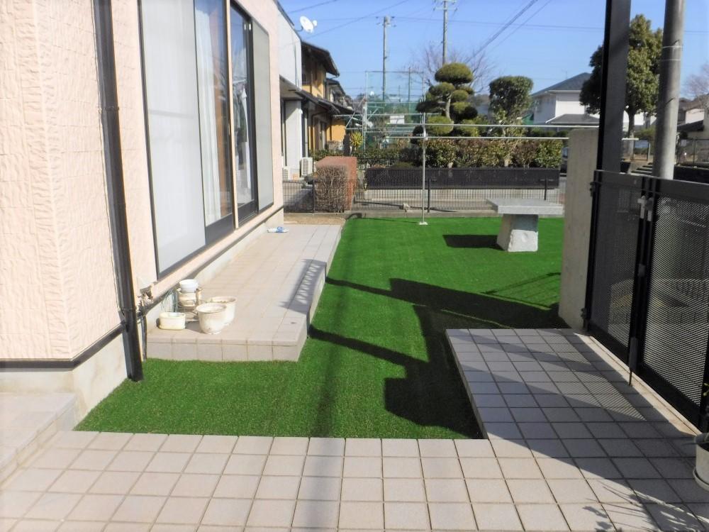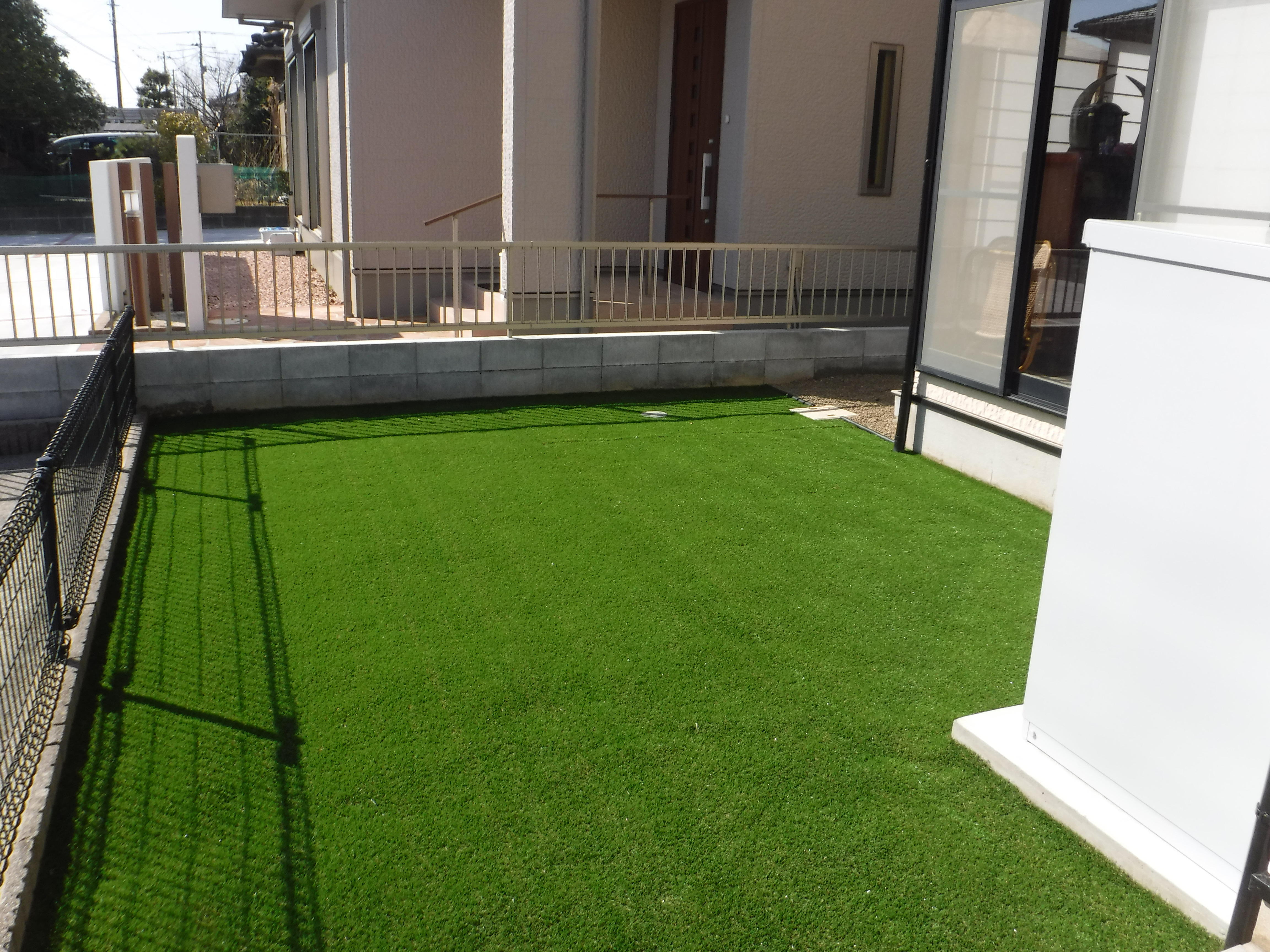 お庭の雑草に悩まされていたお施主様。 思い切って人工芝を採用し、鮮やかな緑が一年中楽しめるフリースペースに大変身。