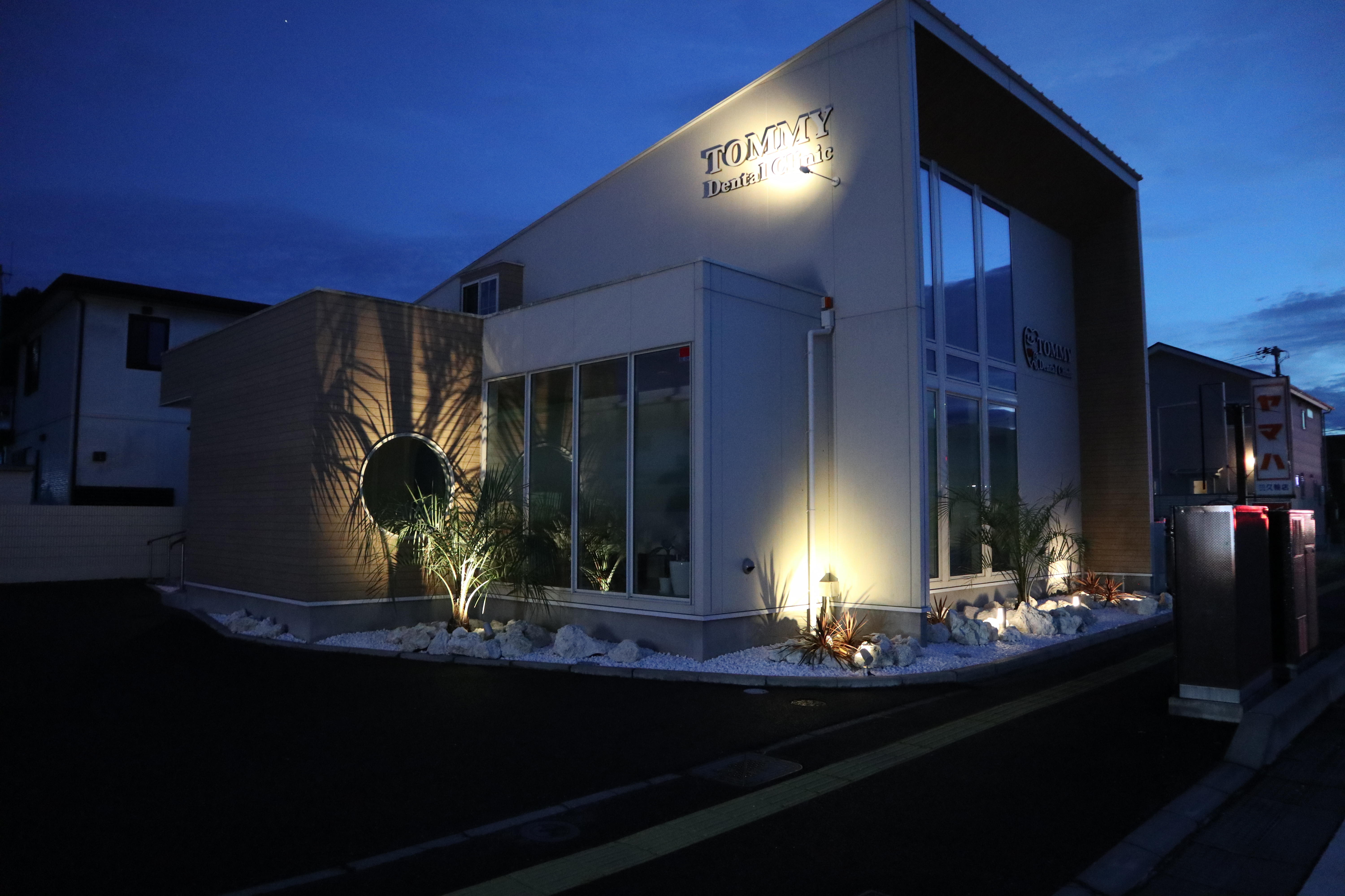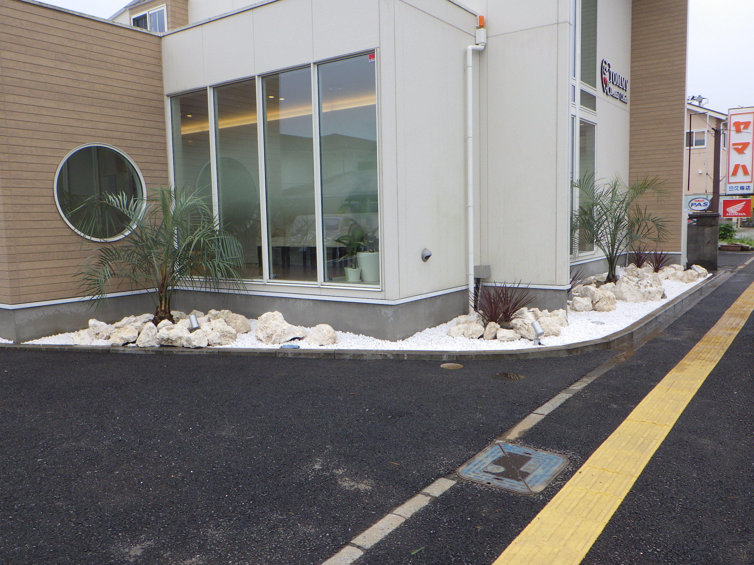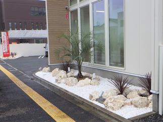 ホワイトカラーに縁取られた歯科クリニック。 植栽と白の化粧砂利で印象がガラリと変わりました。
