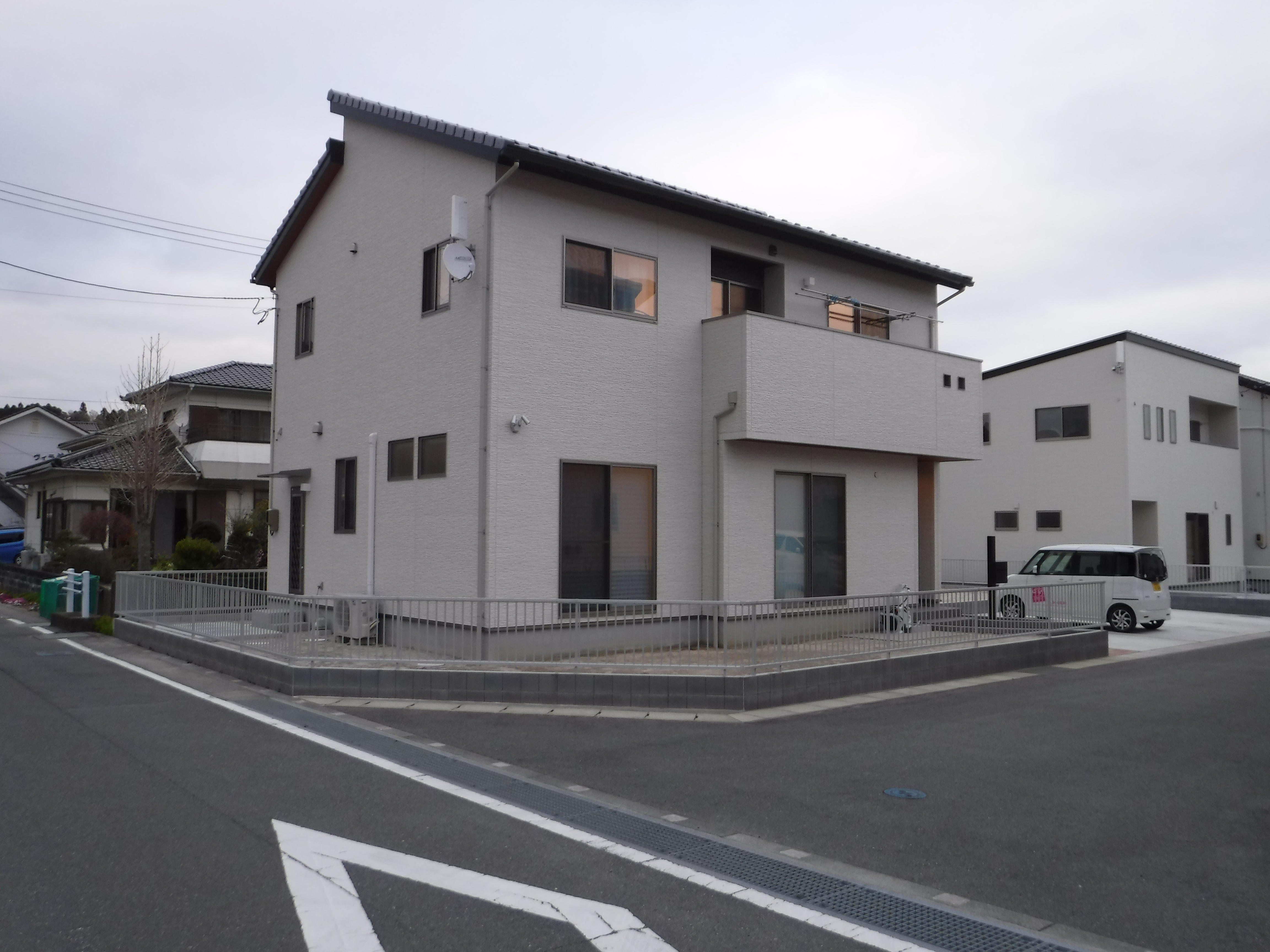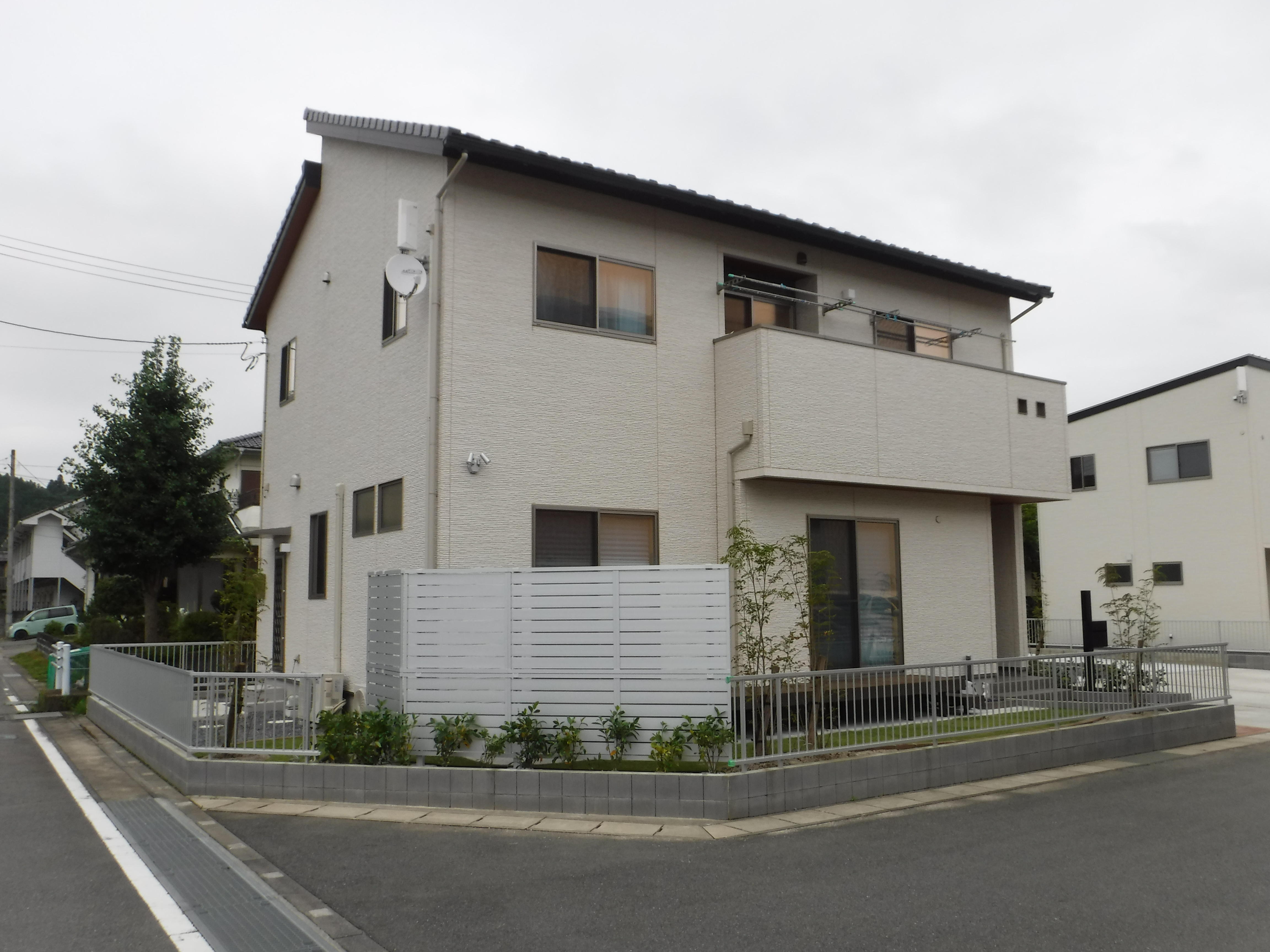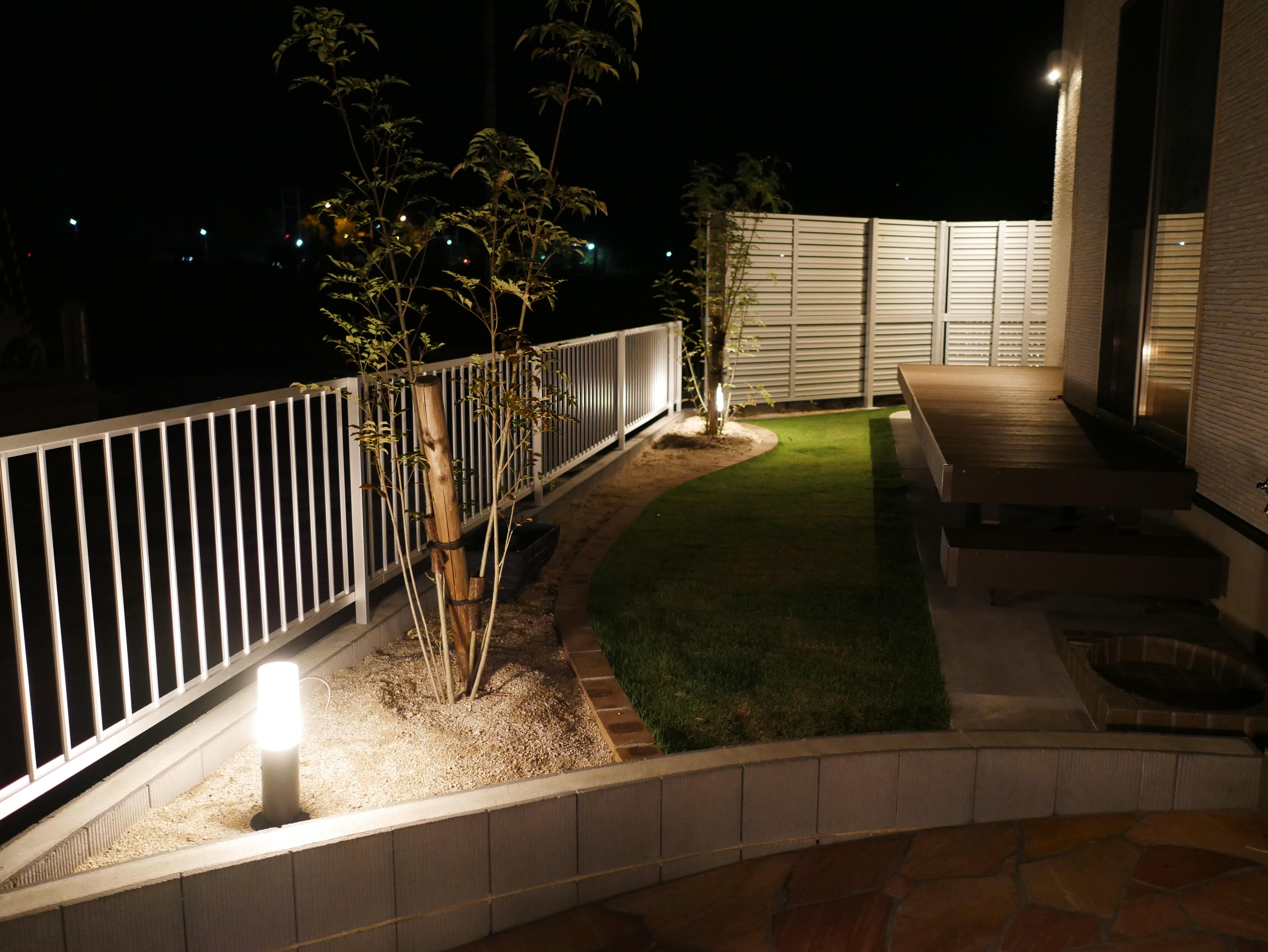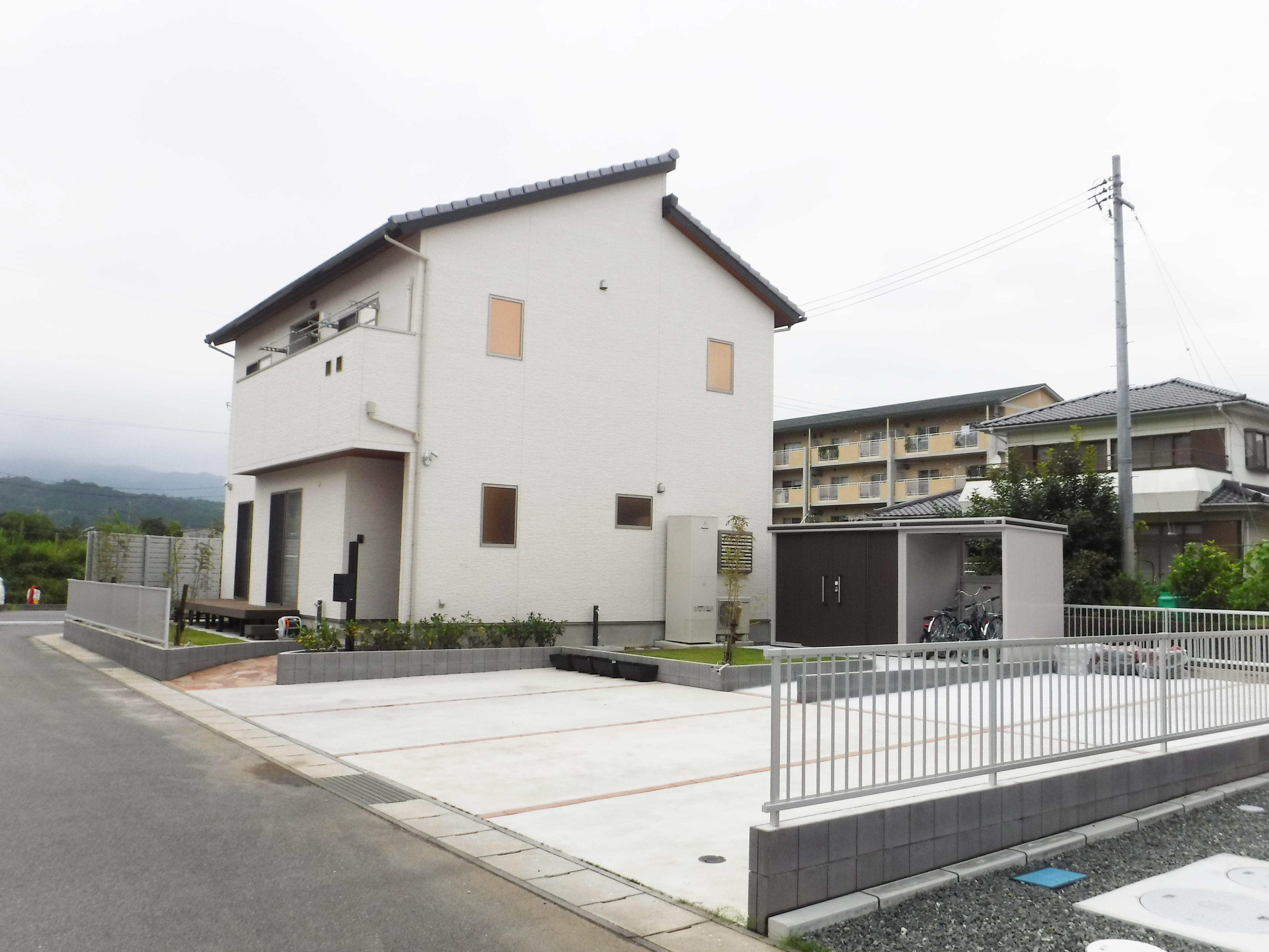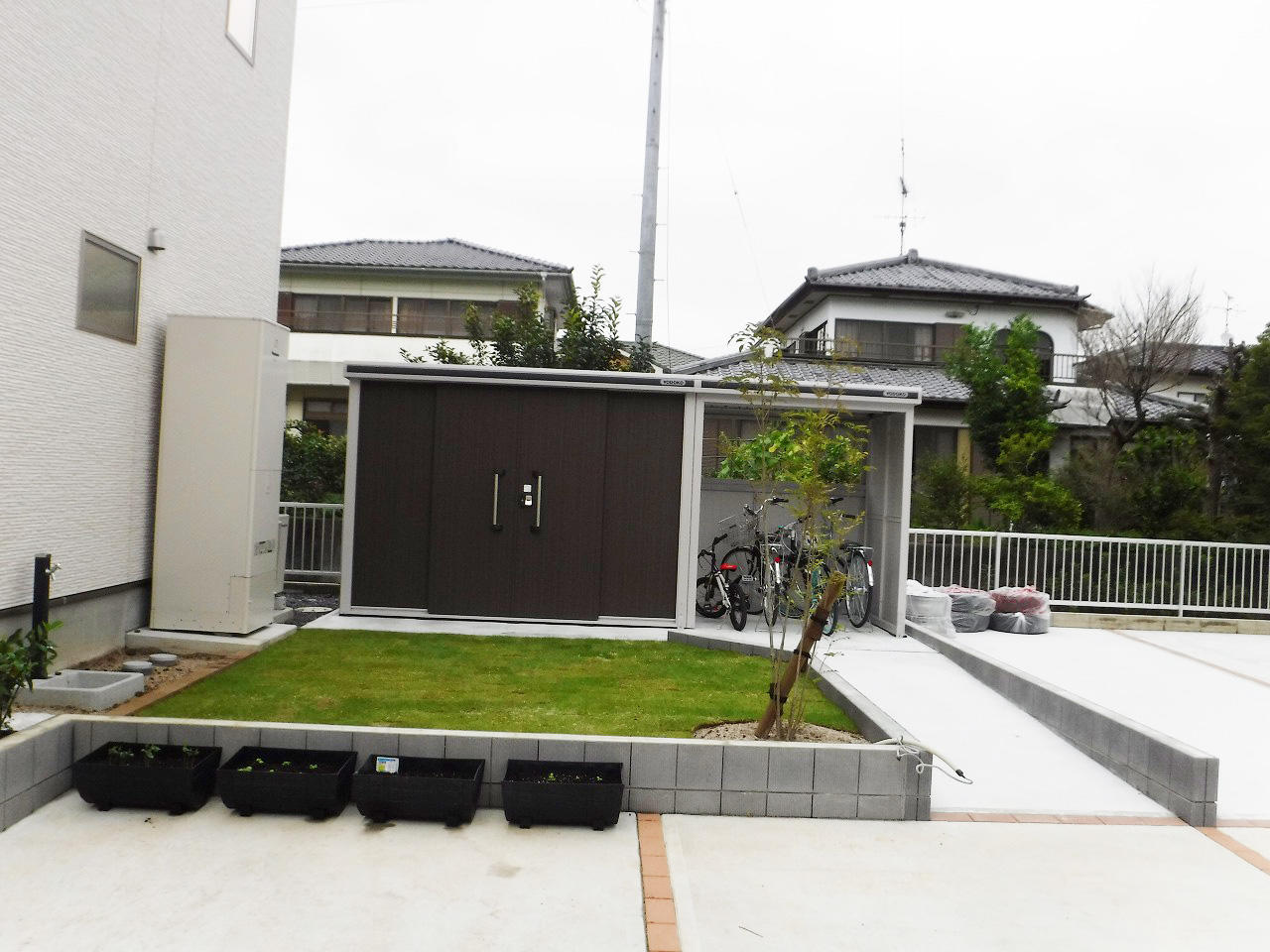 植栽とハイフェンスを組み合わせて道路からの視線をカット。 物置やウッドデッキを配置し、敷地を最大限に生かした外構にしました。