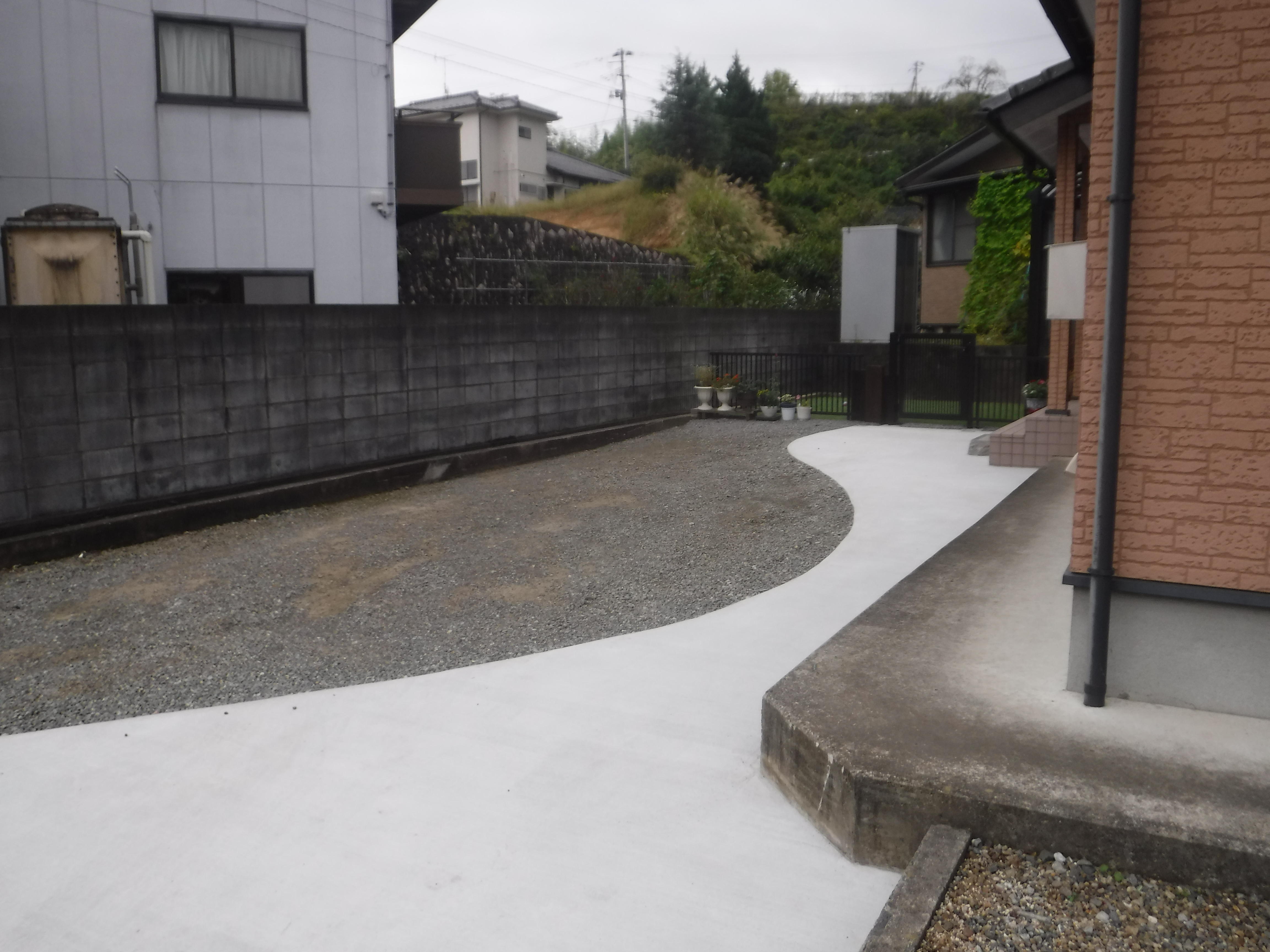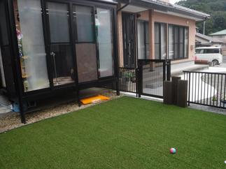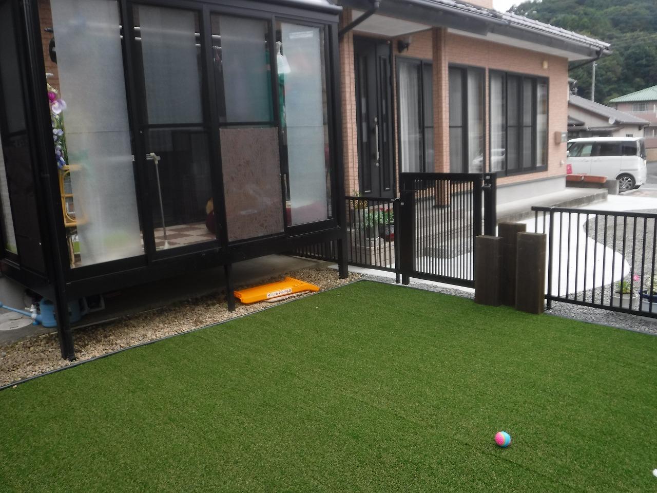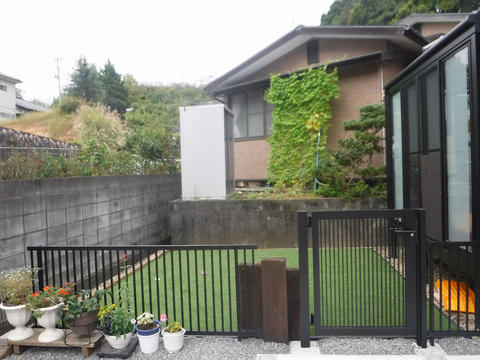 砂利敷きだったお庭を大胆にセパレートし、流線型の土間を流した見た目にも楽しい駐車場に。 また、サンルームの前を整備し、ワンちゃんのためのドッグランを作りました。