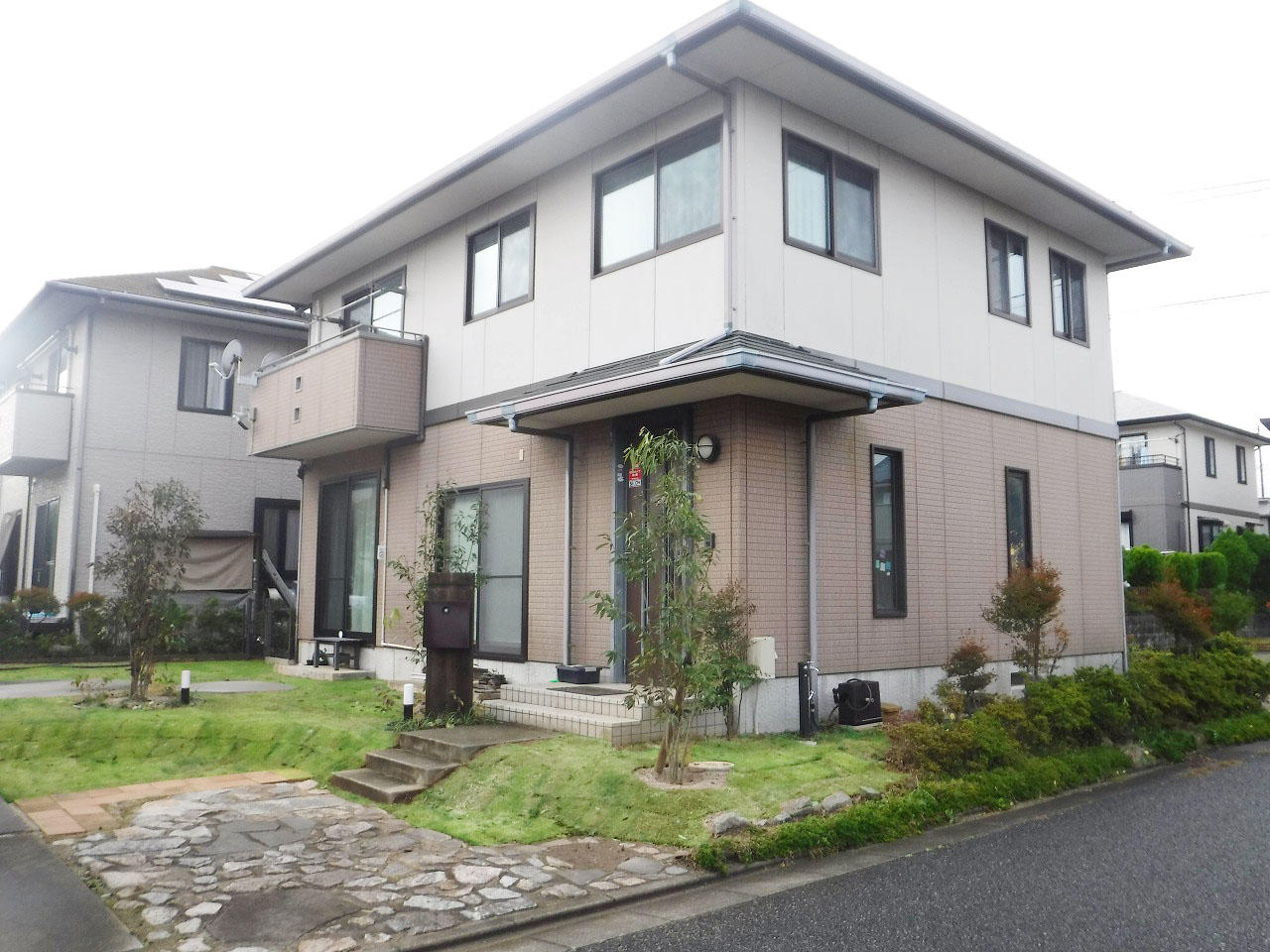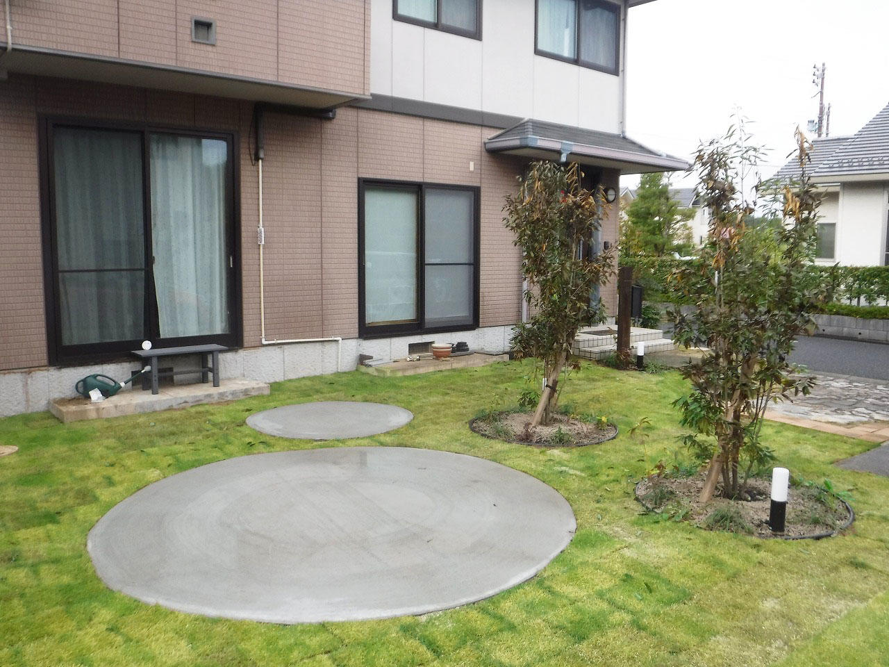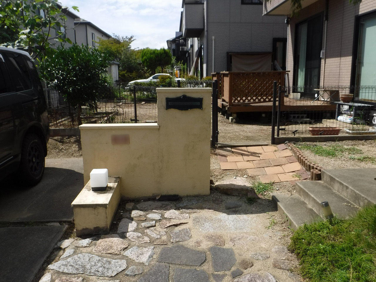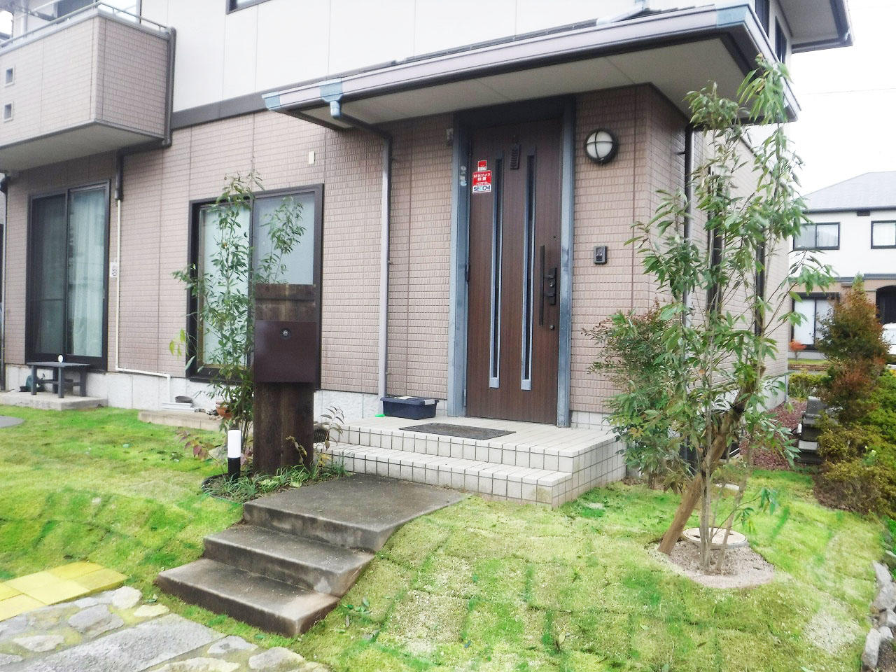 既存の石貼りを活かし、芝生の映えるすっきりとした印象のオープン外構にリフォーム。 枕木門柱と植栽でナチュラルな仕上がりに。
