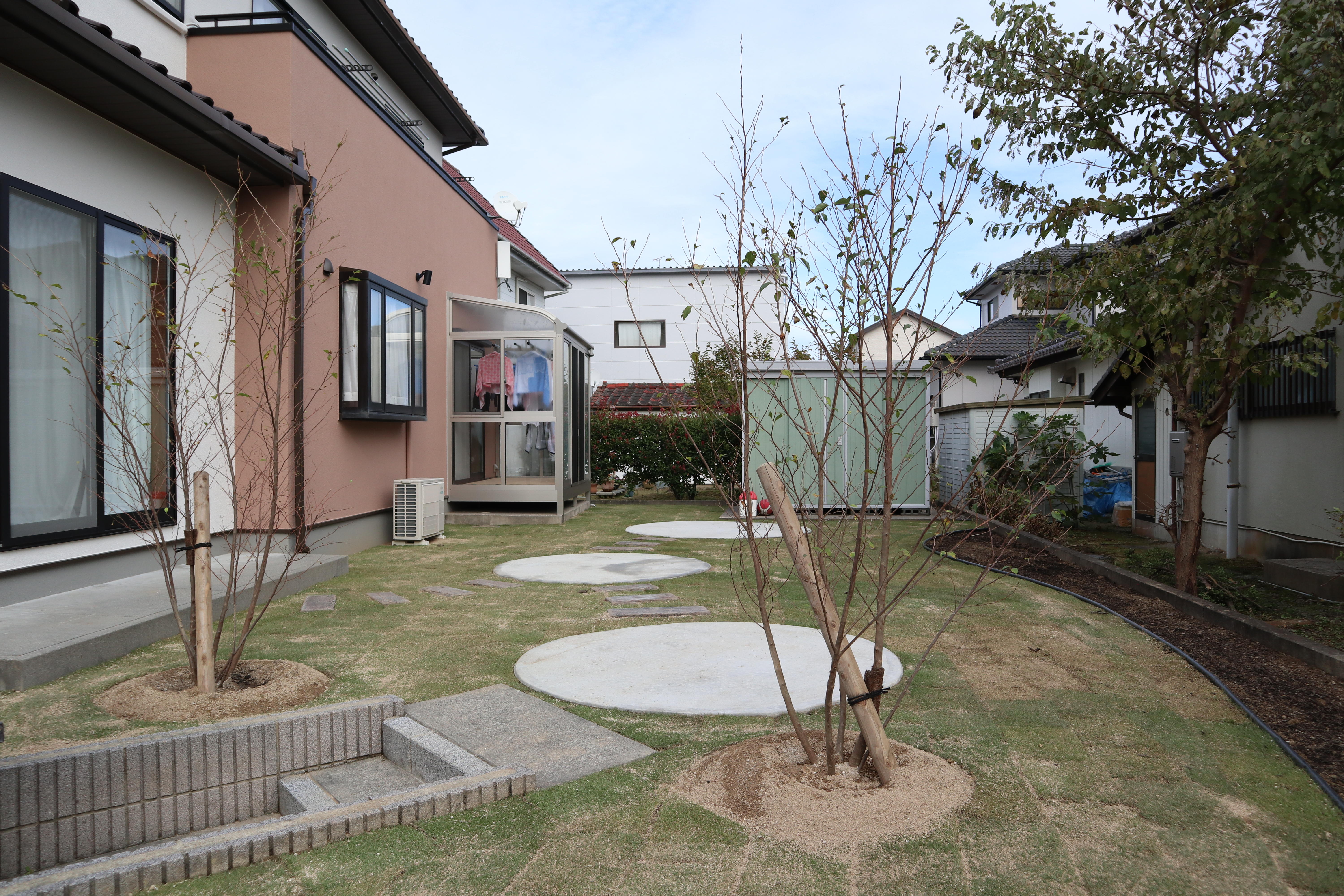 玄関前の生垣を撤去し、新たに植栽を植え直しました。 お庭にはサンルームを設け、雨の日でもお洗濯がはかどるように機能面もアップしました。