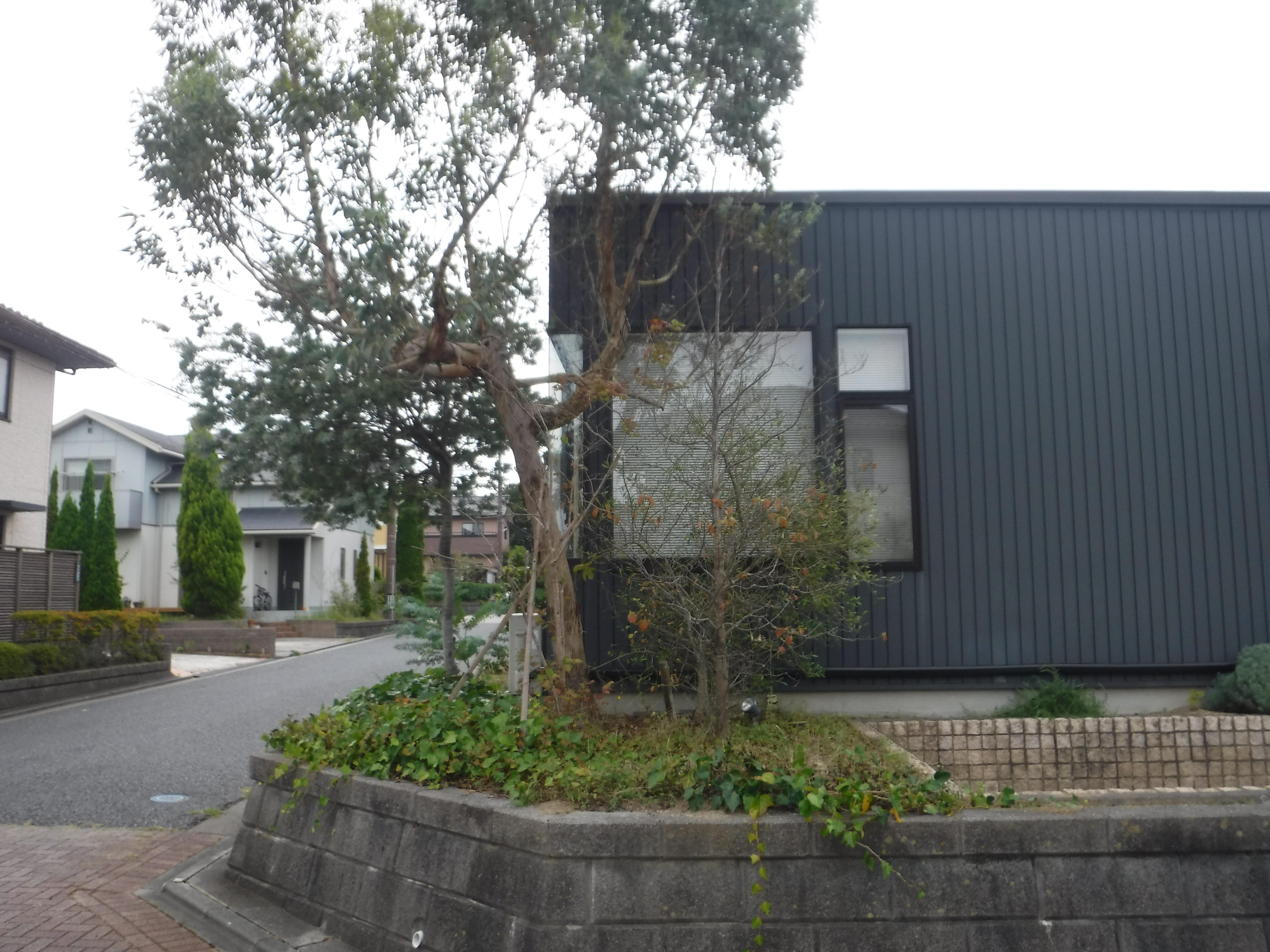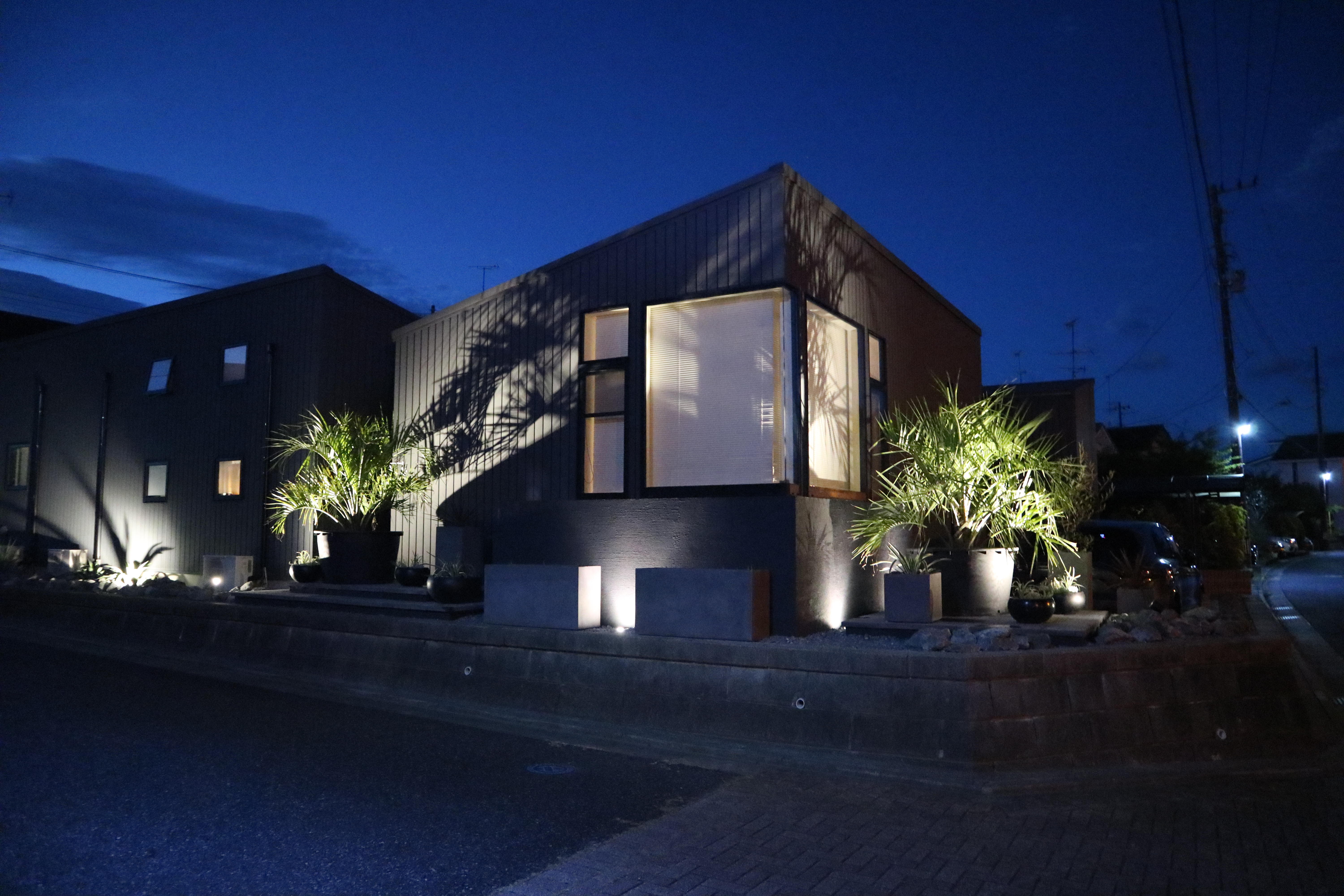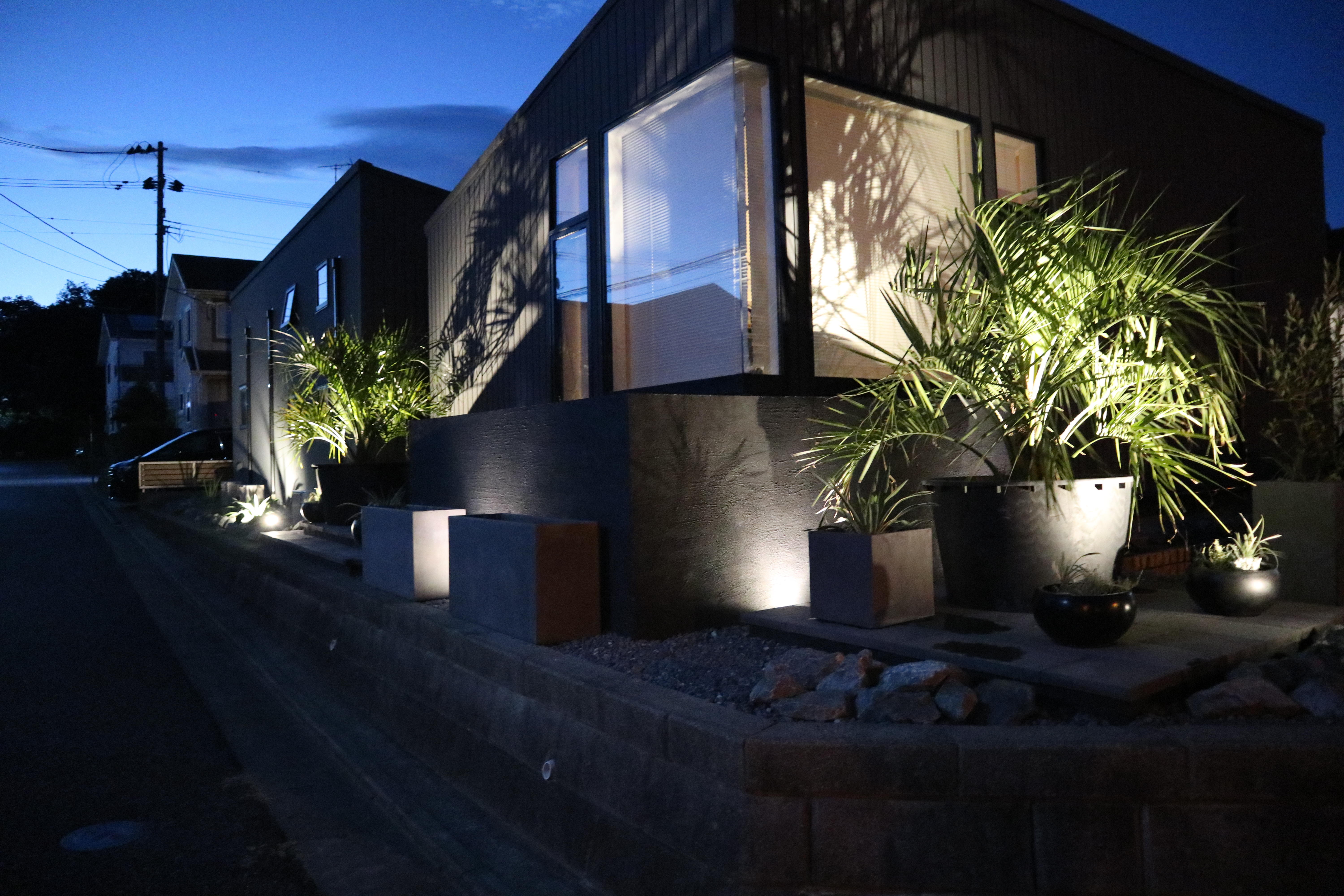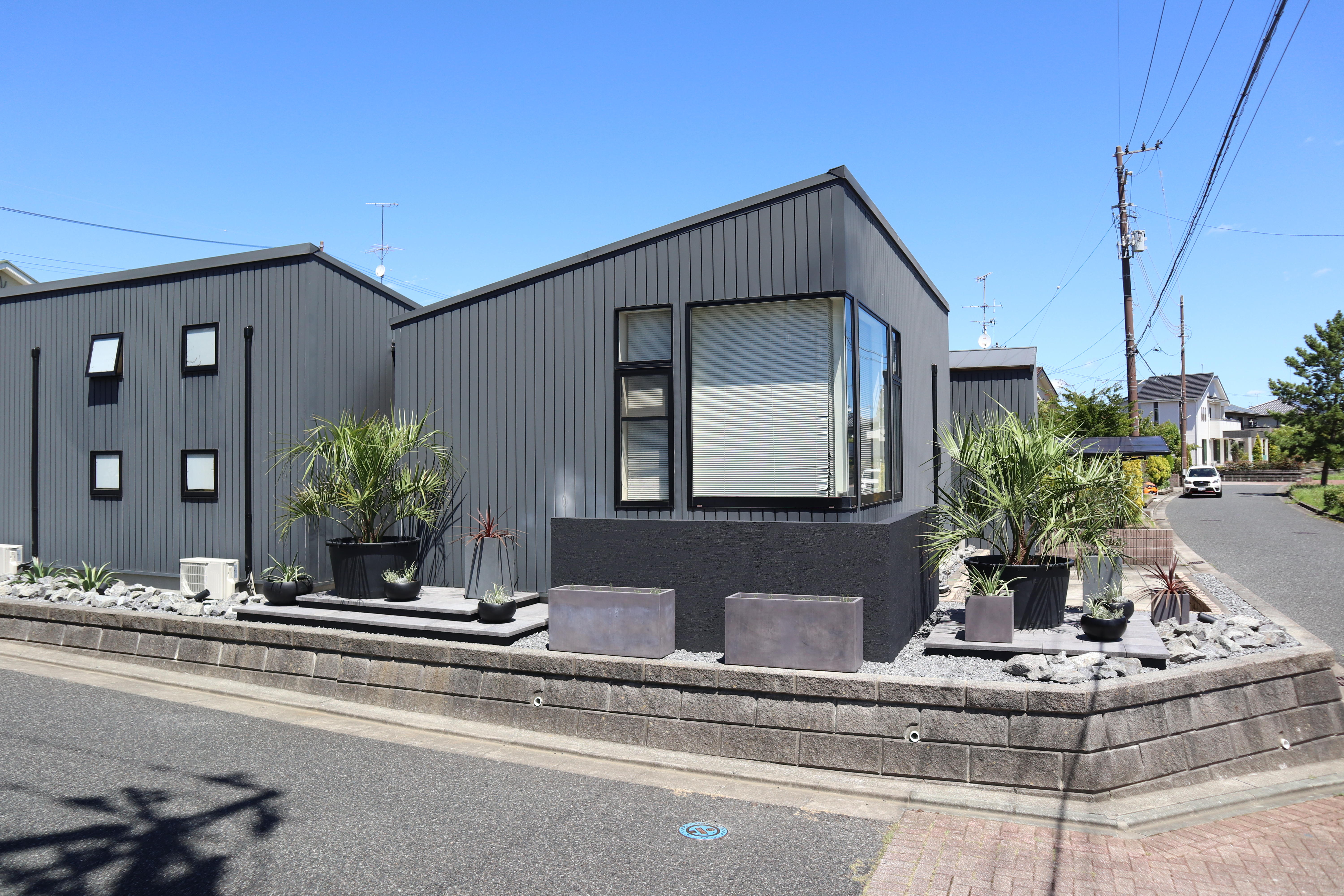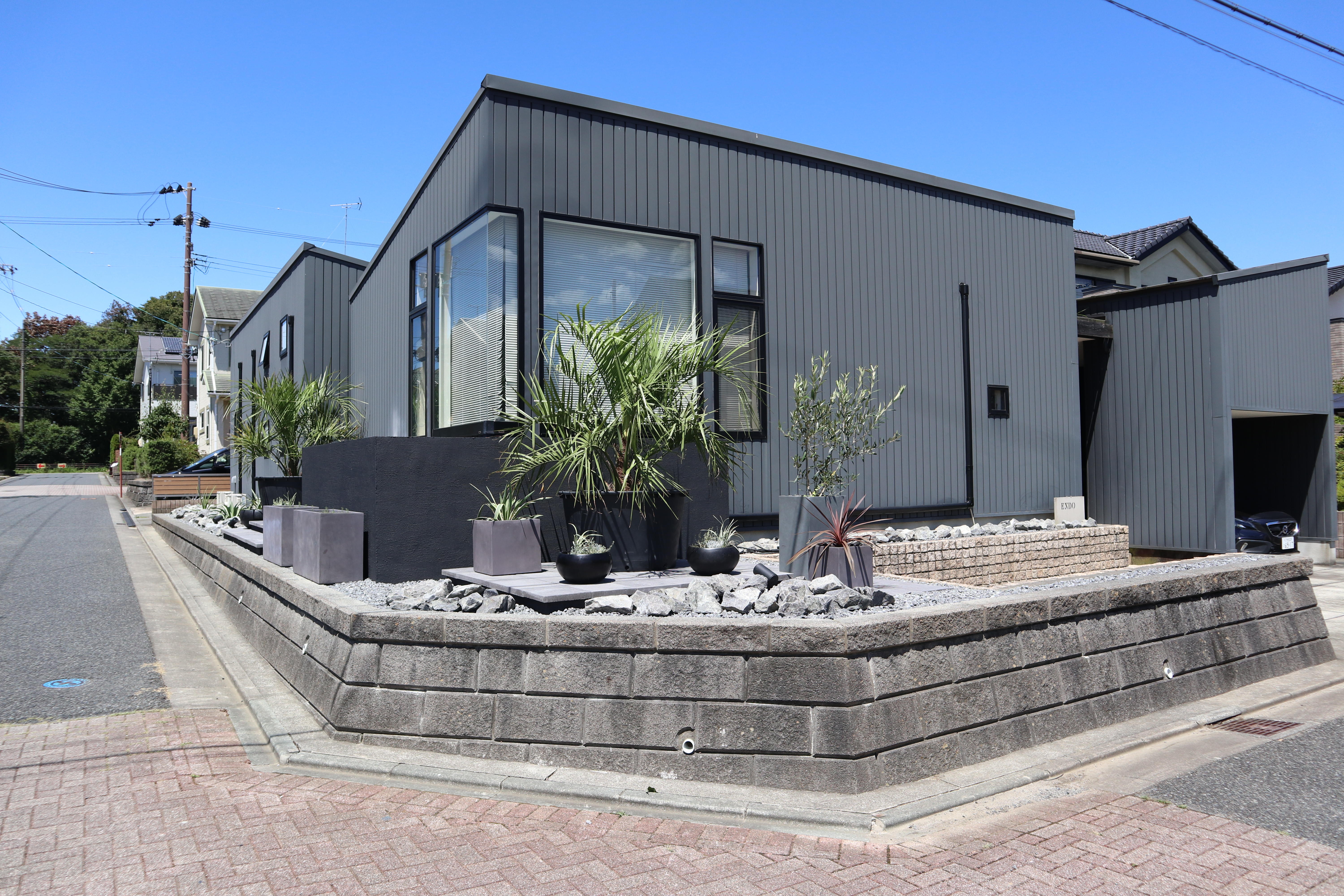 個性的な平屋住宅に合わせて、スタイリッシュなグレーの外構に仕上げました。 ポイントにステップを作り植物を際立たせるデザインに。
