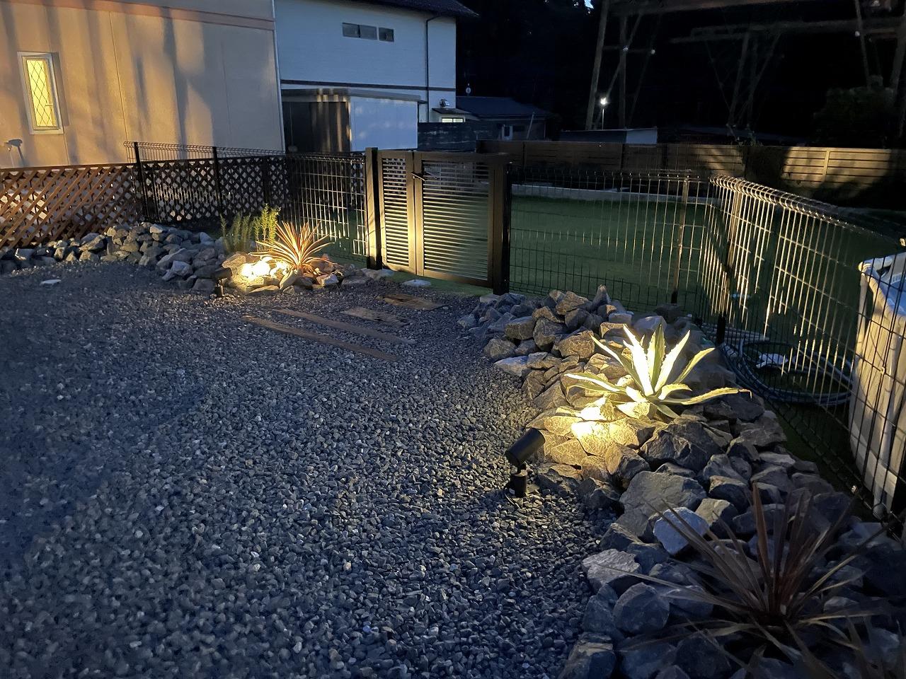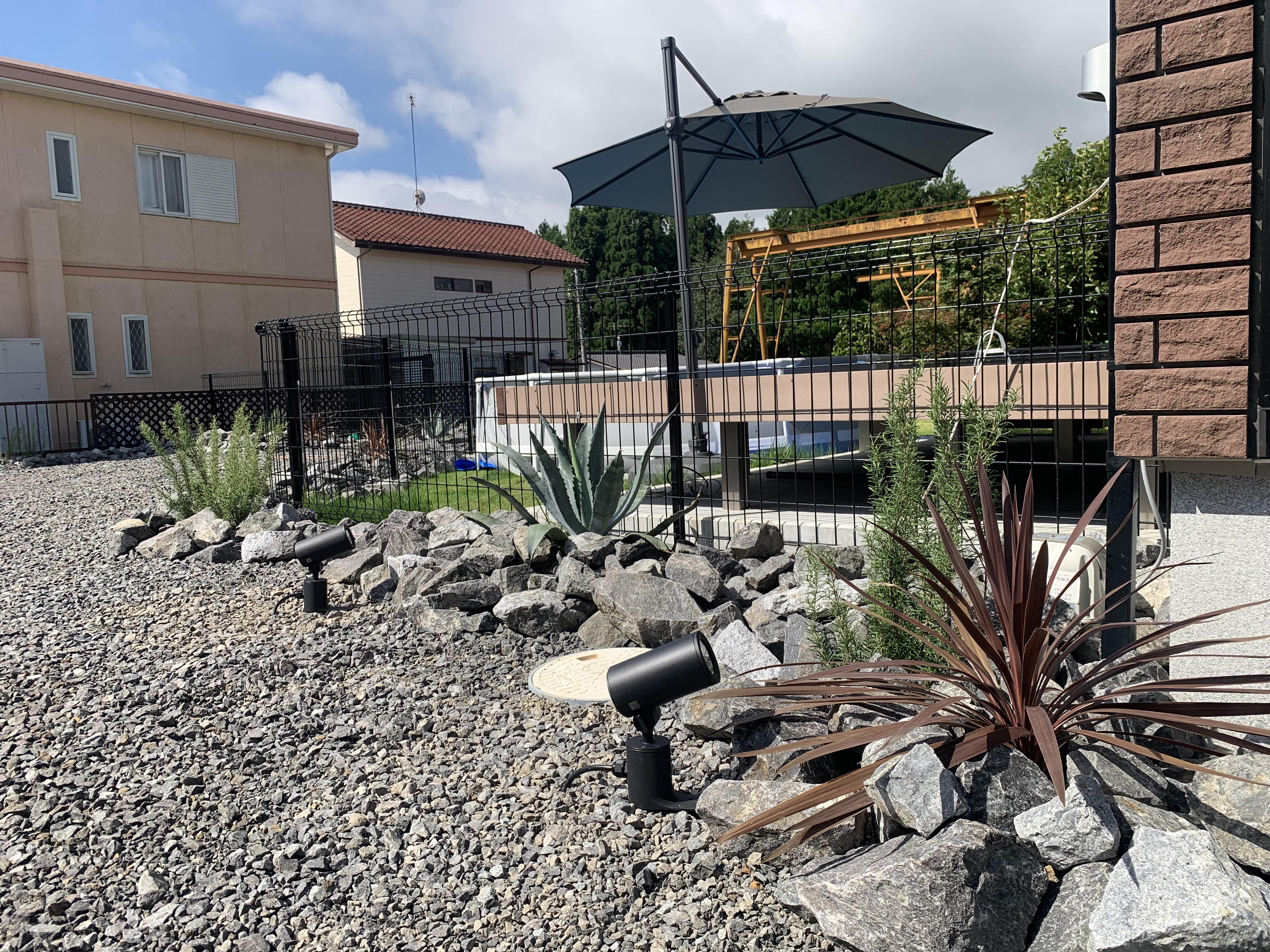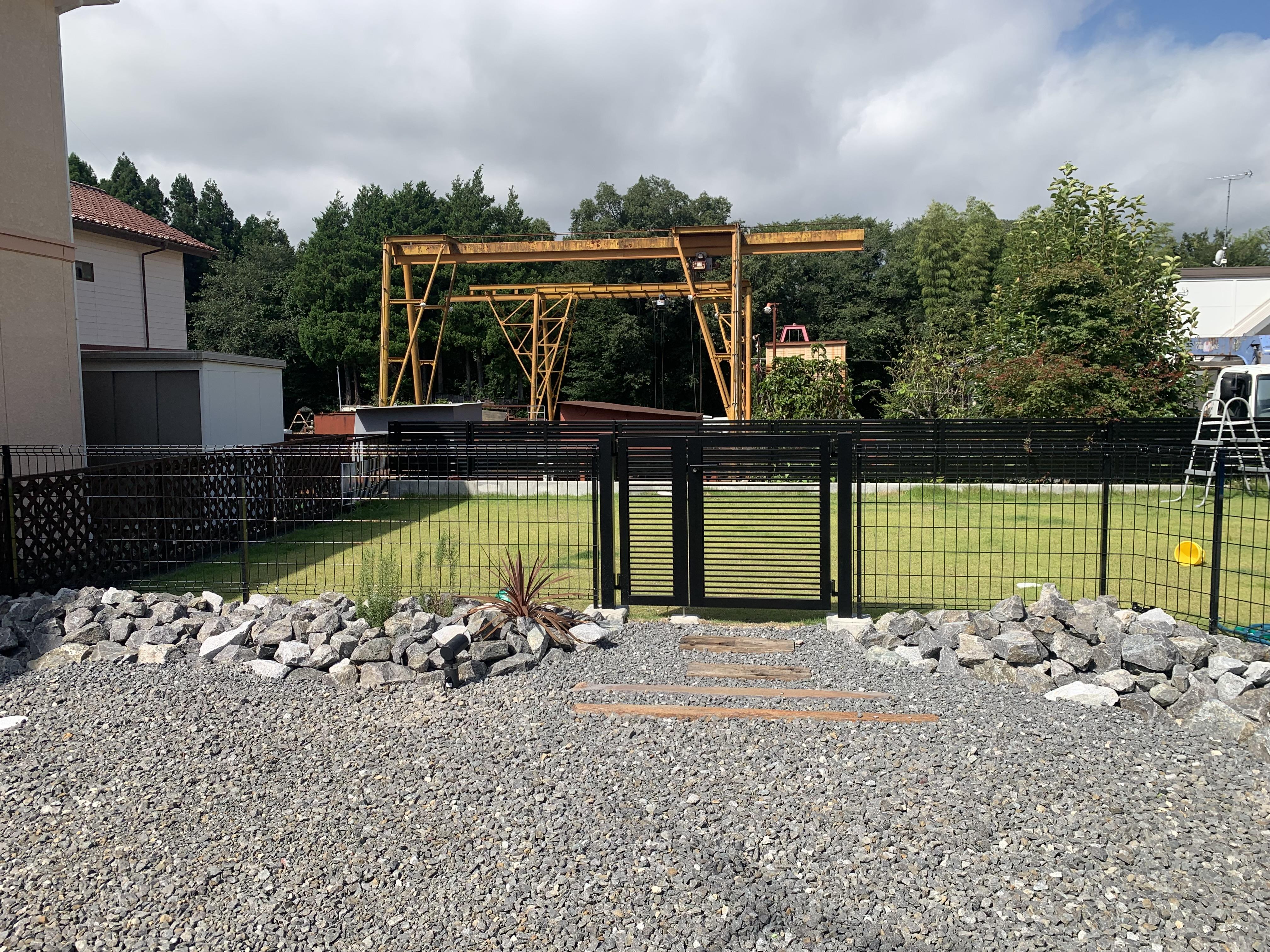 ガーデンロックと植栽でワイルドさをとことん追求したお庭。 既存の芝生やメッシュフェンスとの相性も良く、建物の外観に合うドライガーデンになりました。