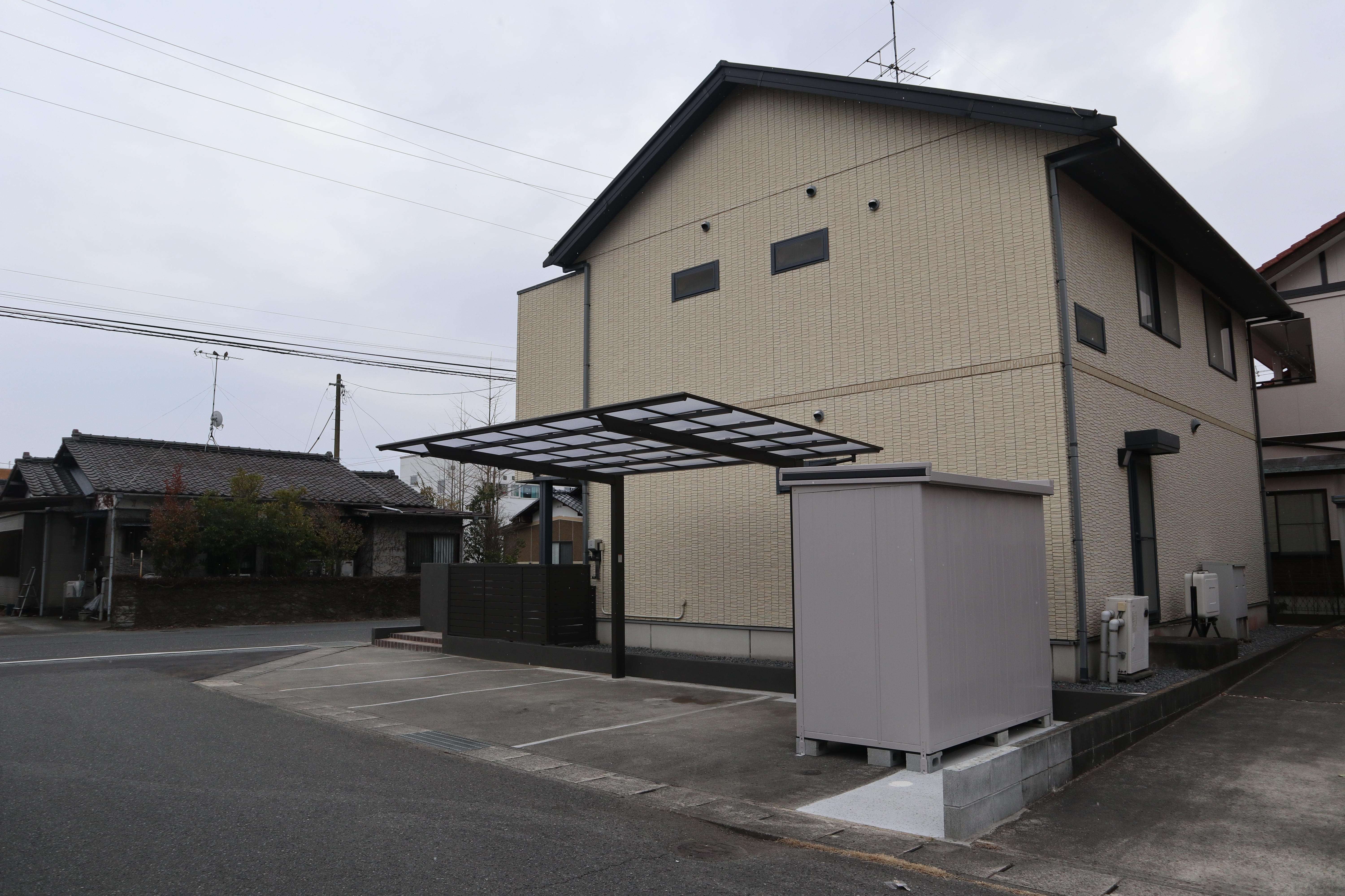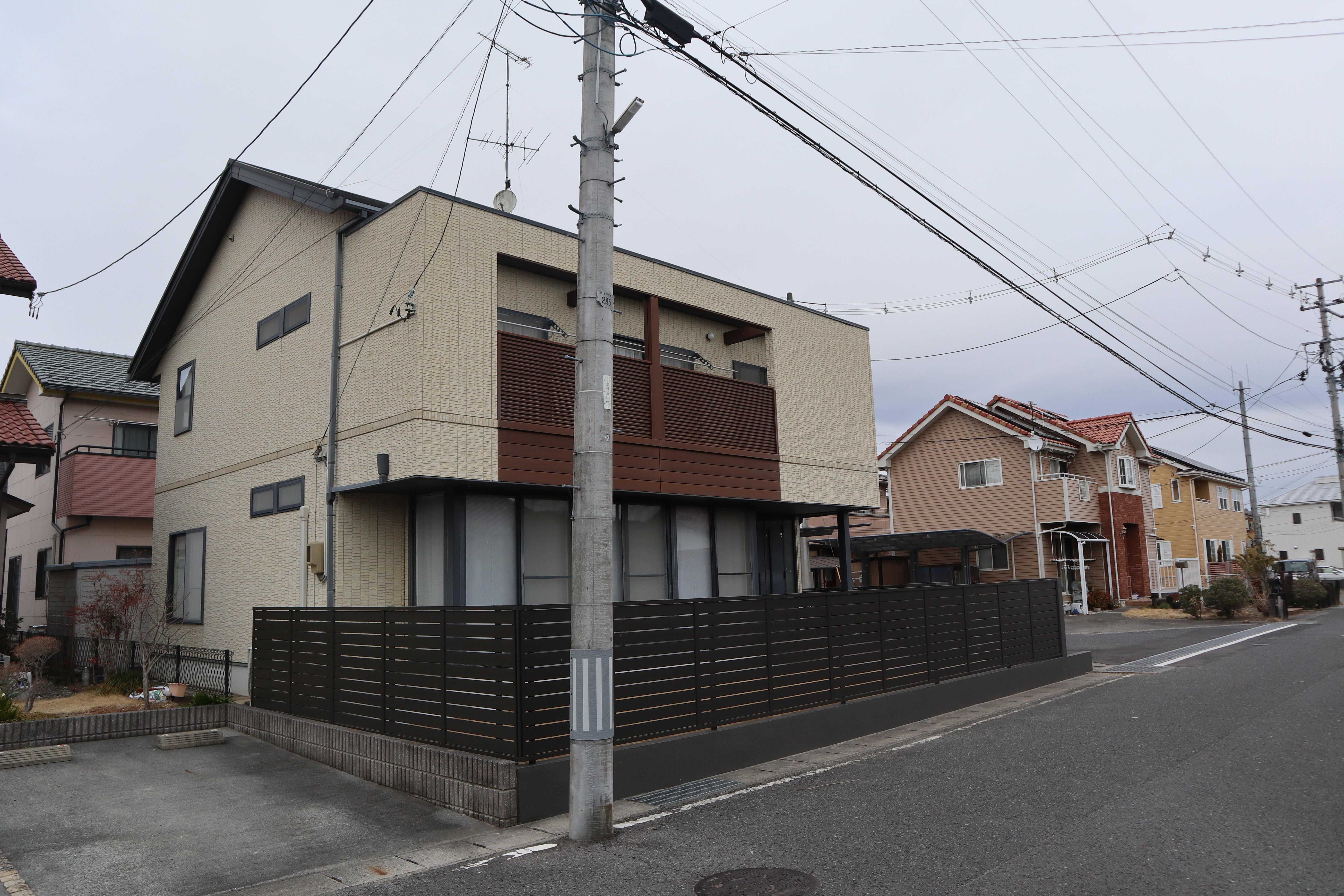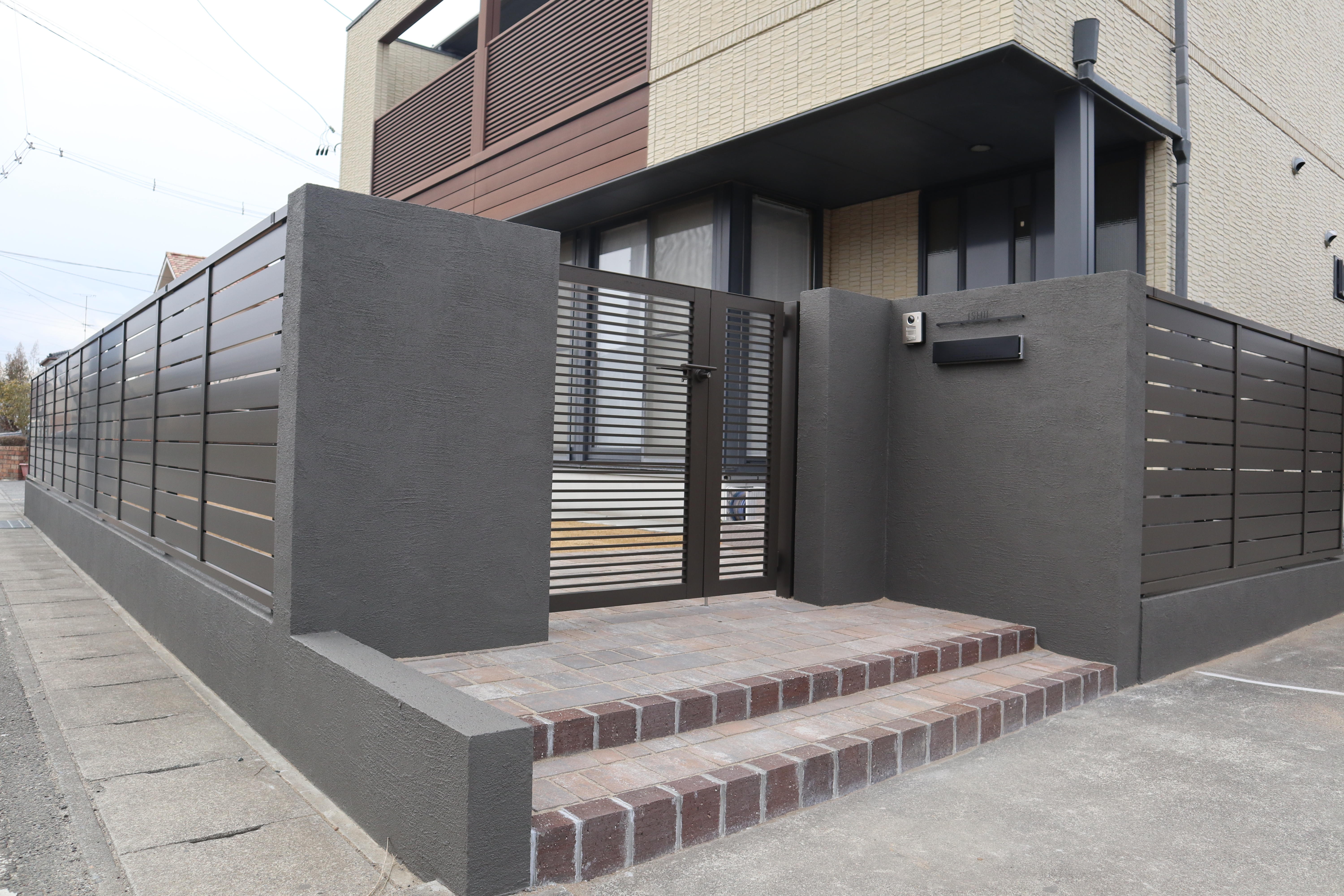 手間のかかる生垣からブラウンのシャープなフェンスにチェンジ。 新たに門壁を加え、モダンな印象に仕上げました。