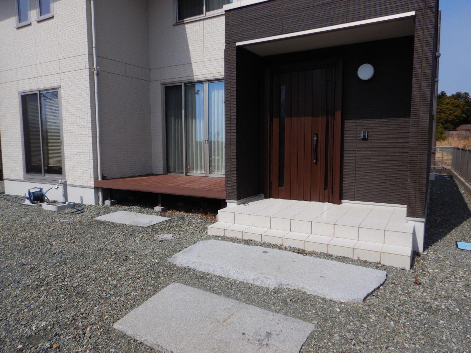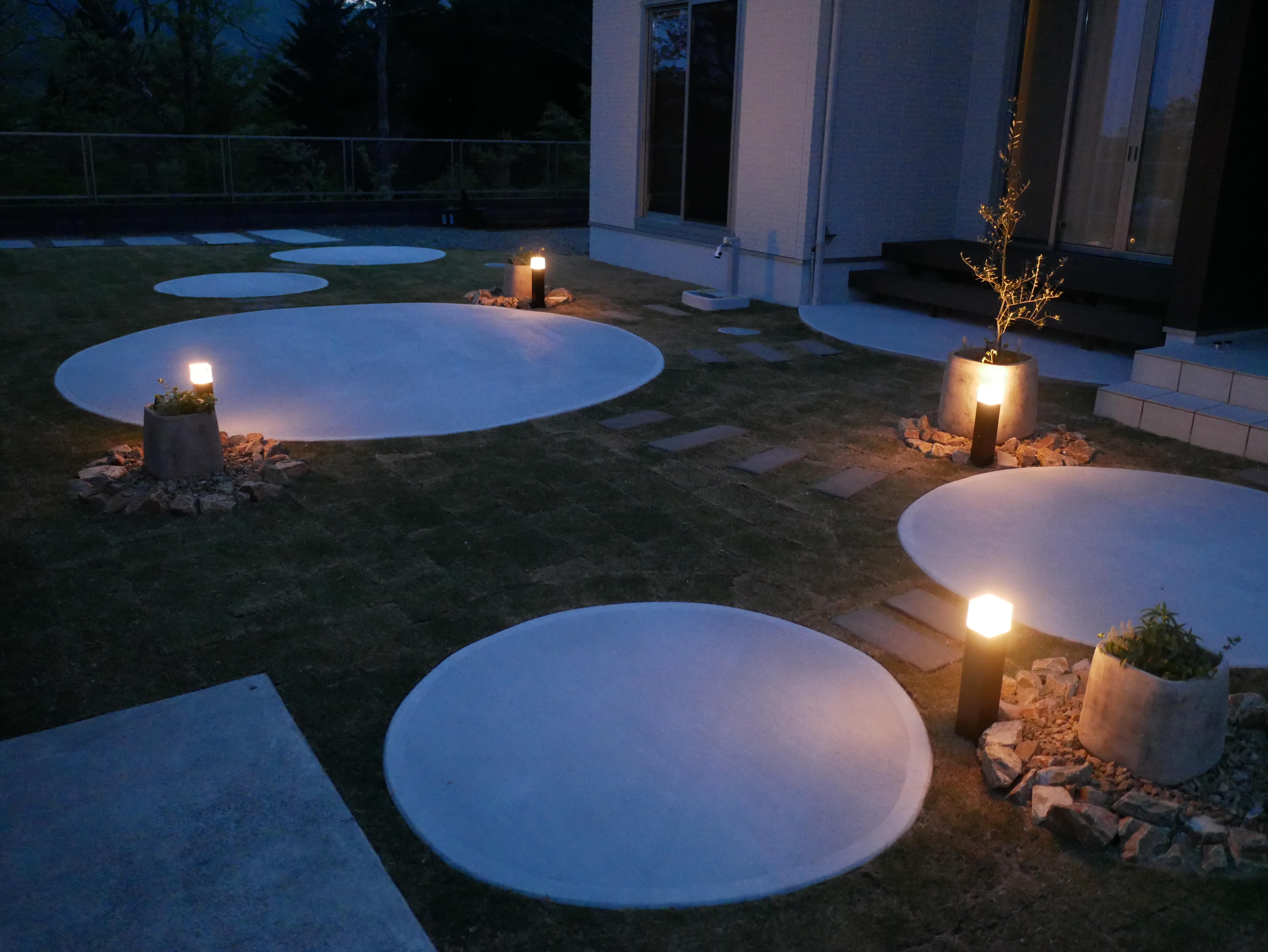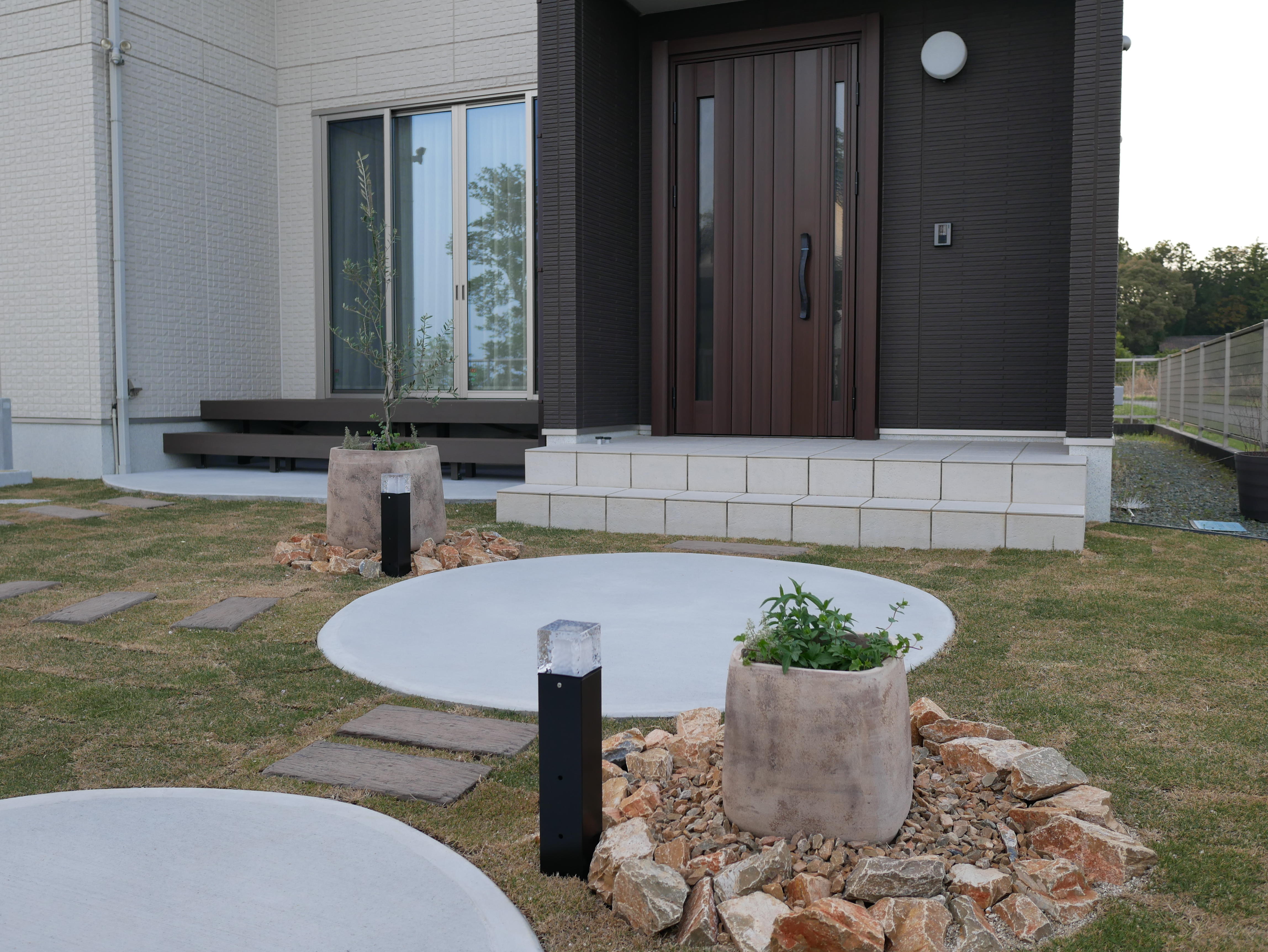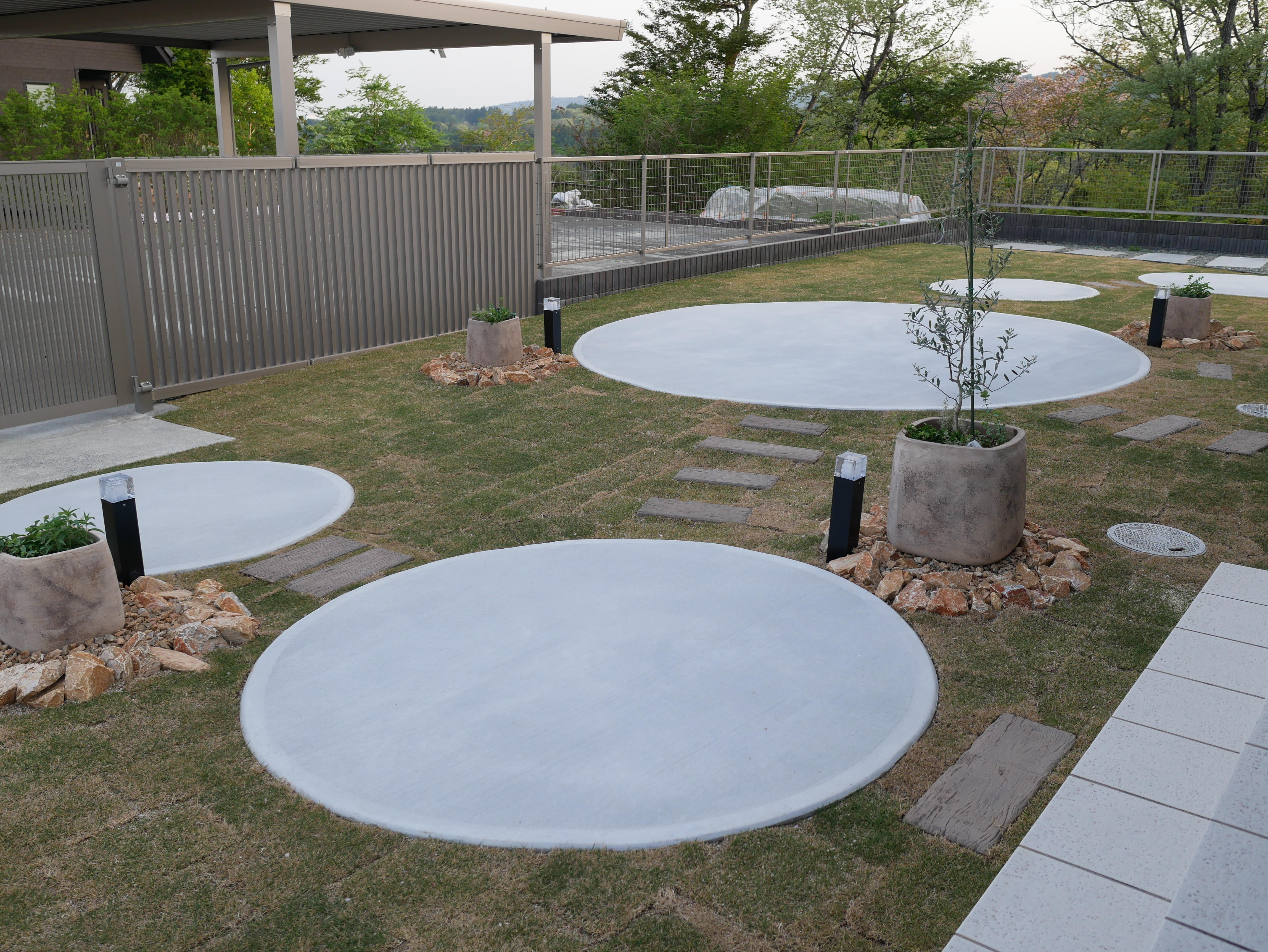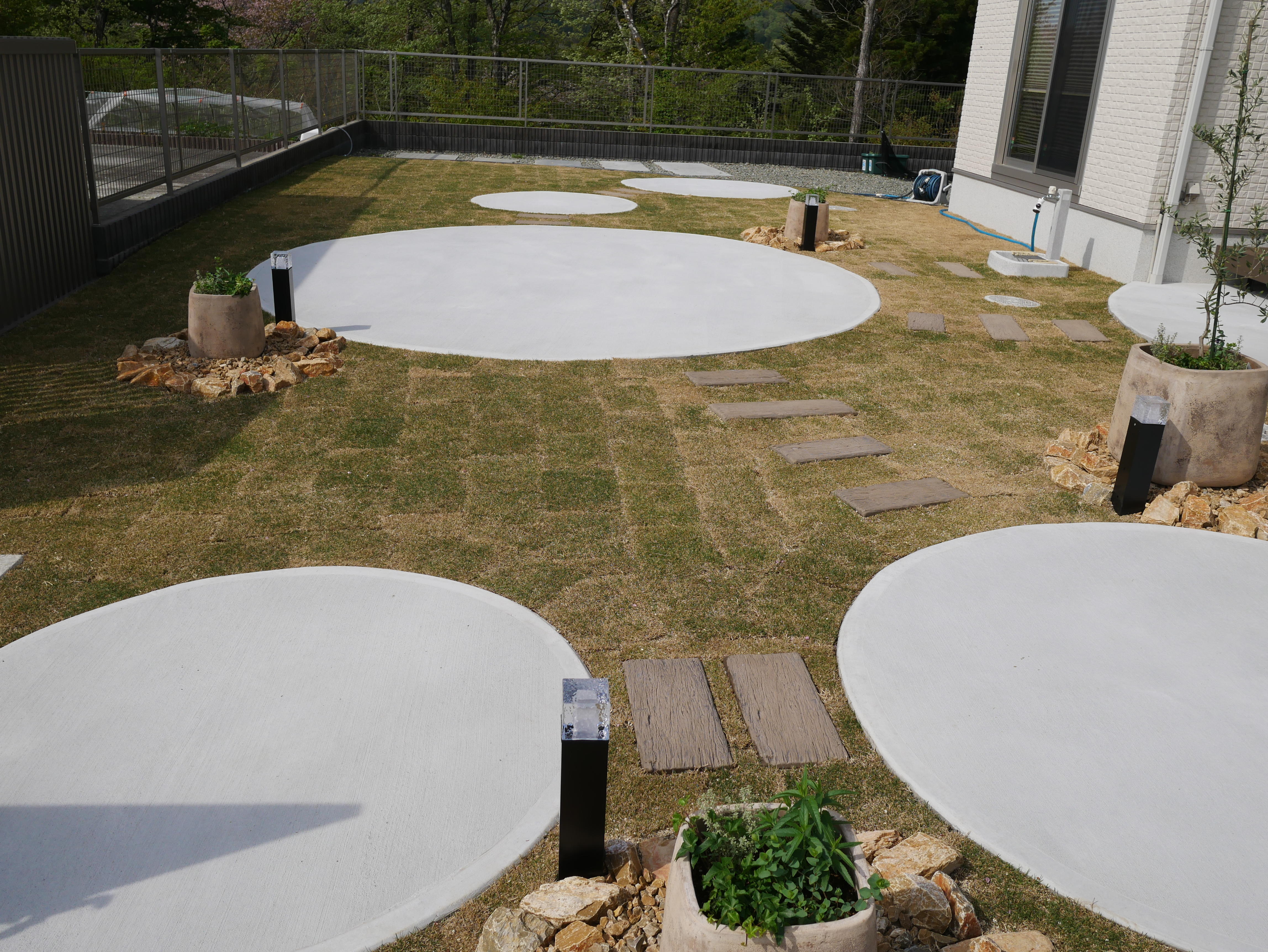 広いお庭に大小の丸コンを連ねたリズミカルな空間にチェンジ。 お子様も大喜びの楽しいお庭になりました。