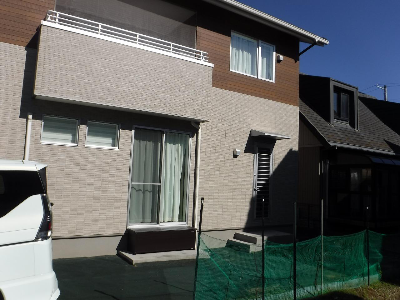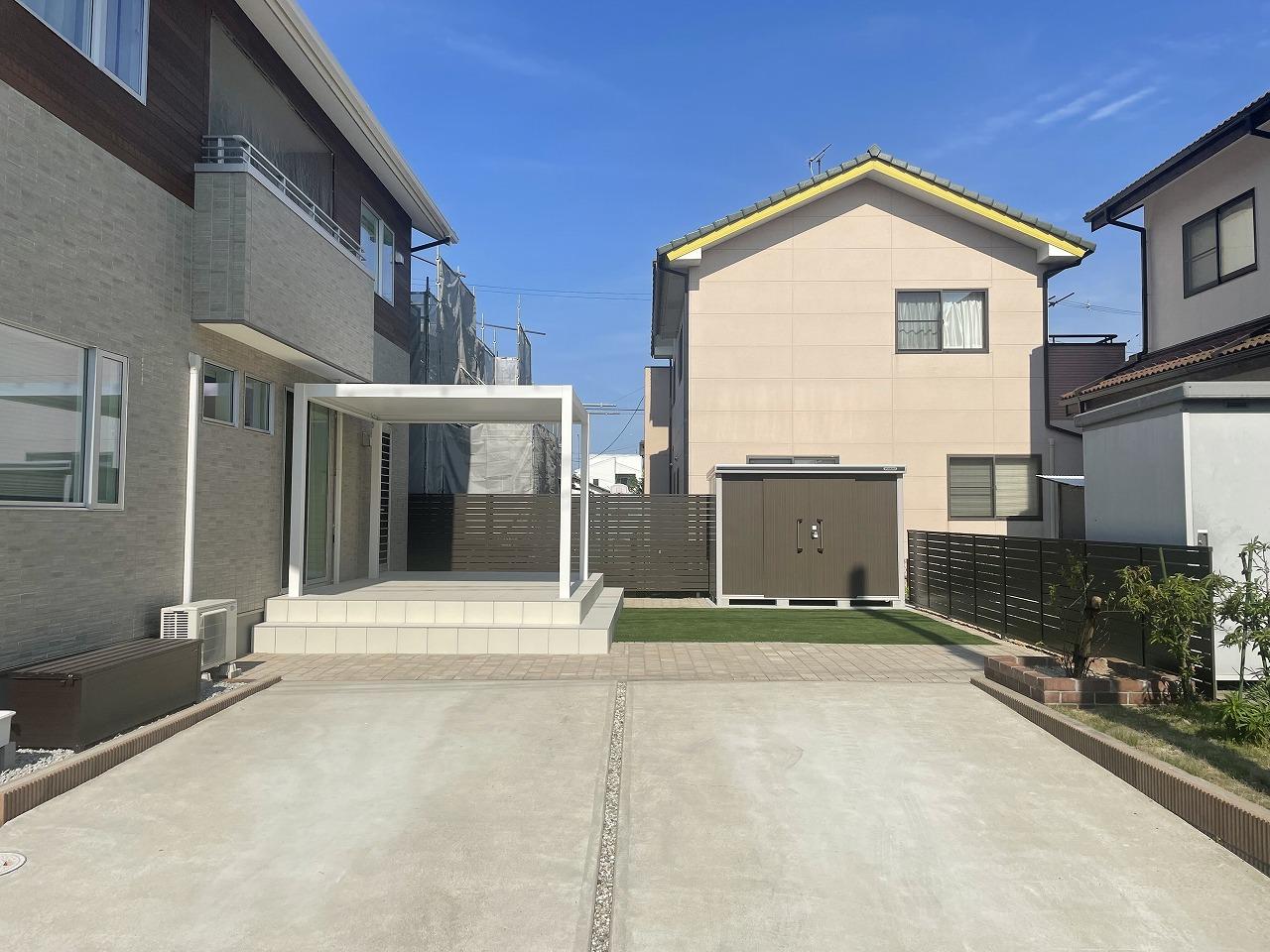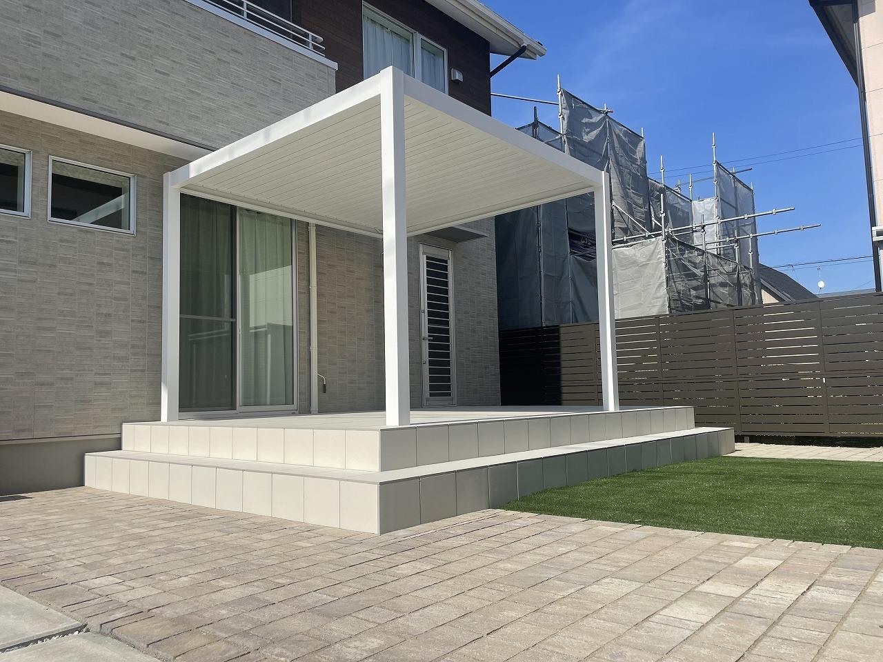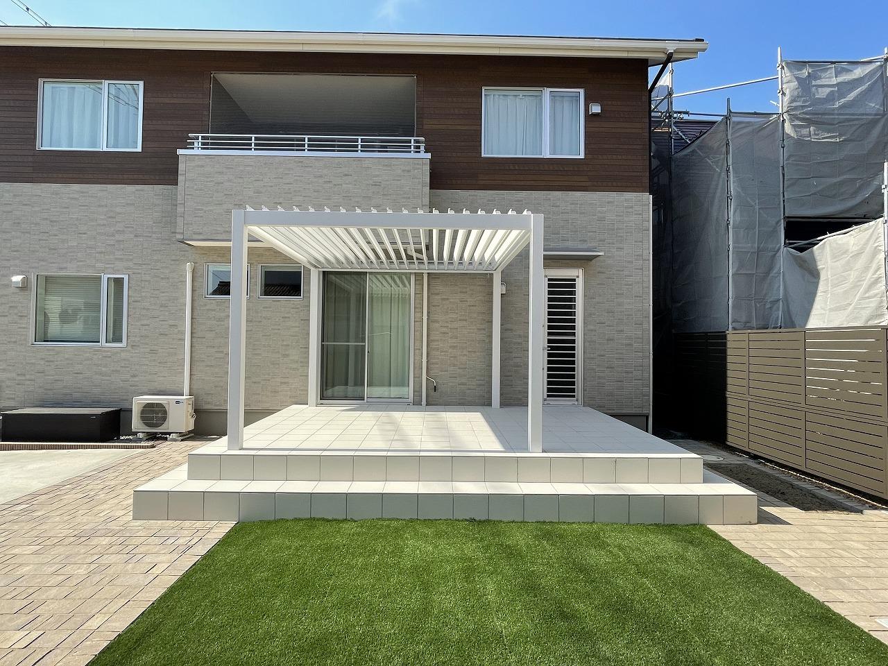 防草シートを敷いた状態で手つかずになっていたお庭をリフォーム。 土汚れを気にしない人工芝とインターロッキングを組み合わせたシンプルなデザインです。 大きなタイルテラスにパーゴラを設け、非日常を味わえる空間を作りました。