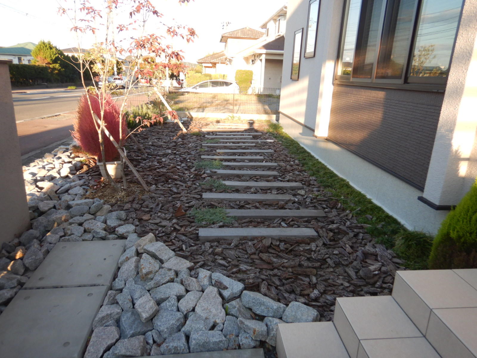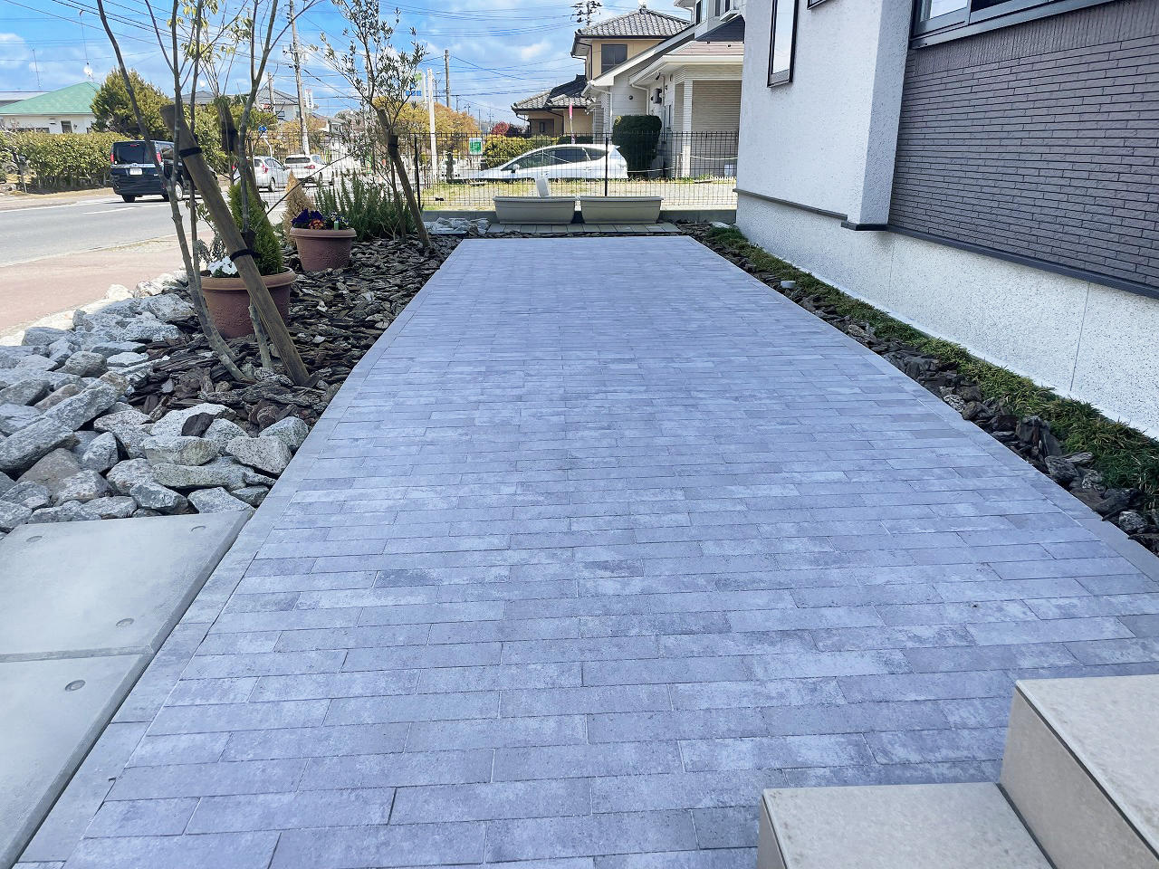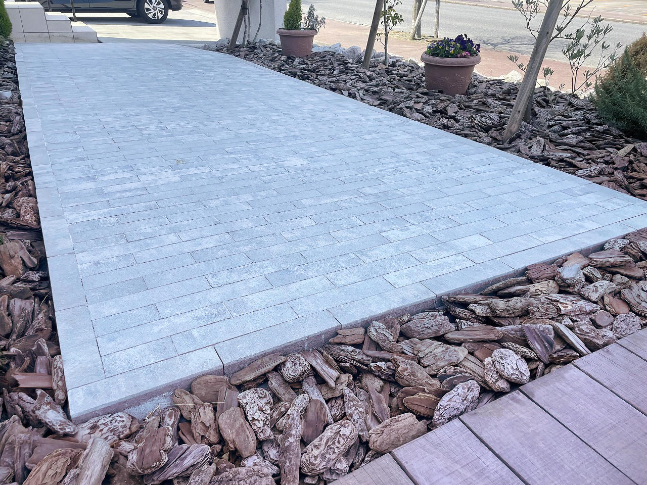 枕木の敷かれたナチュラルな小道から、インターロッキングの洗練されたファサードにリフォームしました。 一部を変えたプチリフォームでも印象がガラッと変わり、お手入れも以前より楽になりました。