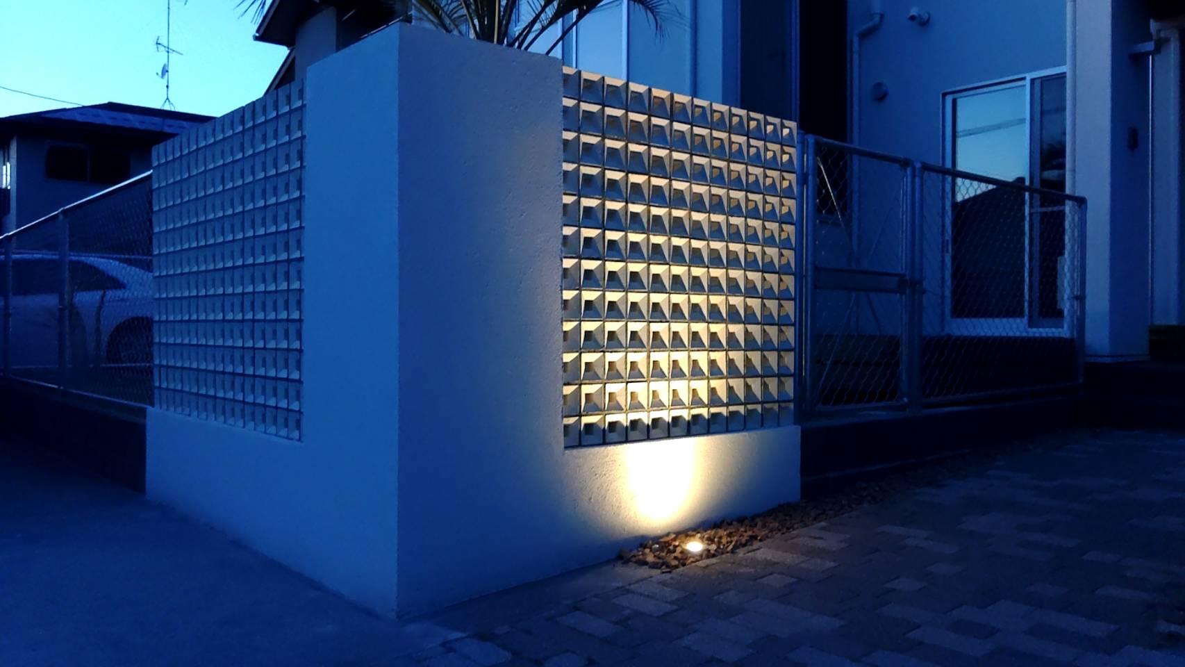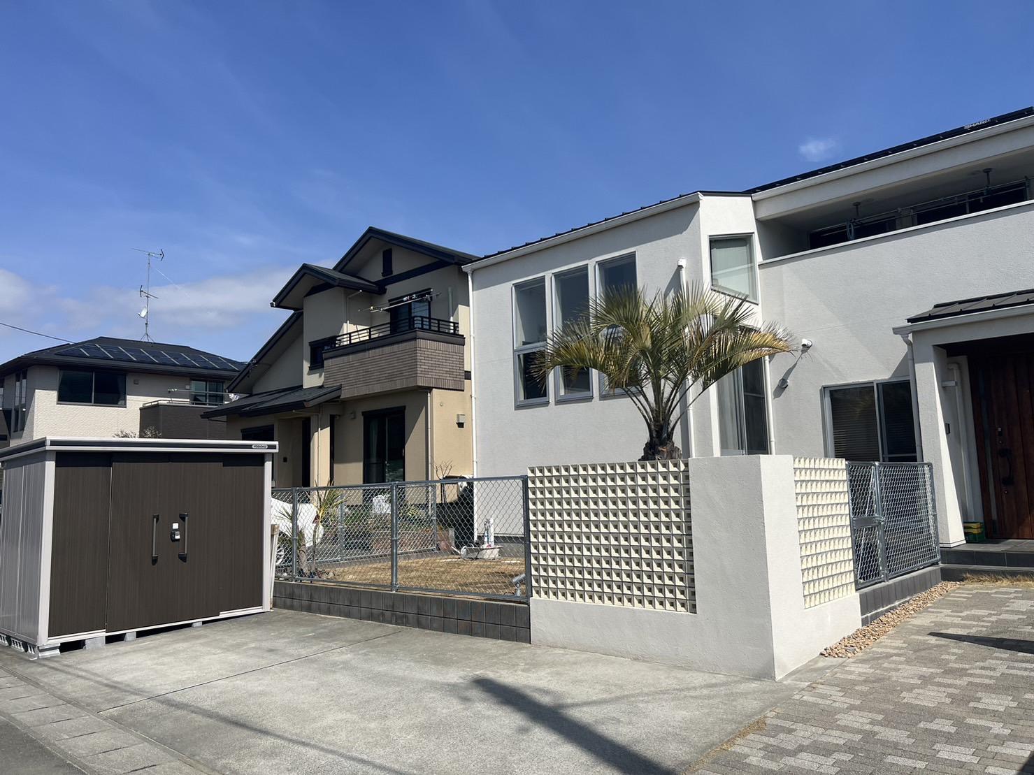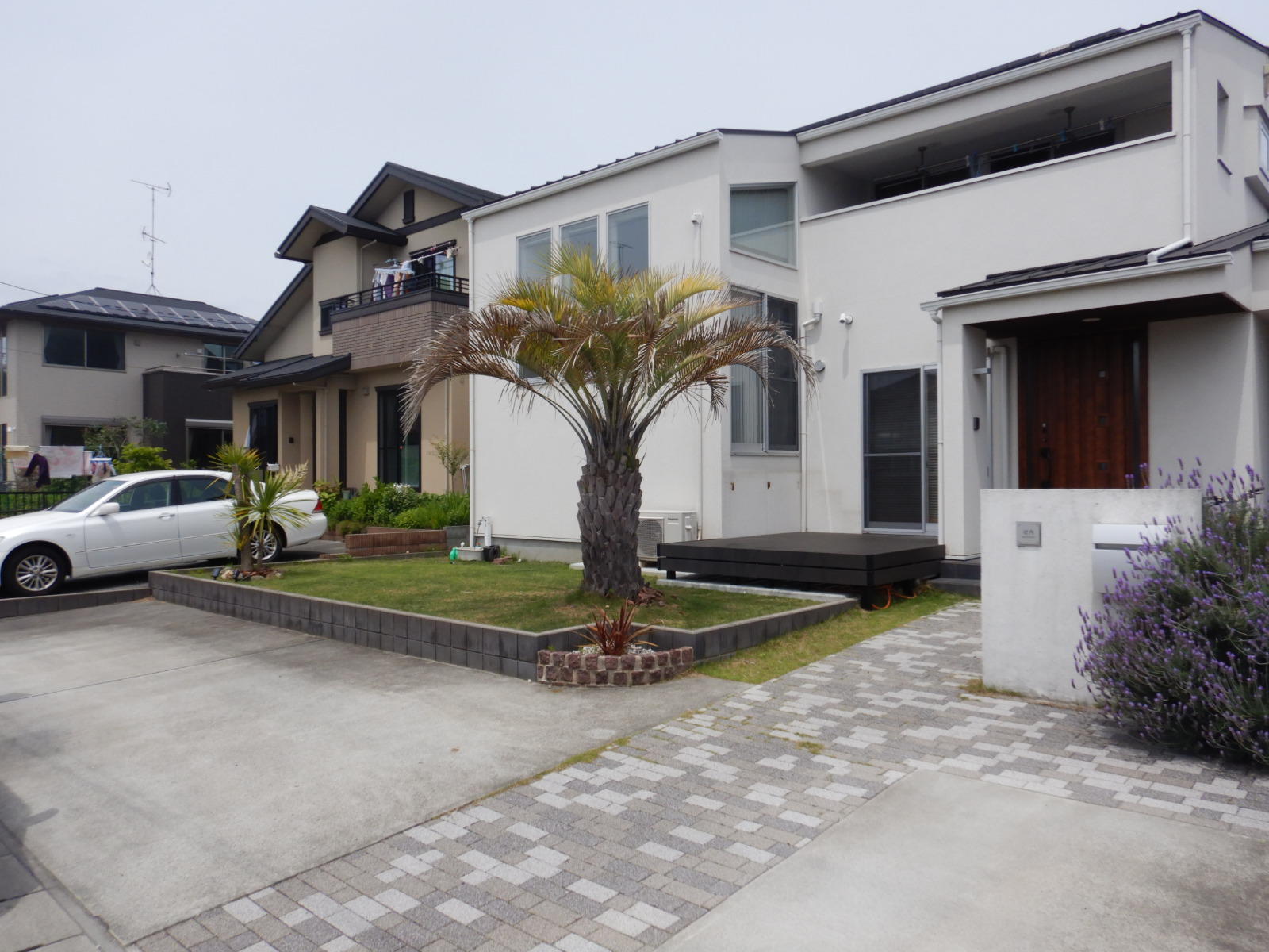 オープンだったお庭に透かしブロックを使った擁壁を設置しました。 透かしブロックを用いることで抜け感のある空間になっています。 ヤシの木のあるリゾートスタイルに。 物置設置で使い勝手も良くなりました。