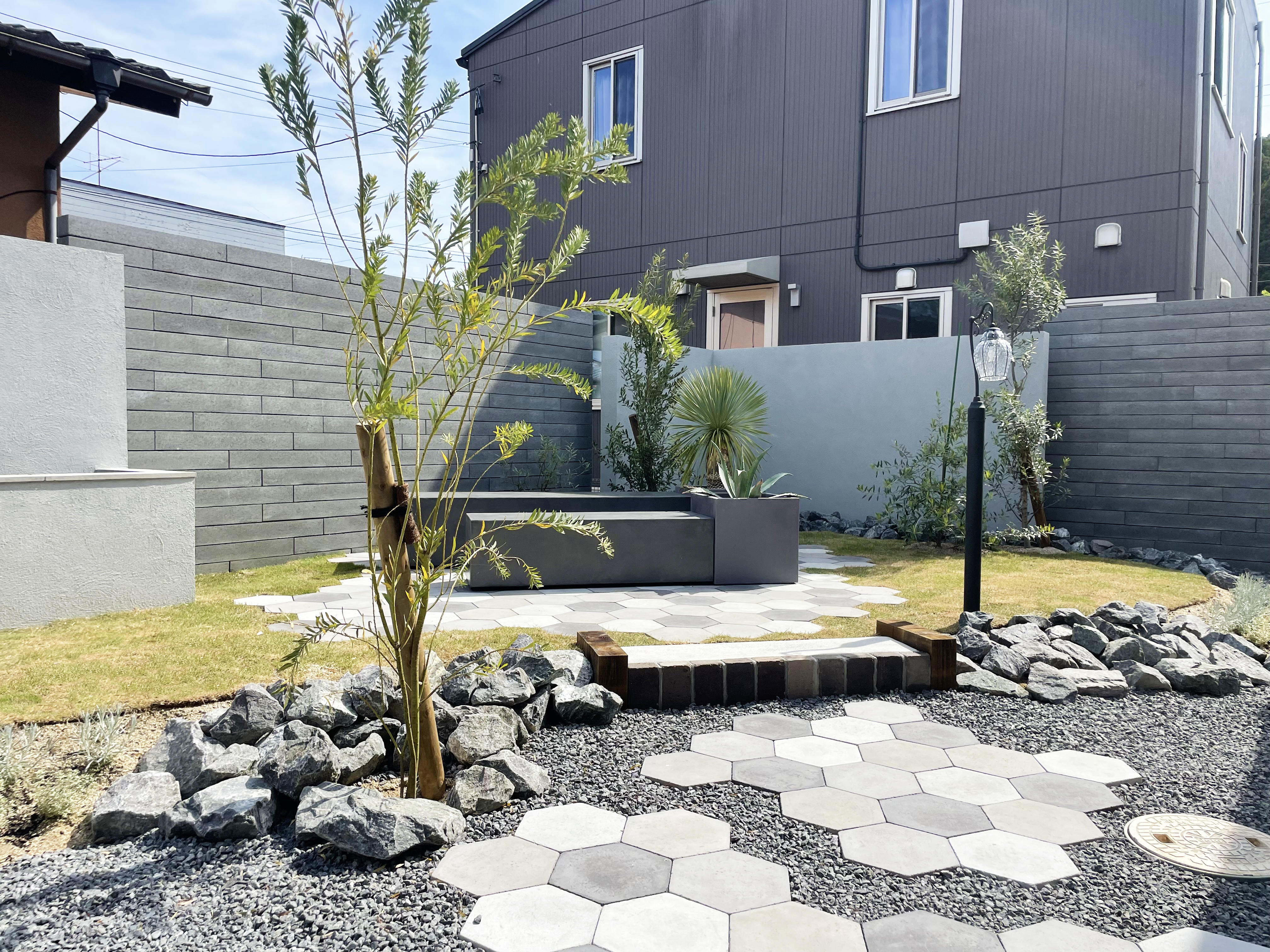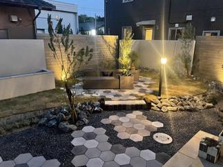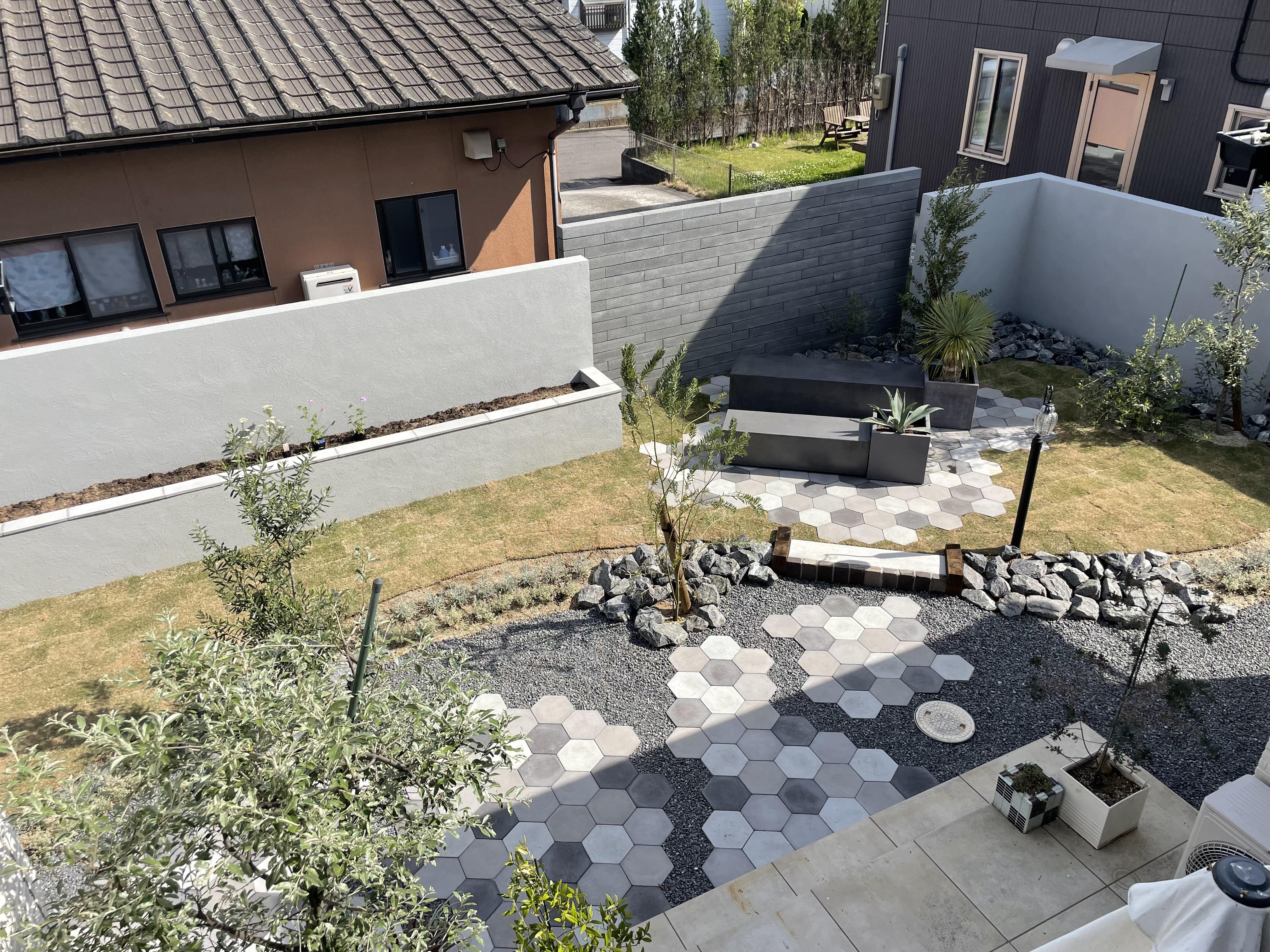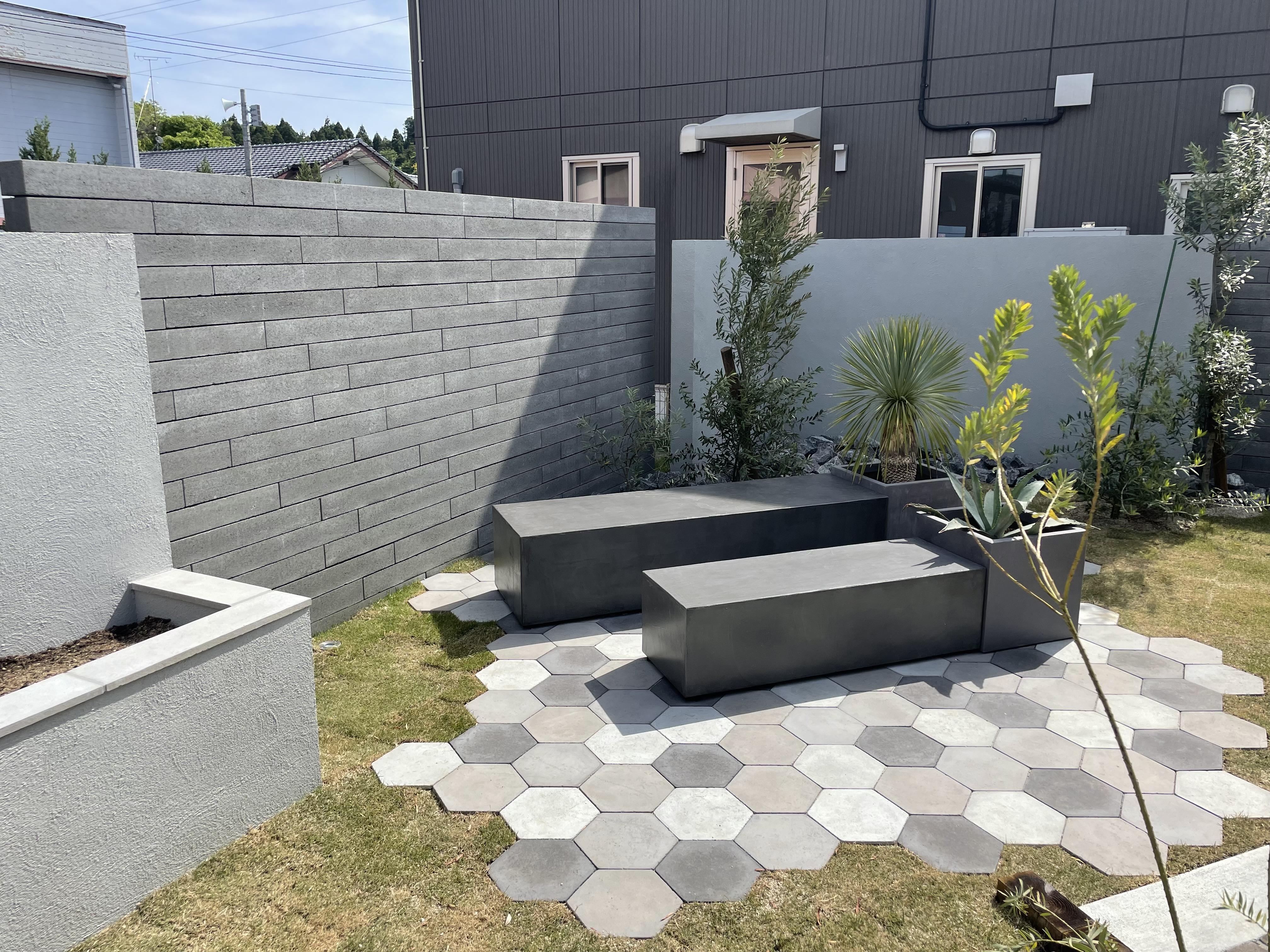 人目を気にせずお庭を楽しめるよう、塗壁と化粧ブロックで目隠しを作りました。 更にコンクリート製のガーデンファニチャーとヘキサゴンタイルで非日常感をアップ! ライトアップされた空間でのんびりとした時間を過ごすのも良さそうですね。