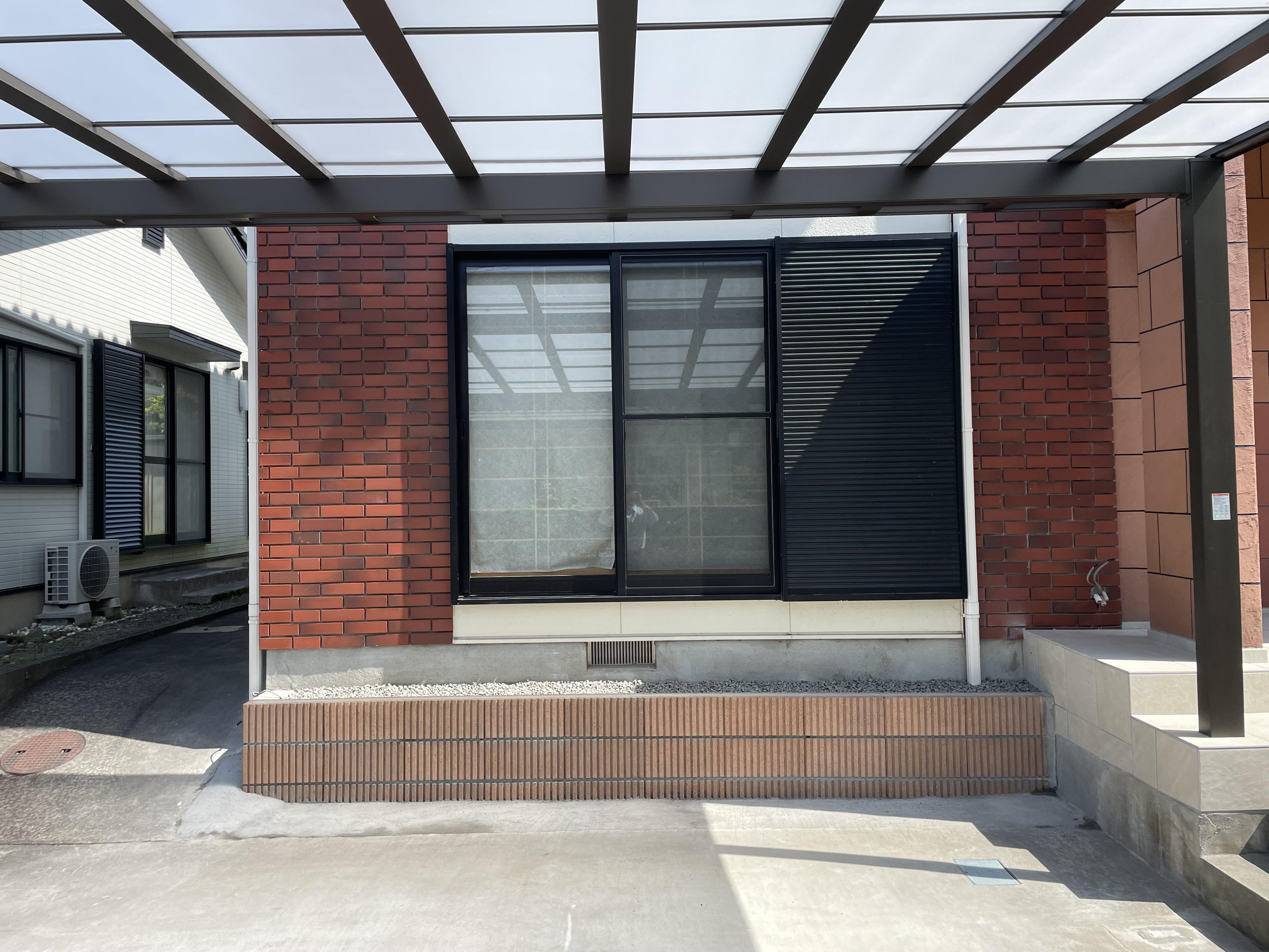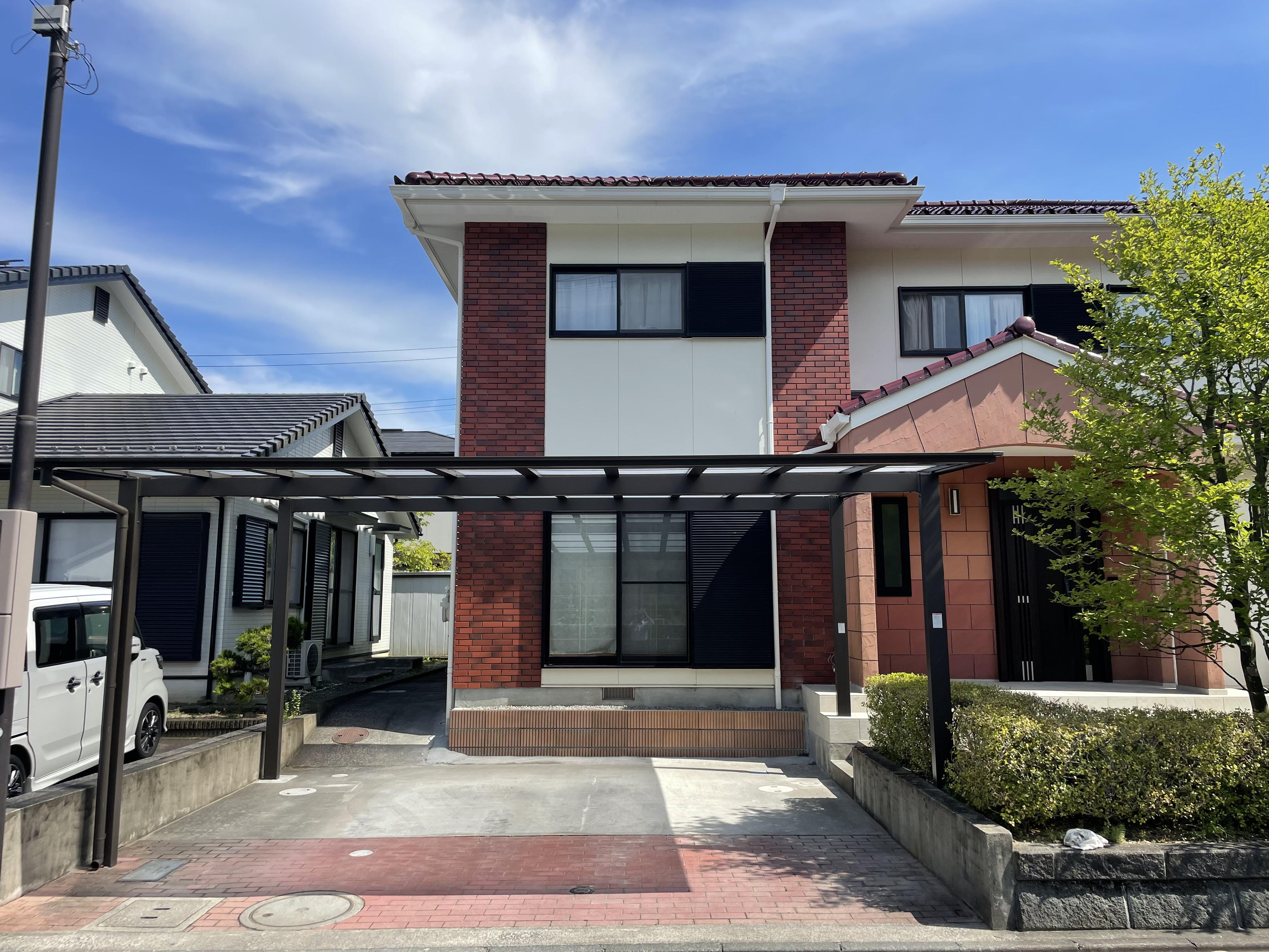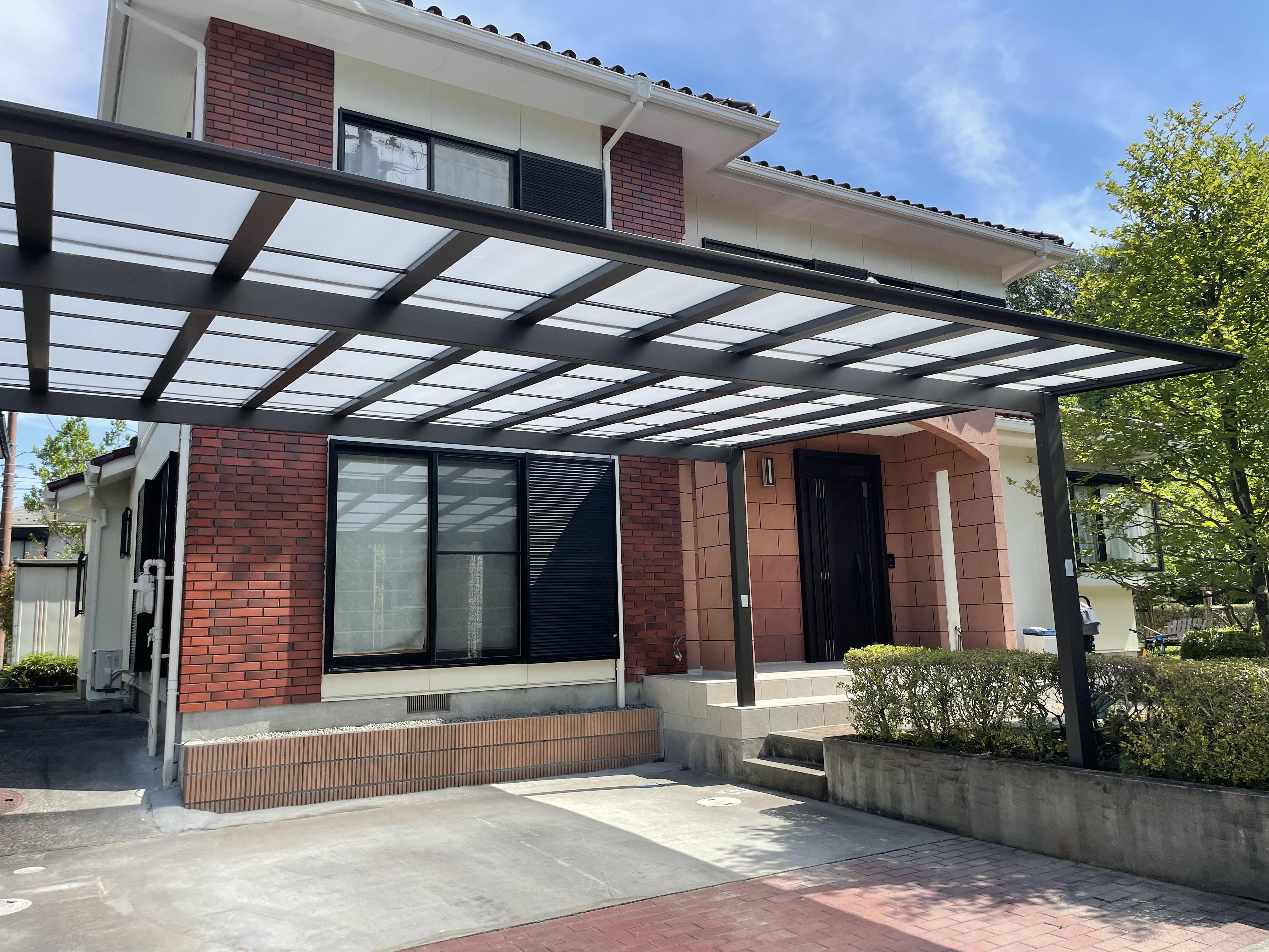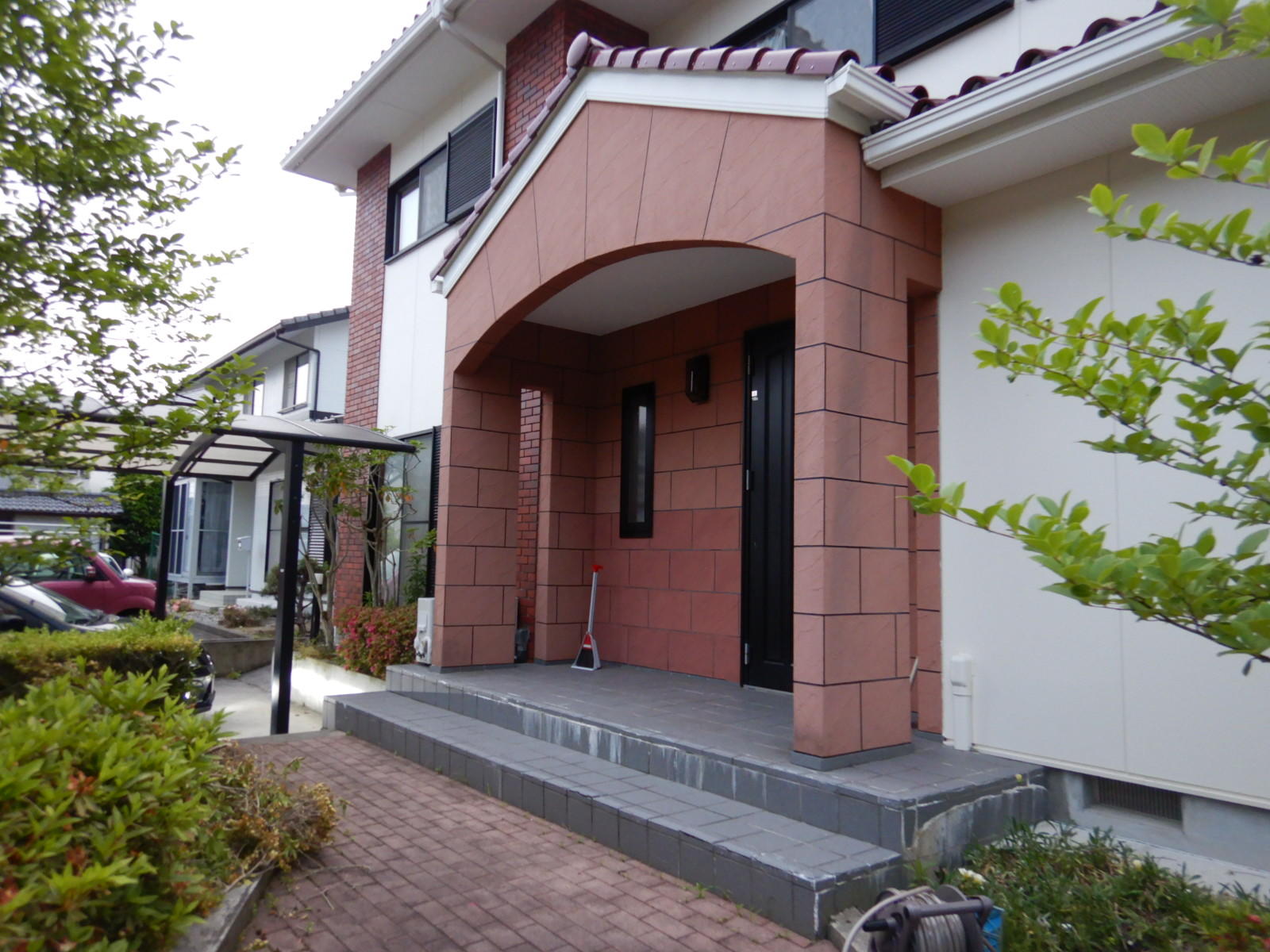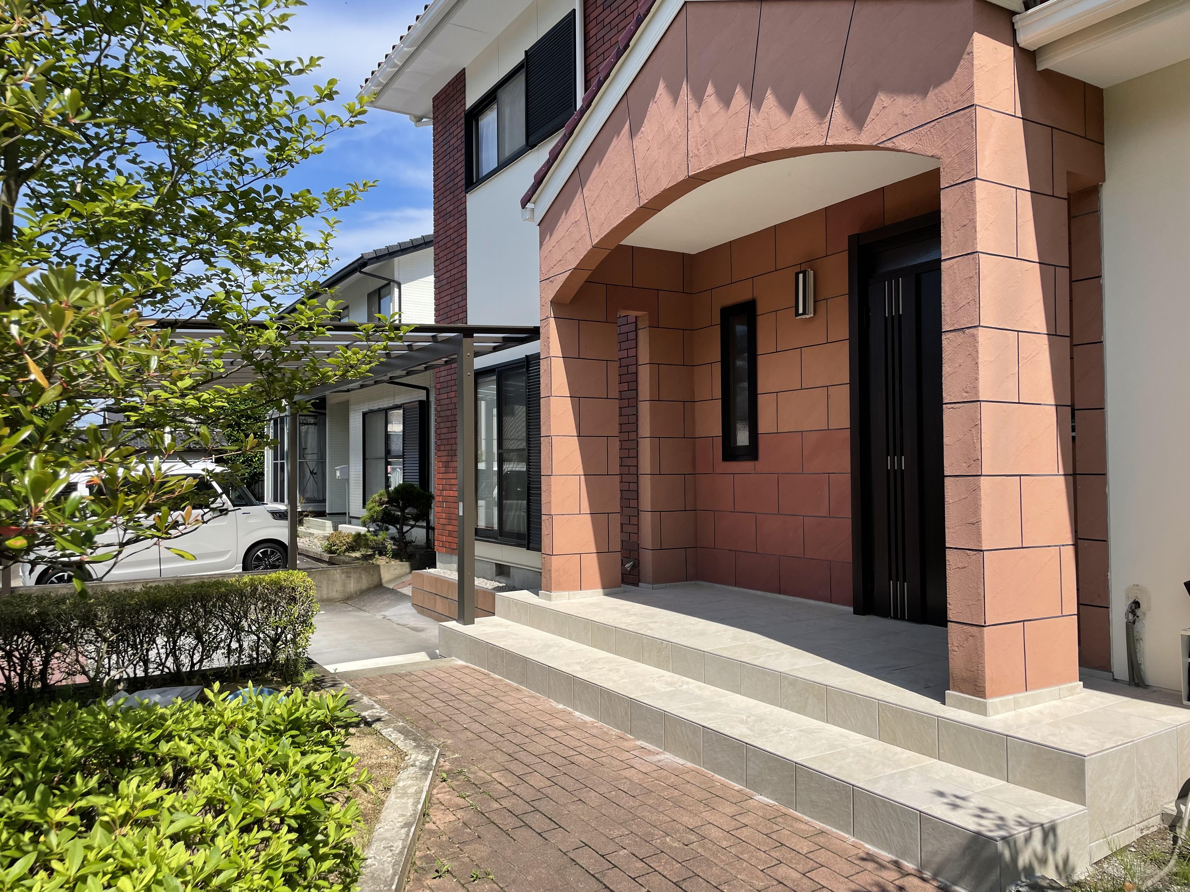 クラックや汚れの目立っていた玄関タイルを張り替え、明るい印象の玄関に変わりました。 合わせてカーポートも変え、今時な雰囲気のファサードになりました。