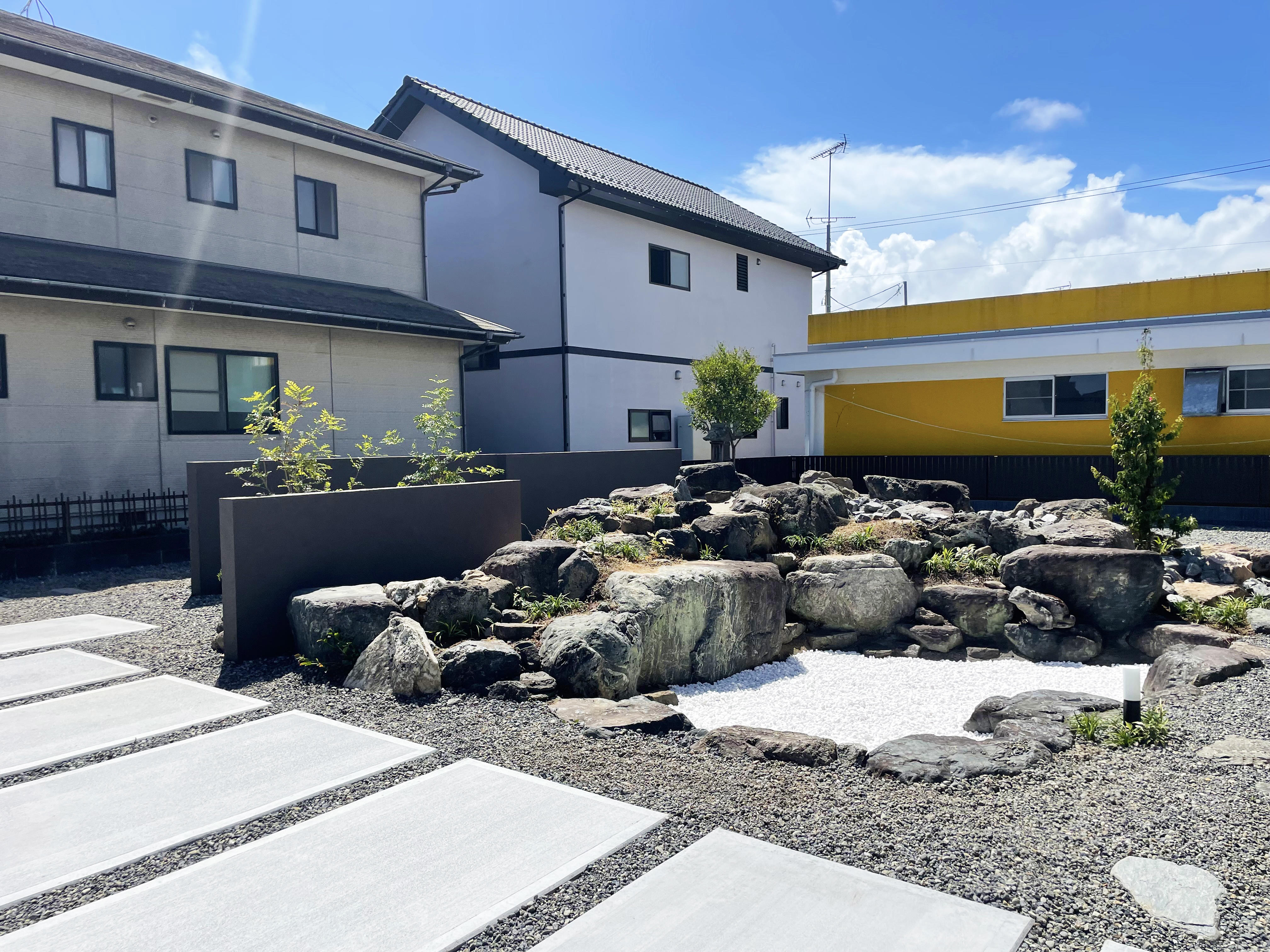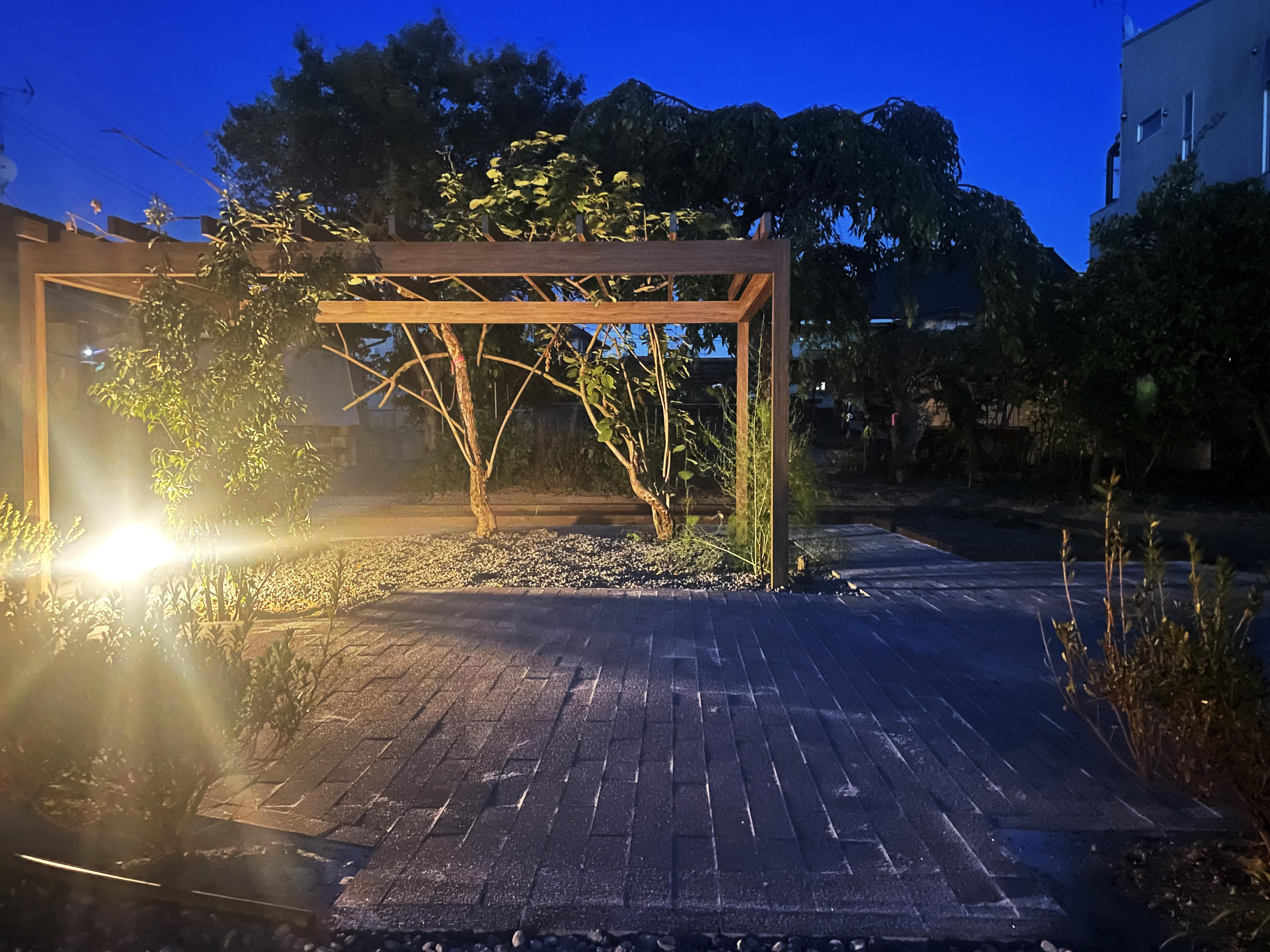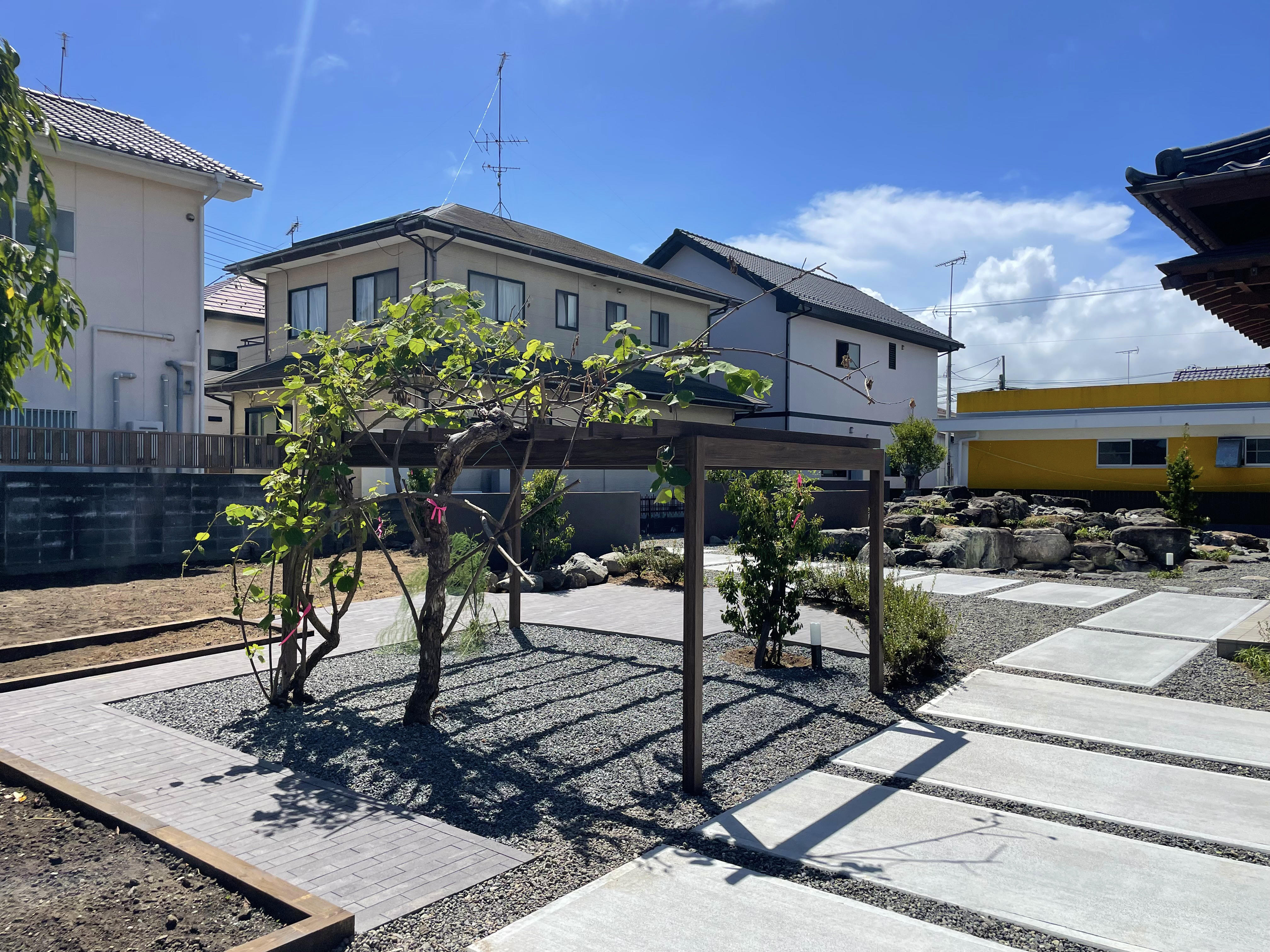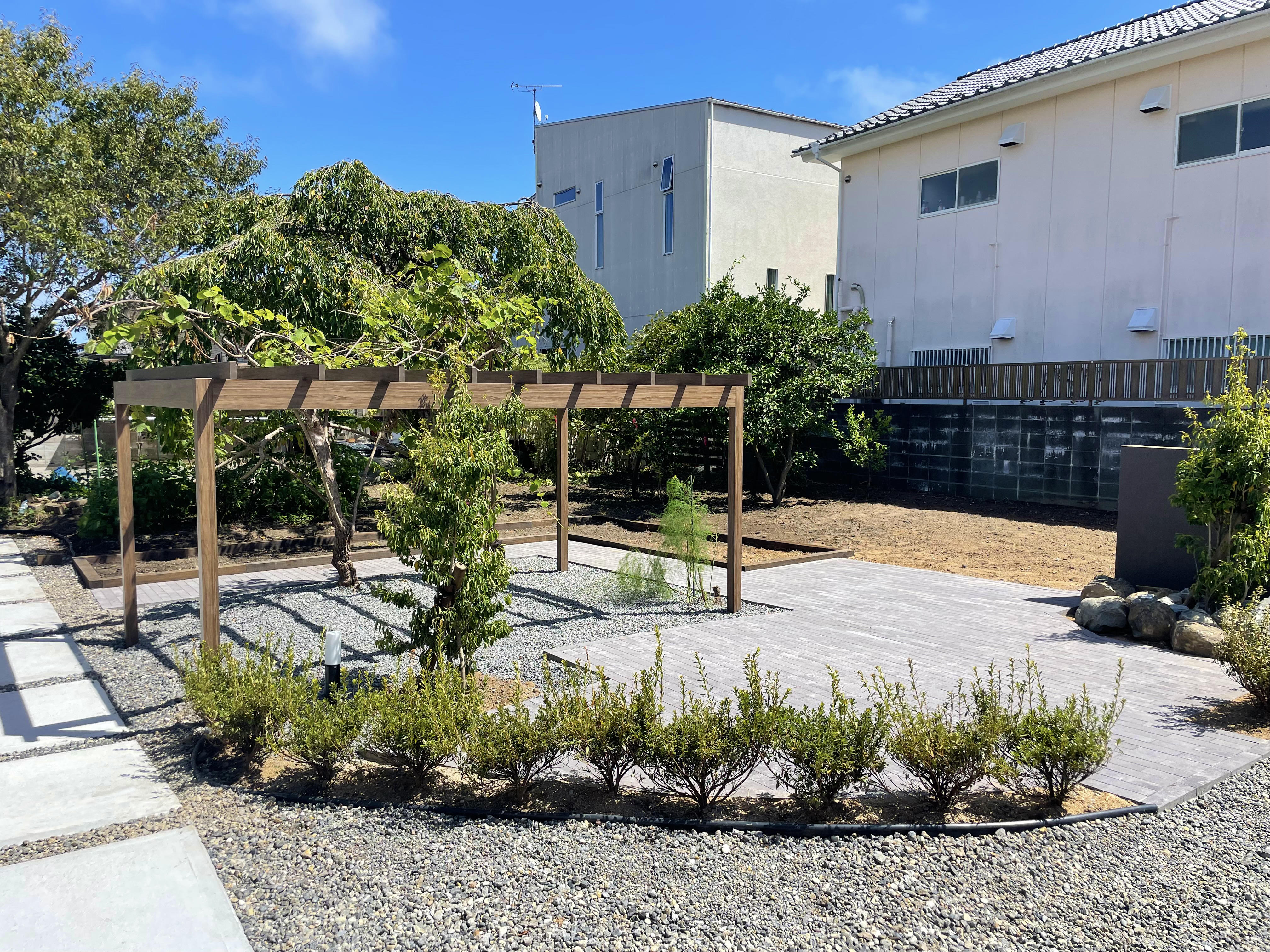 植栽の多い広々としたお庭のリフォームのお客様でした。残す植物を厳選しつつ、お手入れがしやすいようにリフォームいたしました。既存のキウイの木の付近にパーゴラを設置し、ツルが伸びて絡んでいくようにしています。パーゴラが樹木に溶け込むよう、色はブラウンを選択しています。