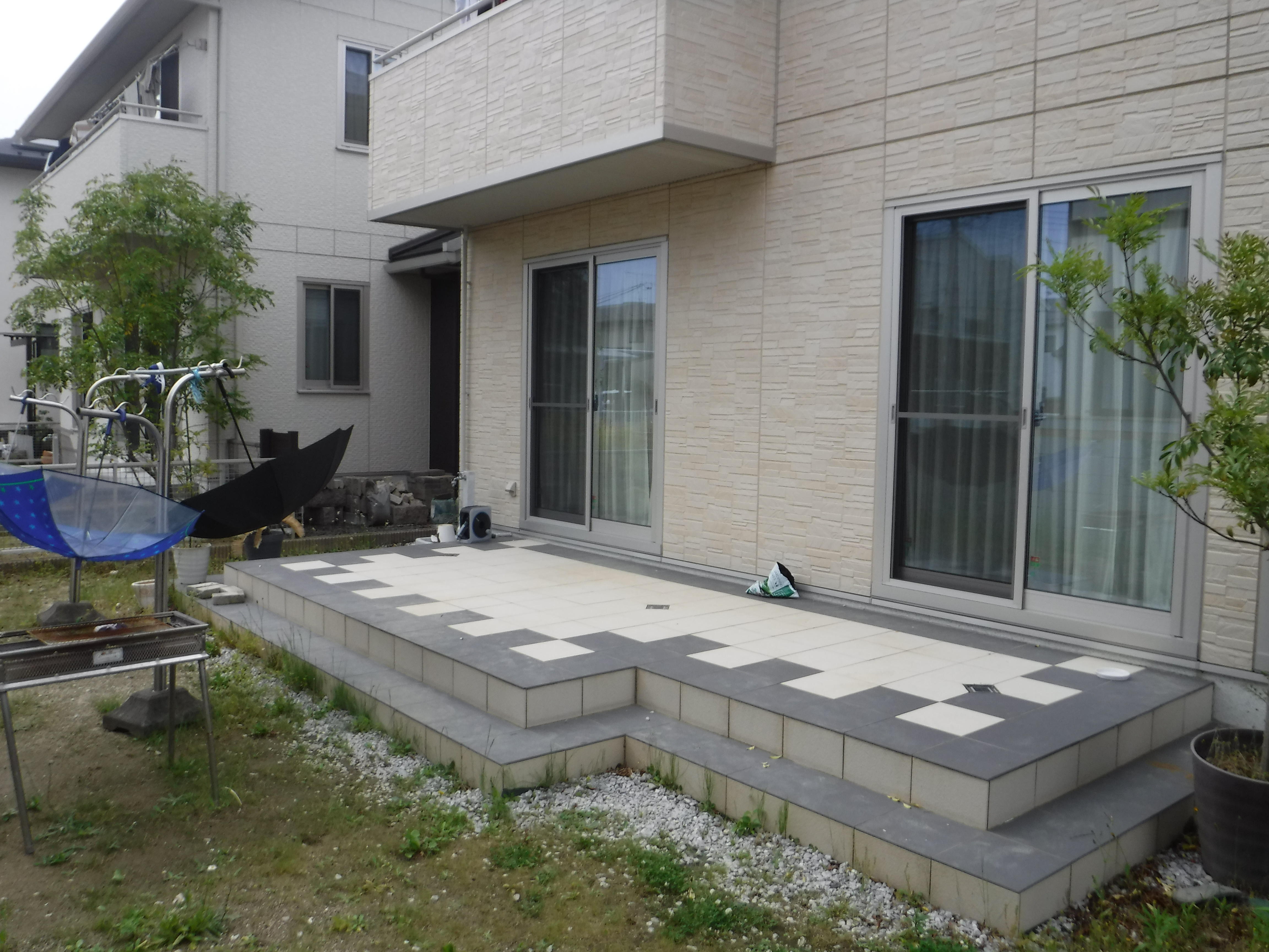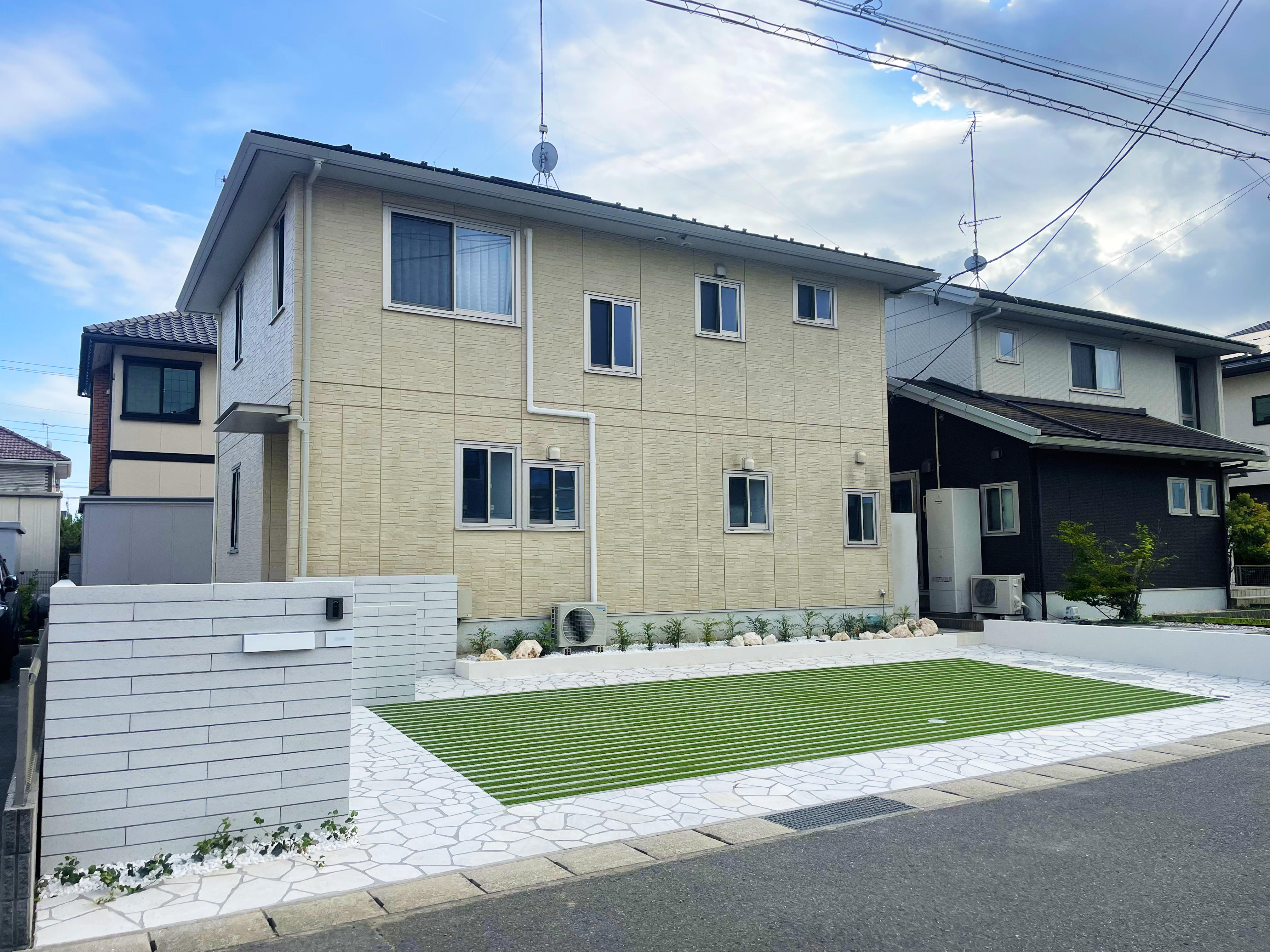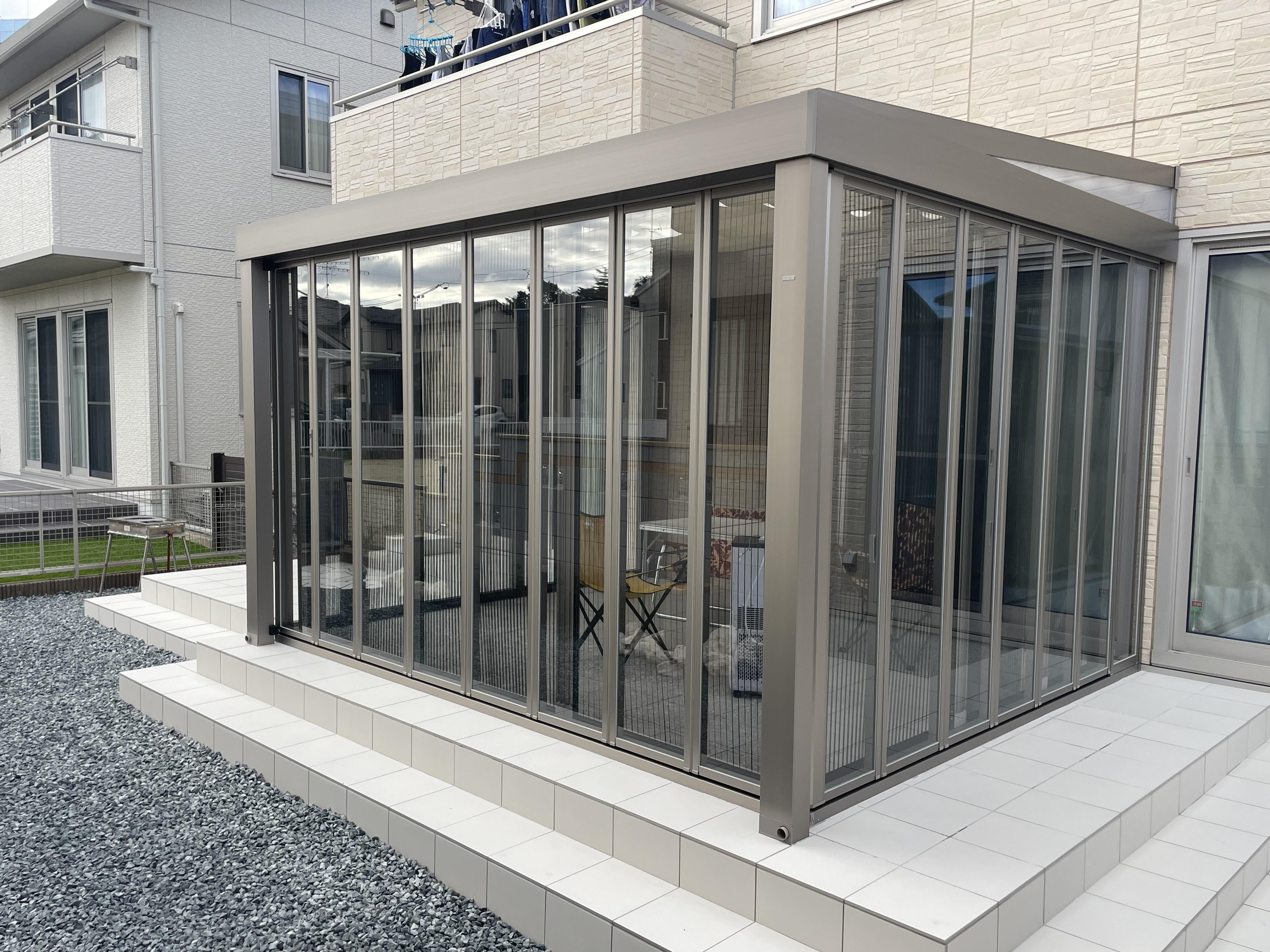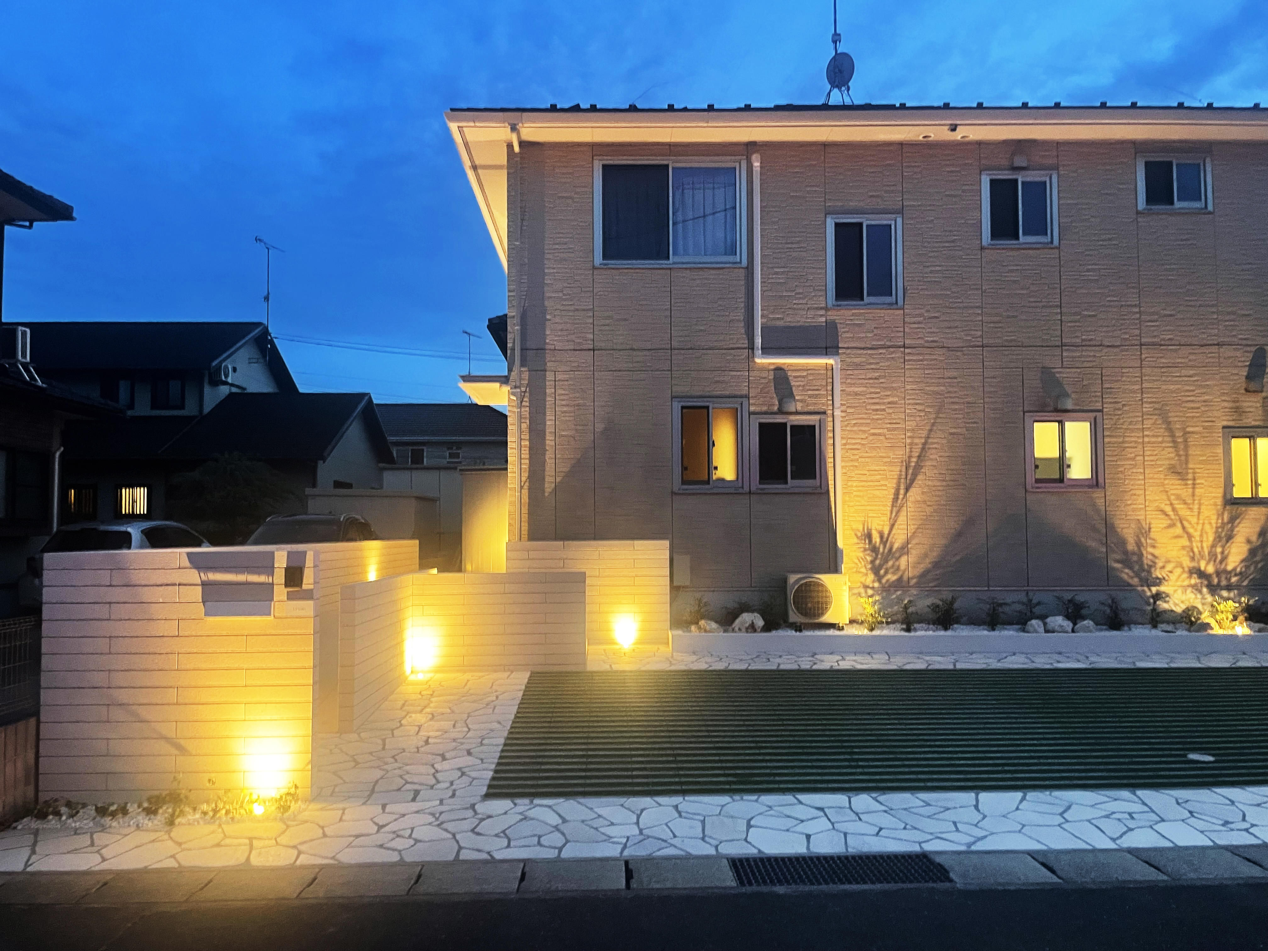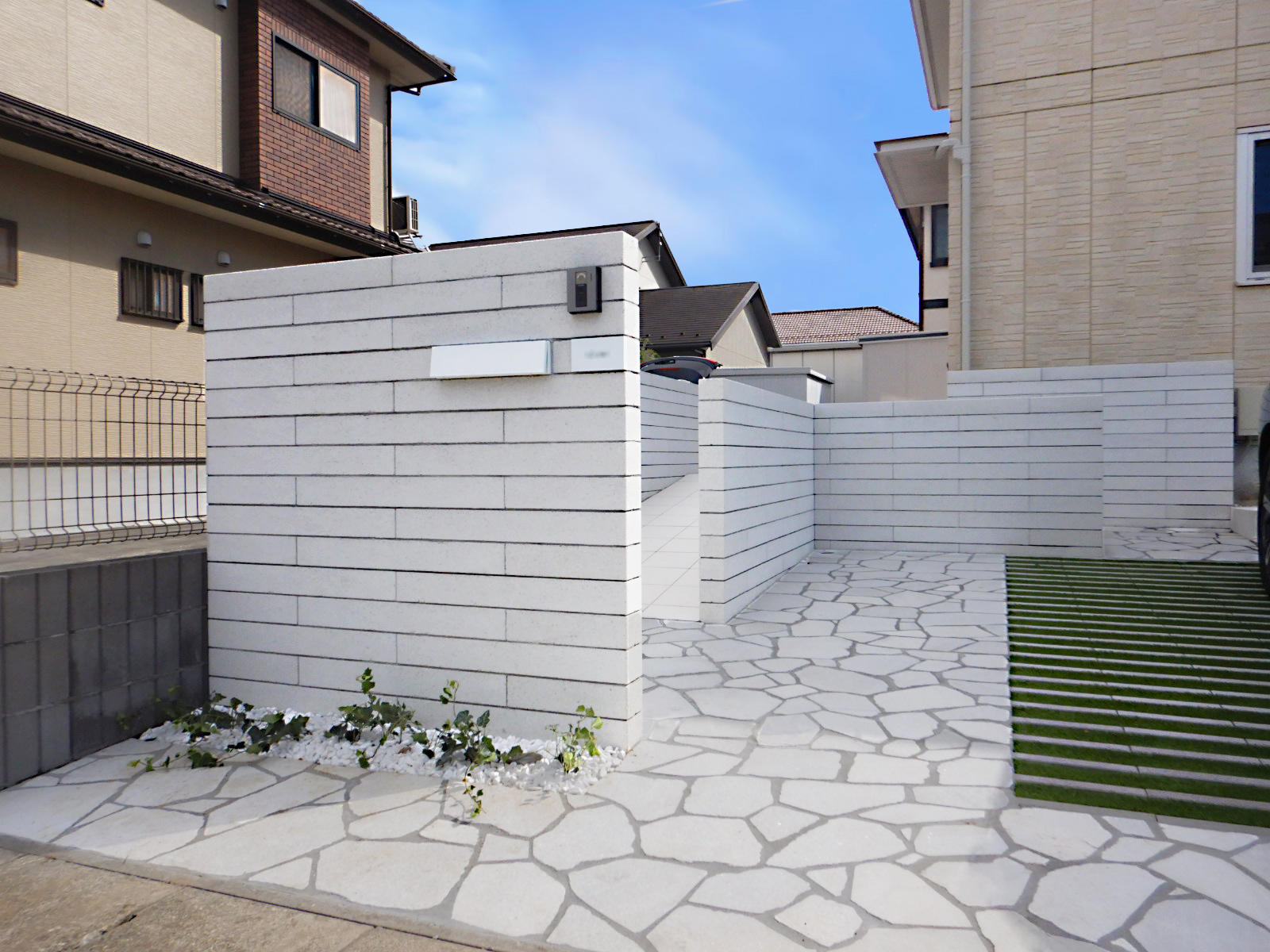 アプローチとタイルテラスを白で統一したリゾート風の外構です。白いタイルテラス上にガーデンルームを設置し、中と外を繋ぐ空間を作りました。広々としたテラスなので家族みんなが集まっても窮屈さは感じません。白のタイルを選んだことでより広く感じられます。また、アプローチ側には照明を備え付け、更にラグジュアリーな印象になりました。