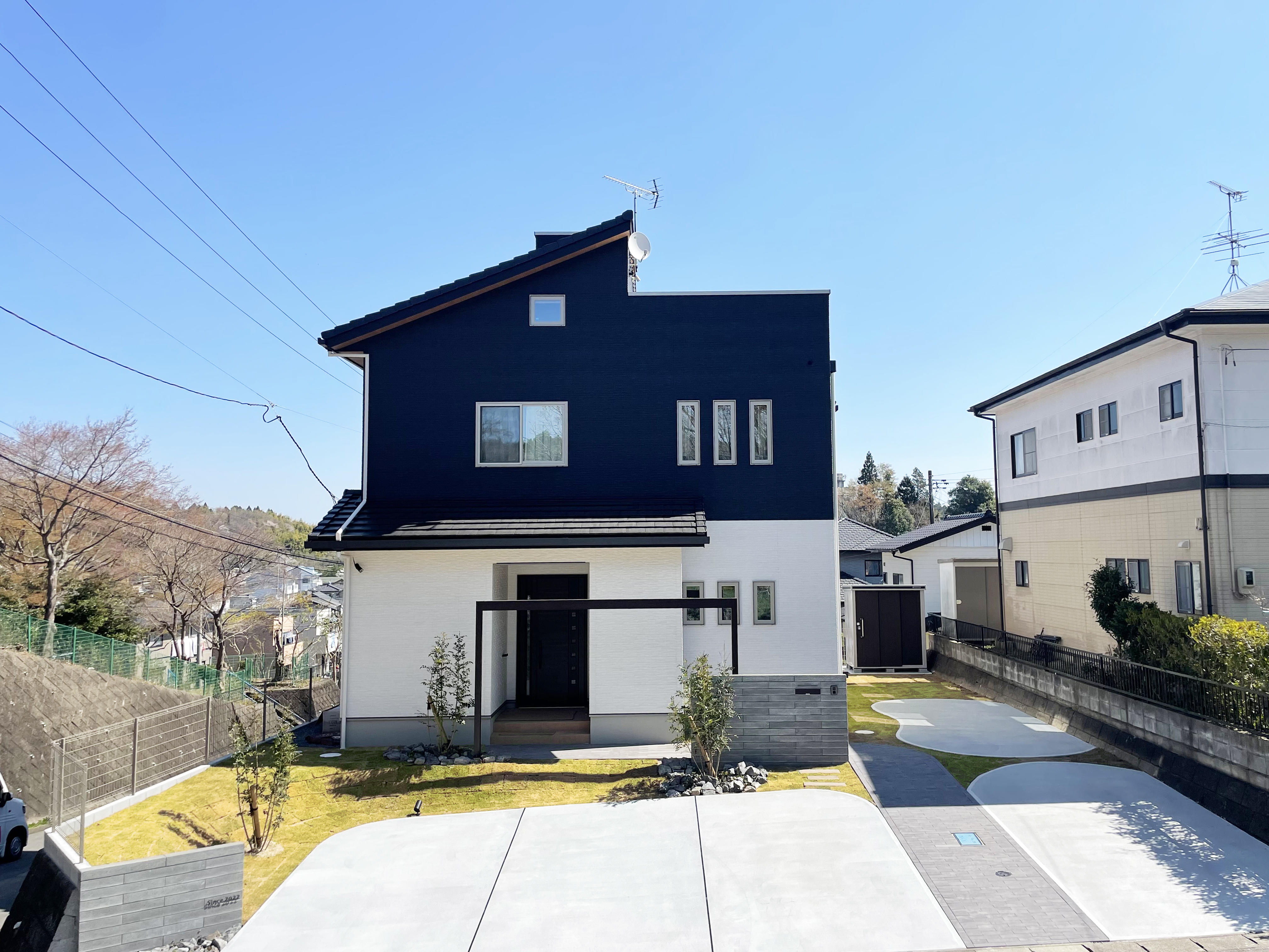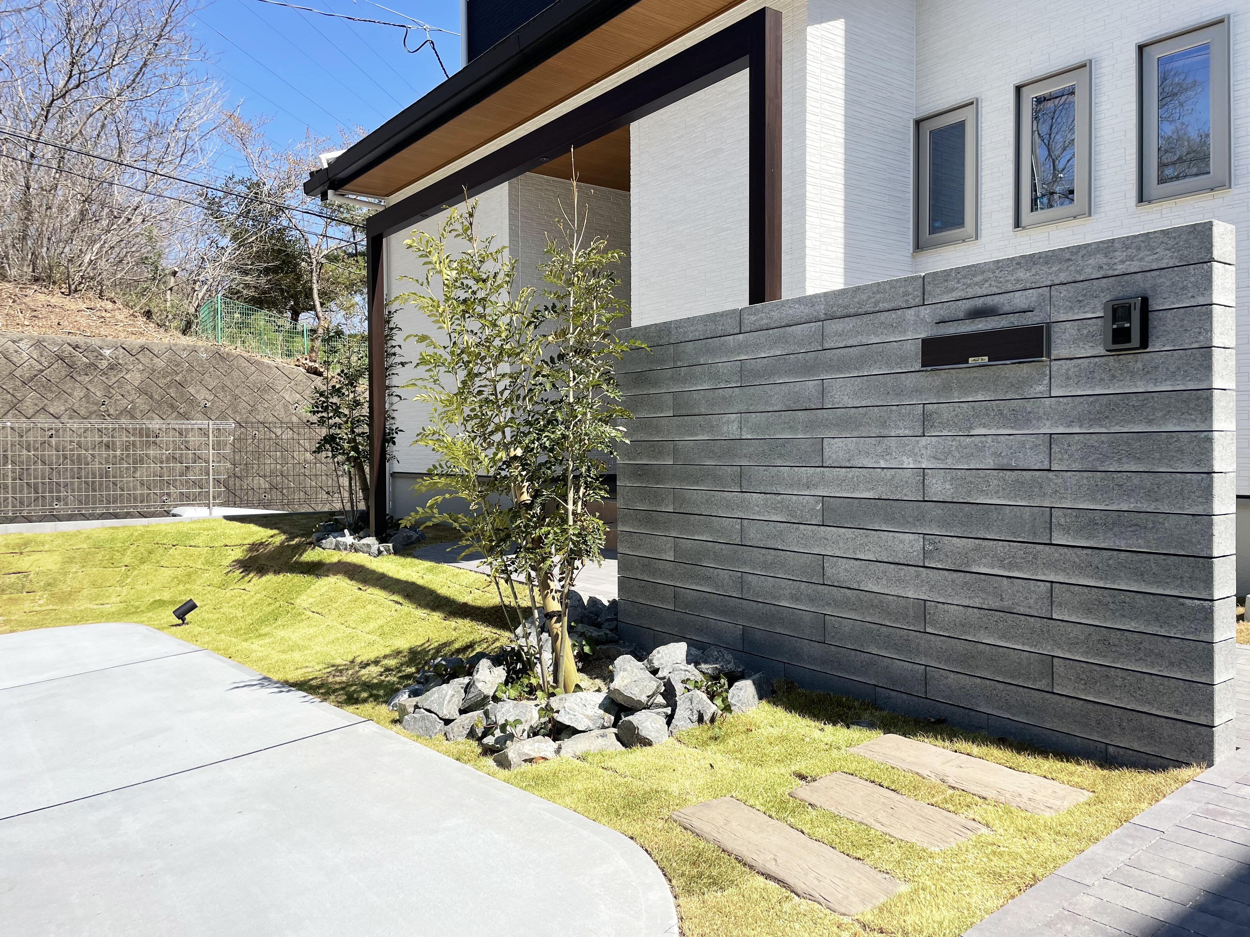 オープンスタイルのお庭にアクセントとしてGフレームを設置しました。単調になりがちな玄関前に新たな表情をプラスしてくれました。スタイリッシュな見た目にもかかわらず、植栽や芝生との相性も良く、その場の雰囲気になじみました。
