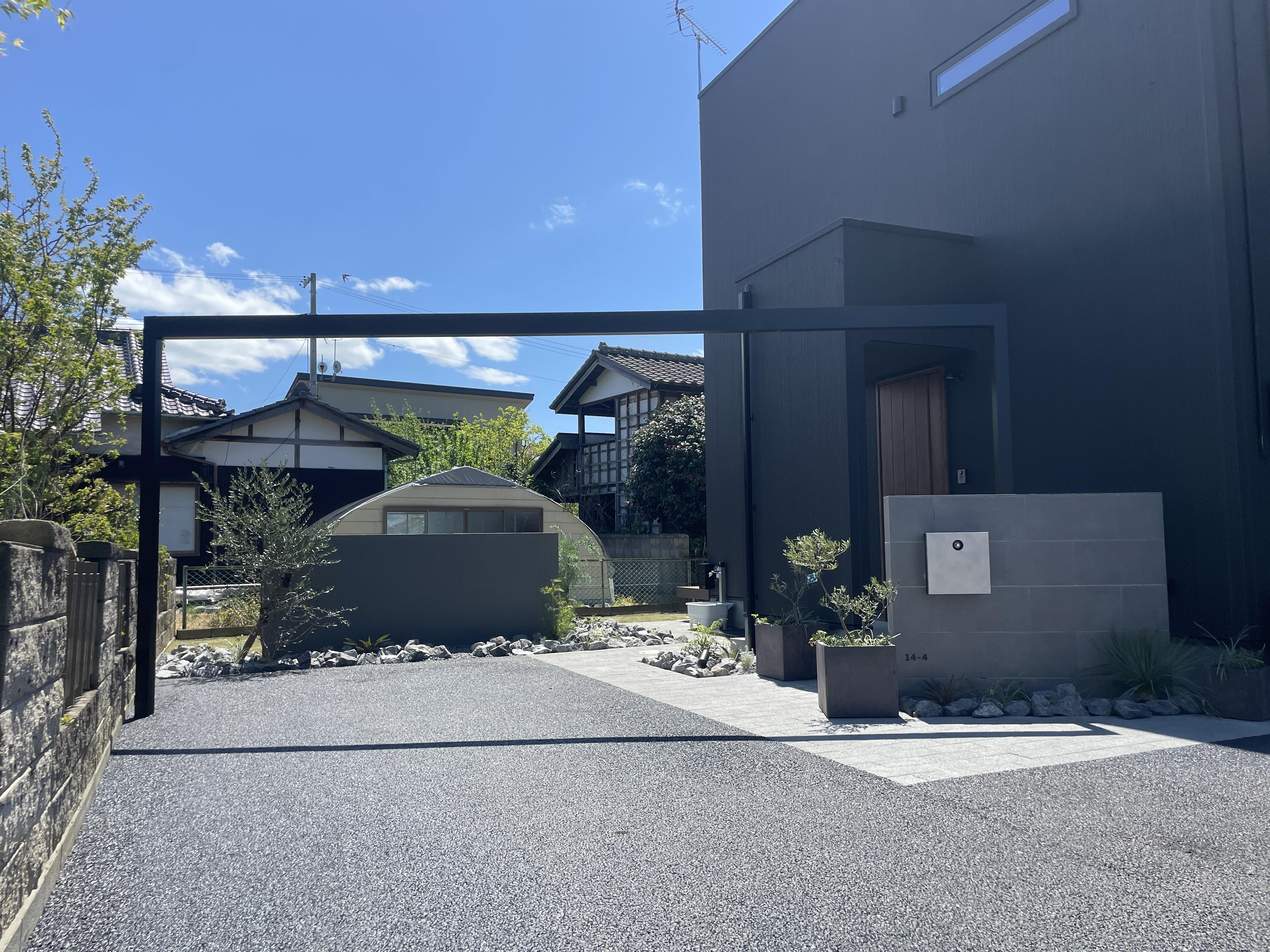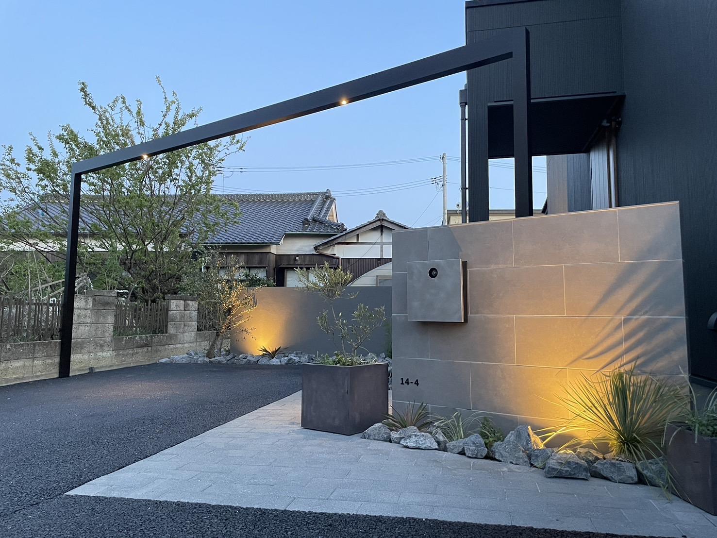 駐車スペースから玄関にかけてGフレームのアーチを設置し立体的で奥行きのあるファサードに。建物と調和しつつ、オリジナリティをプラスしシャープにまとめた外構のアクセントに仕上げました。 オプションのダウンライトで夜間も明るく家族をやさしく出迎えてくれます。非日常を感じさせる贅沢な仕上がりになり施主様も大変喜んでいただきました。