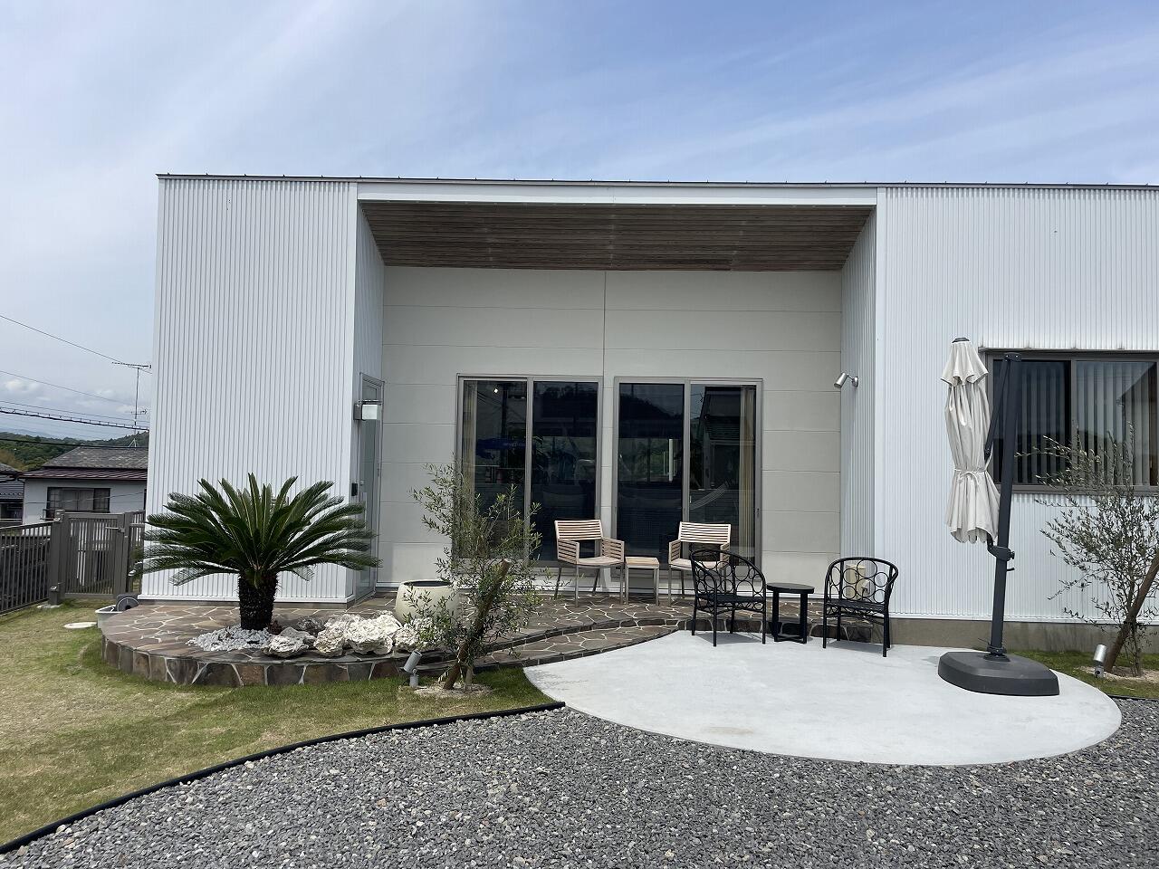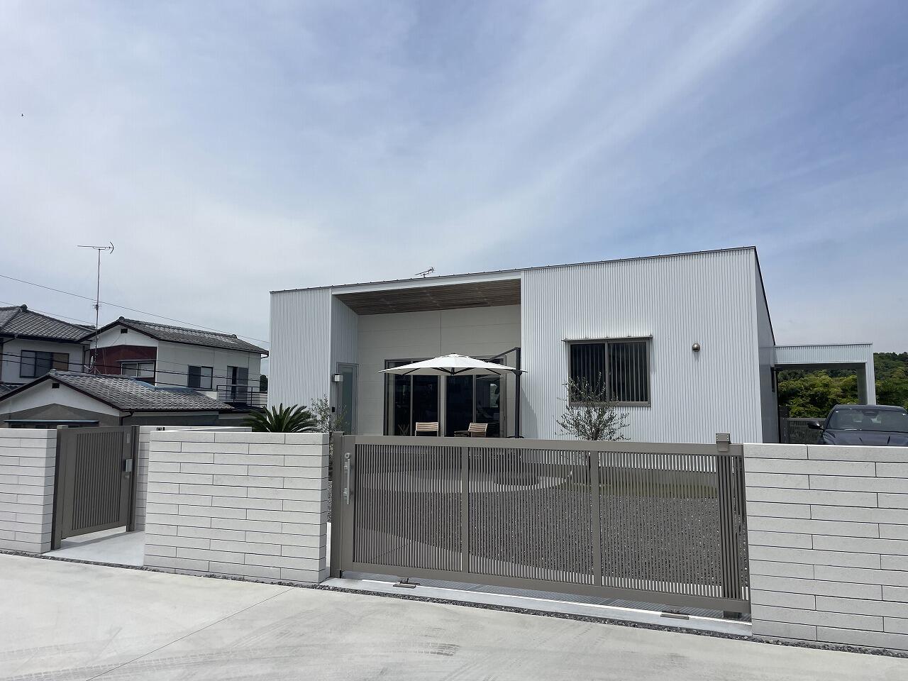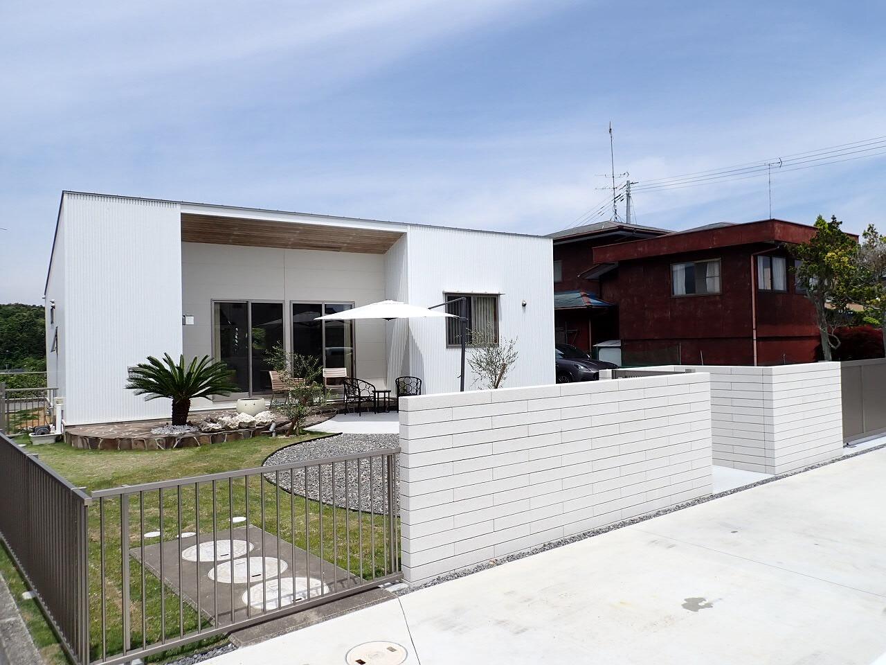 白の門壁を作り、お庭と駐車場をセパレートしました。防犯性も兼ね備えたテラスのあるリゾートガーデンになっています。