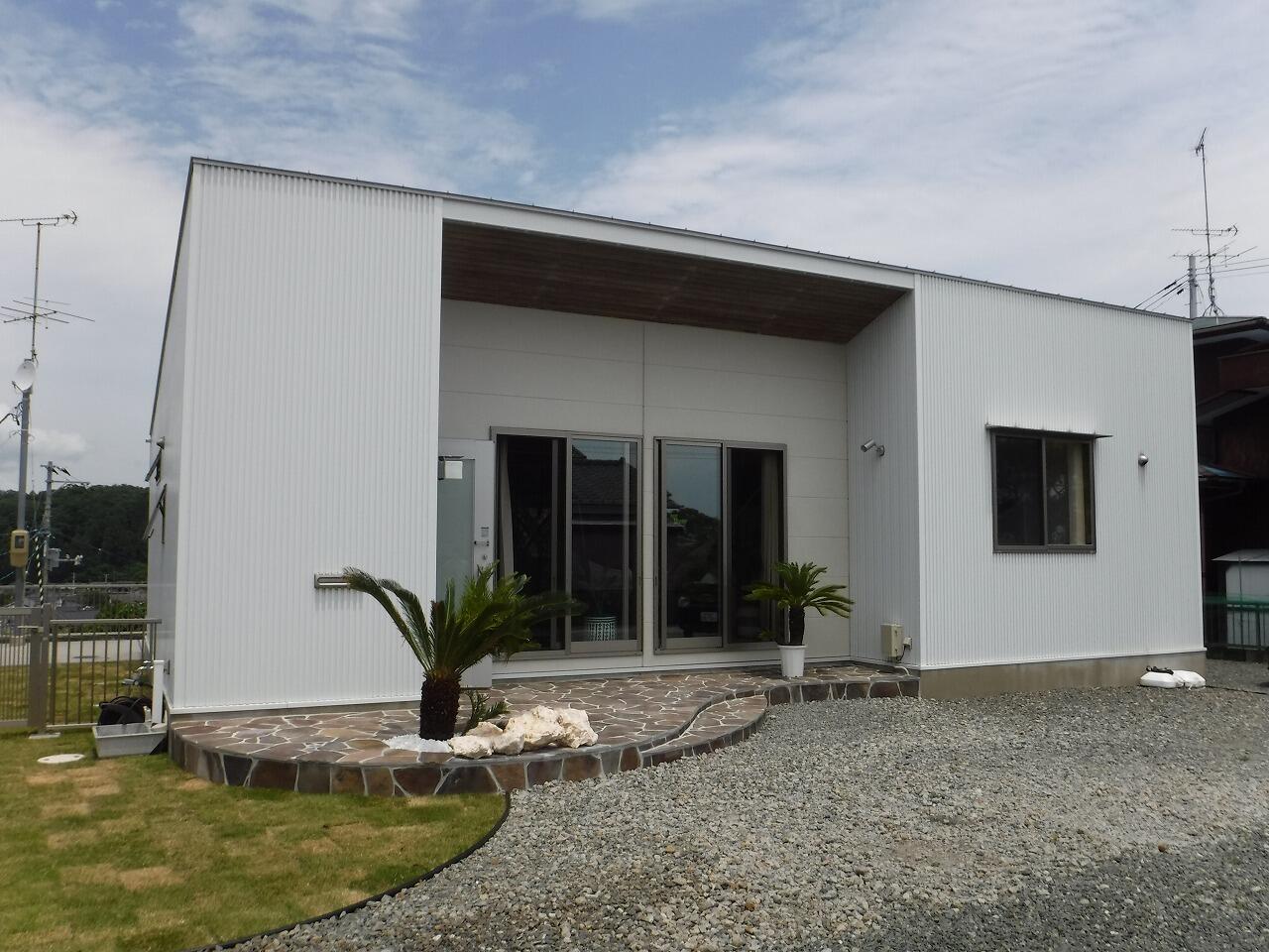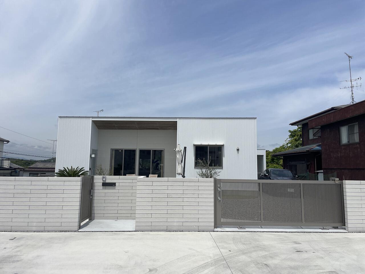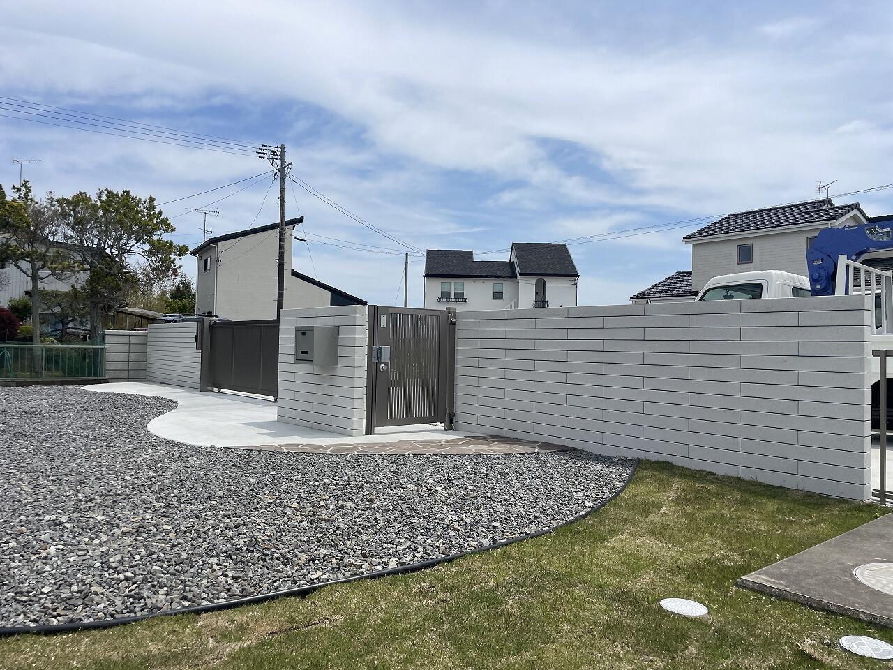 白の門壁を作り、お庭と駐車場をセパレートしました。防犯性も兼ね備えたテラスのあるリゾートガーデンになっています。