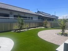 人工芝にしお手入れを快適に 曲線でナチュラルなお庭