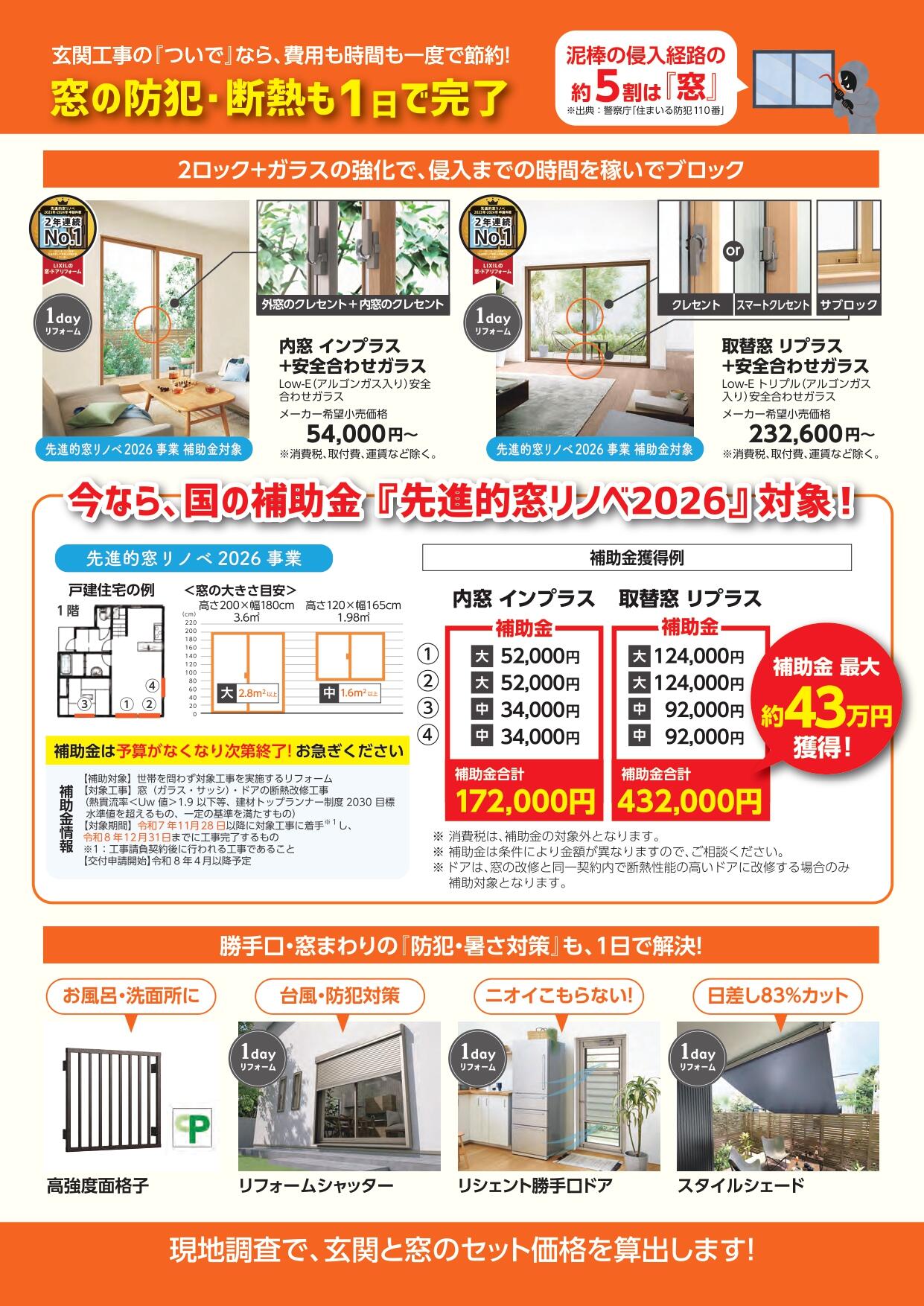 内窓「インプラス」や窓交換「リプラス」により、窓からの侵入対策や断熱性能の向上が期待できます。