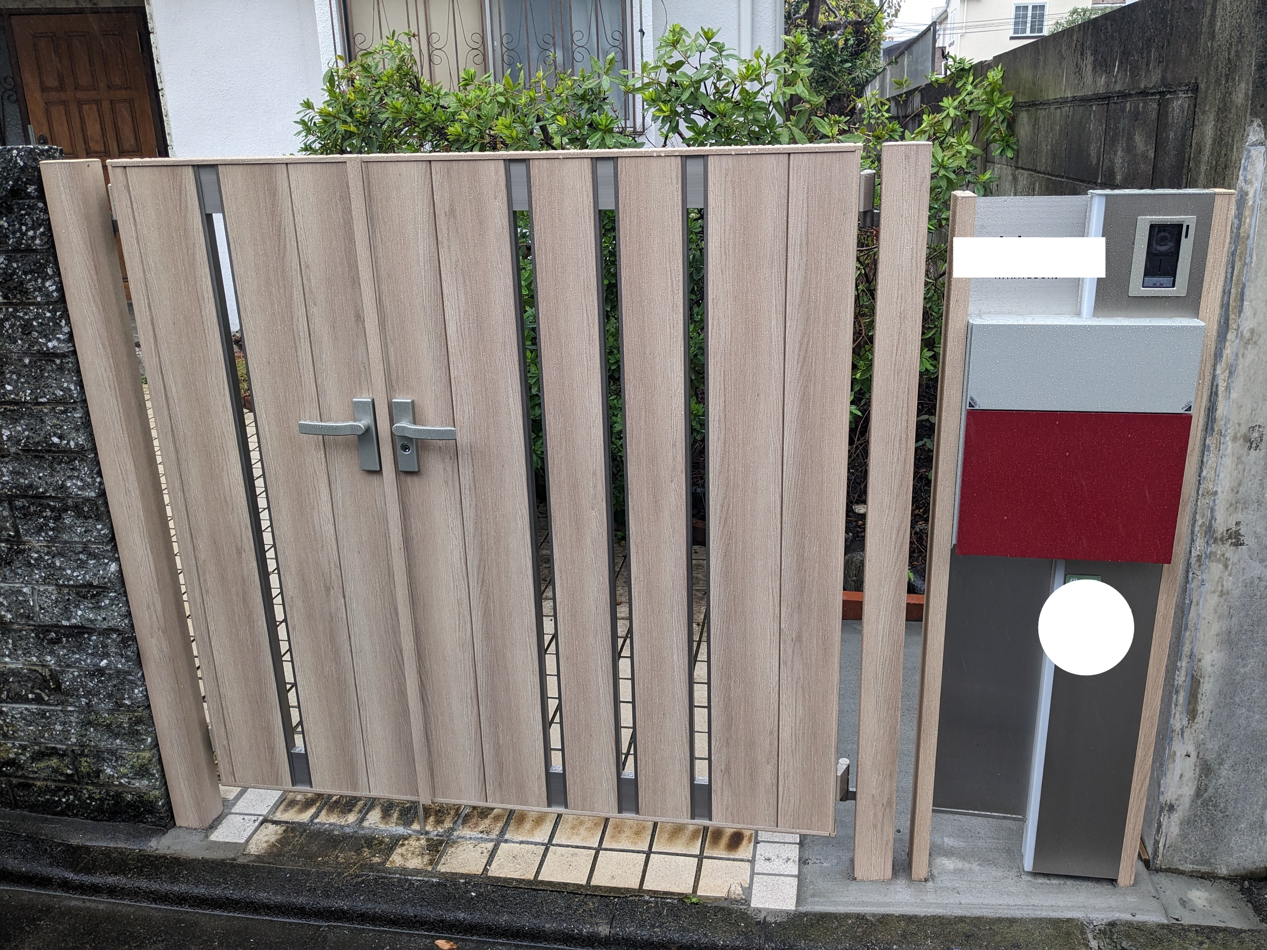 既存塀が経年劣化で傾いてしまい門扉の開閉がしづらくインターホンも玄関先にあり不便かつ防犯上も良くない為、今回門扉改修及び多機能門柱を設置致しました。 門扉と多機能門柱を同時に改修したおかげで外観も明るくなり周りの植栽剪定とモニターホンにしたおかげで防犯上も以前より安全性が上がりました。