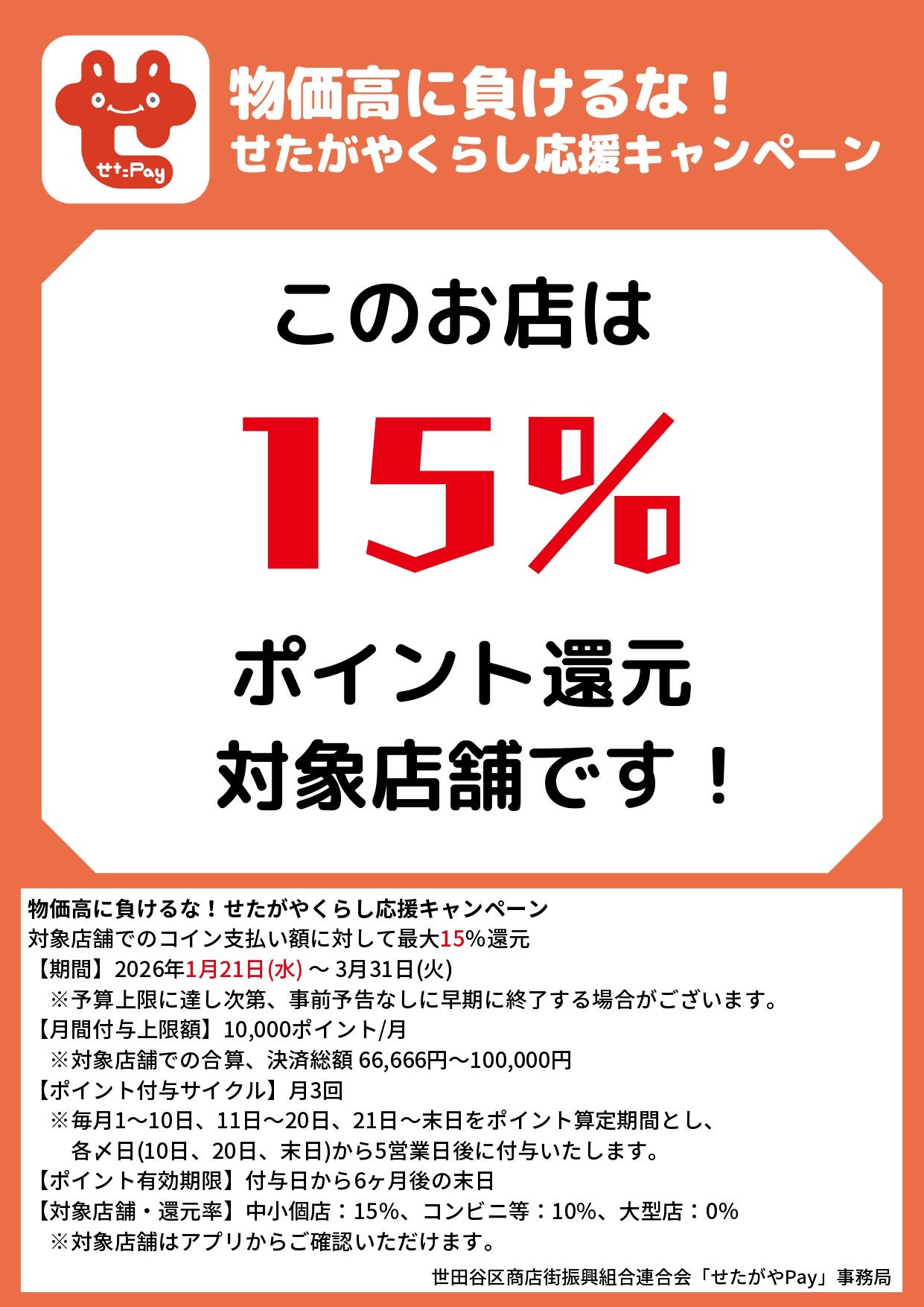 対象店舗でせたPayをご利用いただくと、最大15%ポイント還元!