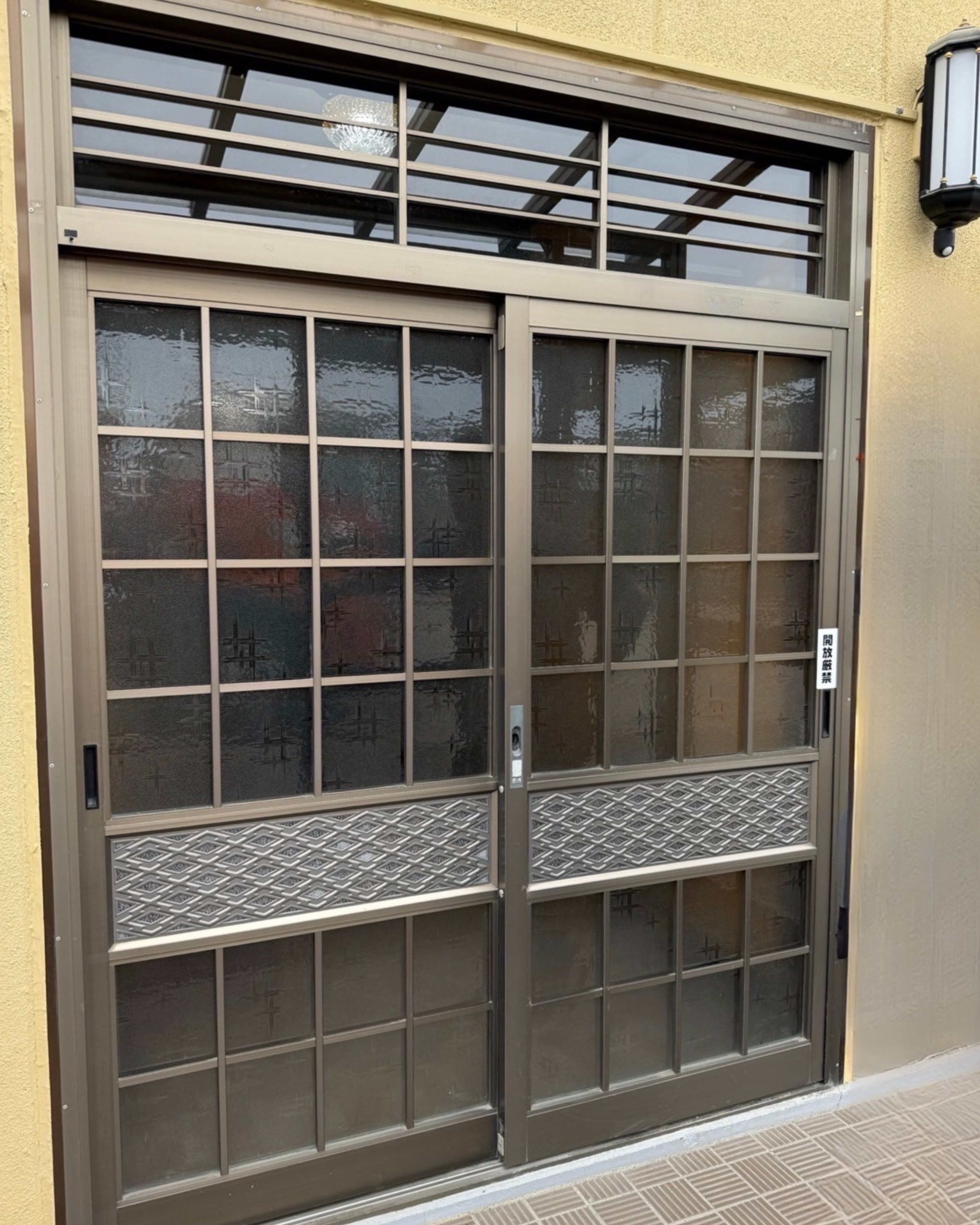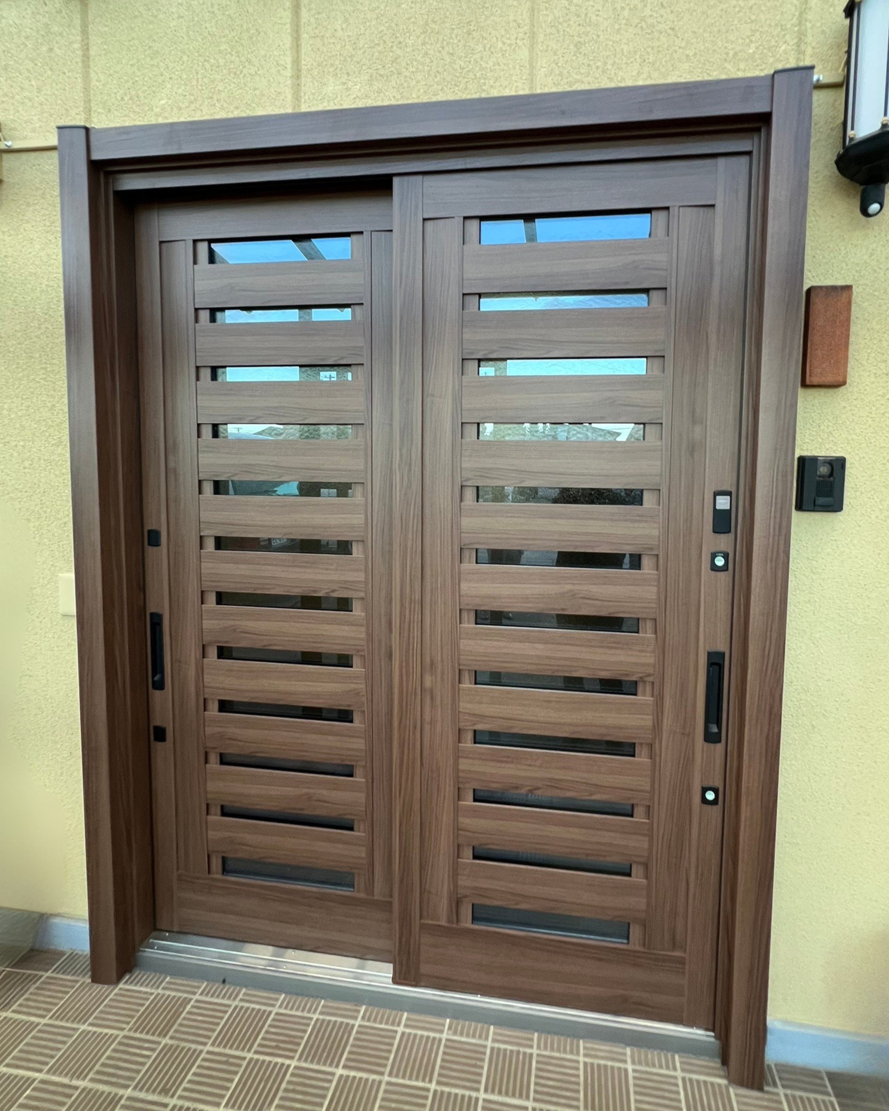 古い和風の格子デザインだった玄関引き戸が、工期1日でのリフォームにより、プライバシーを確保しつつ採光を取り入れるモダンな木目調デザインへと生まれ変わり、お家の顔を大幅に向上させました!