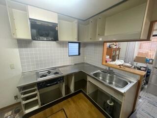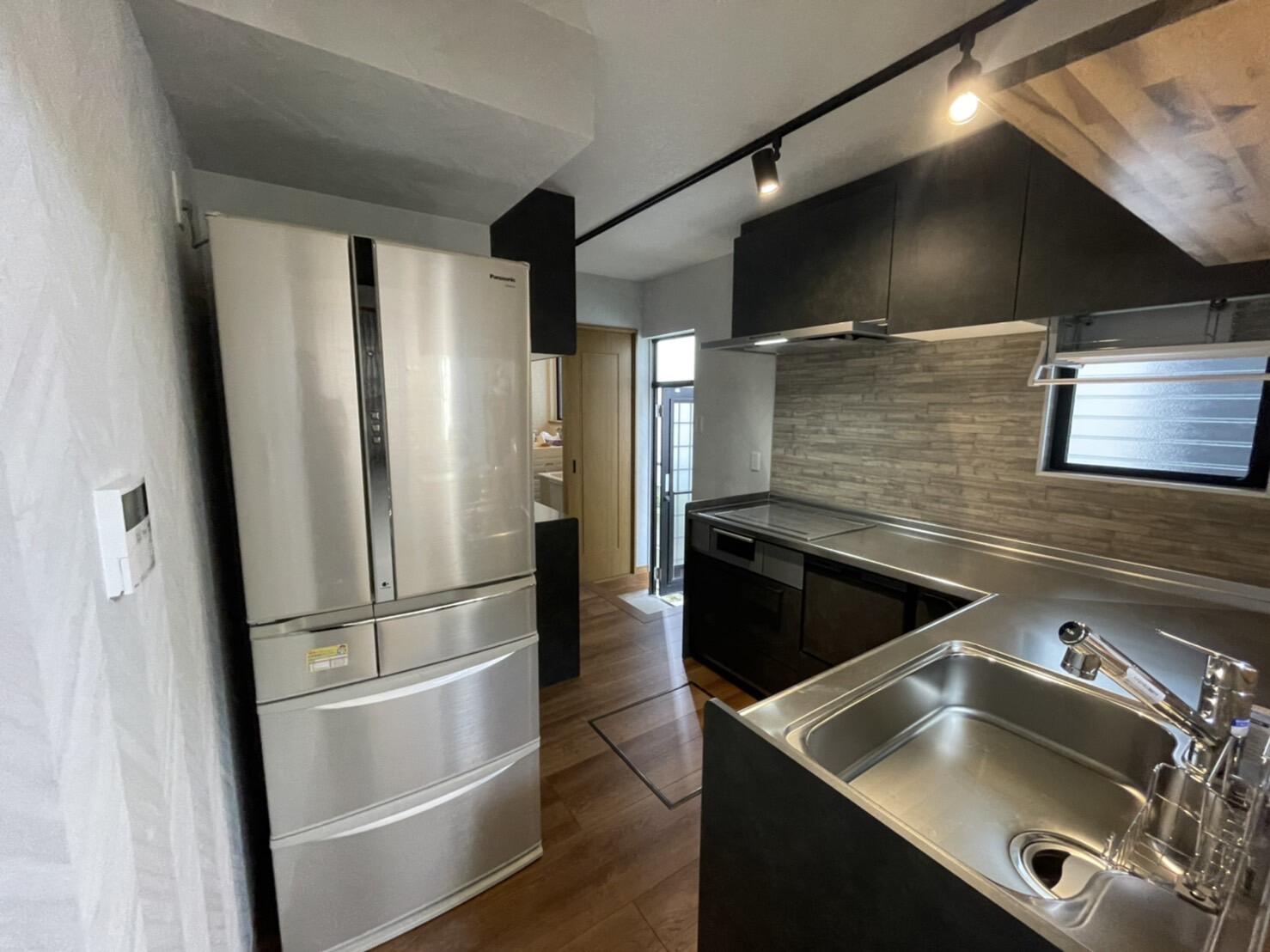 新築時から使われていたキッチンを、内装含め全体的にリフォームされた事例です。既存のナチュラル系のカラーからクールな色調の扉カラーに変えてイメージがぐっとシックに。また、タイル貼りを撤去し、ウッド調のキッチンパネルに。その他床の追い張り・壁&天井クロスの貼替えも同時に施工し、新しい照明プランを加えて、スタイリッシュな空間に仕上げました。