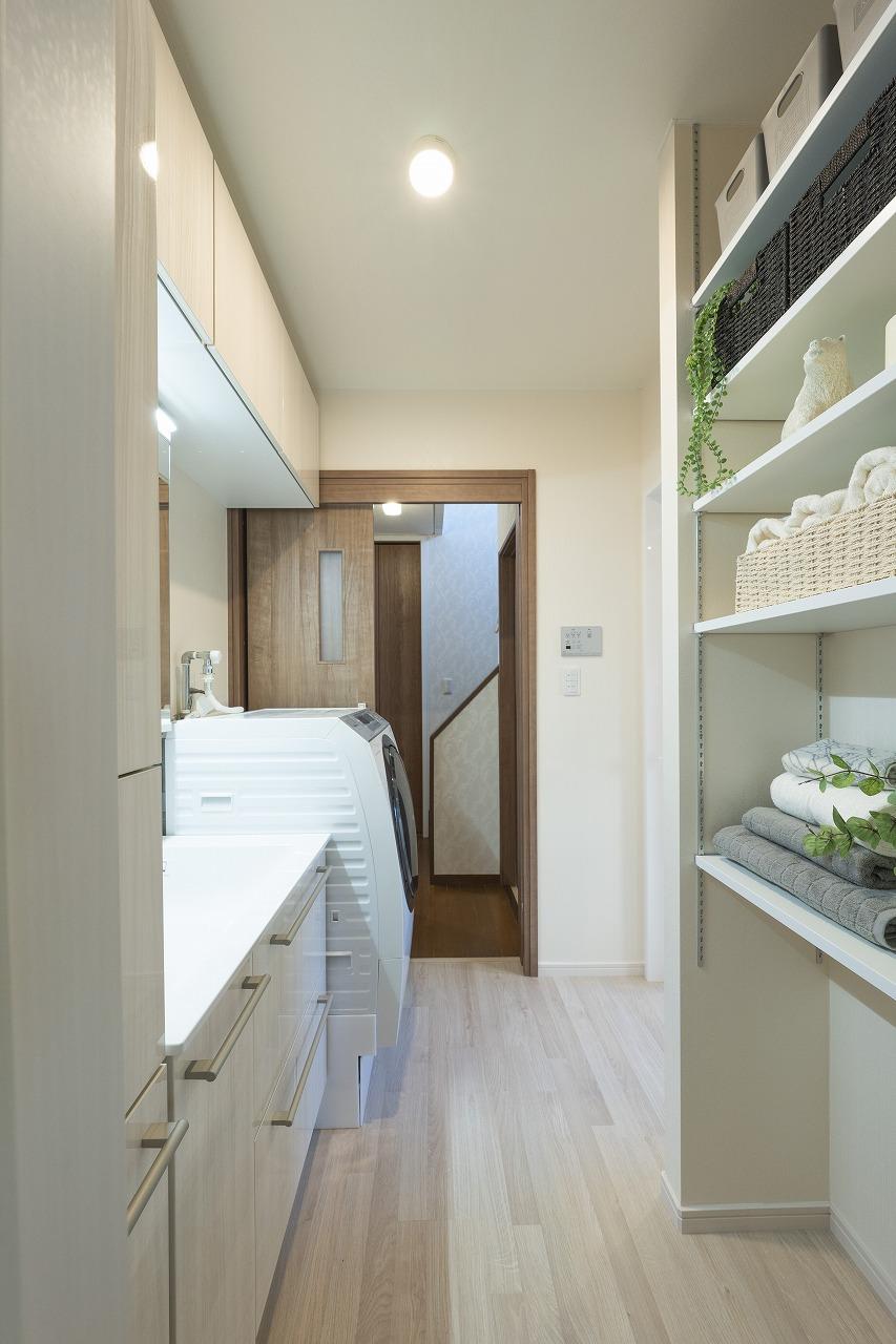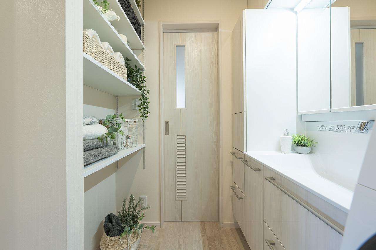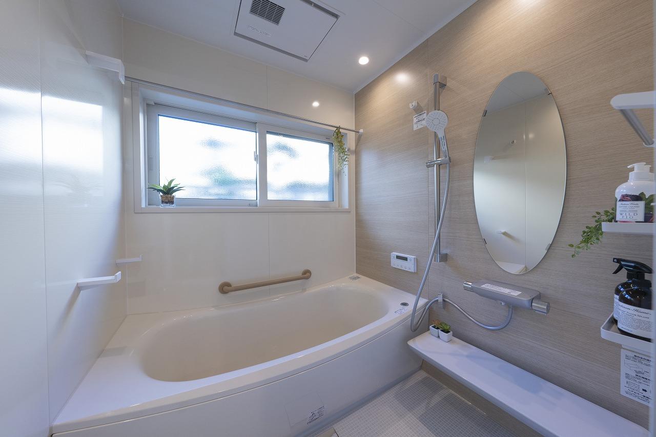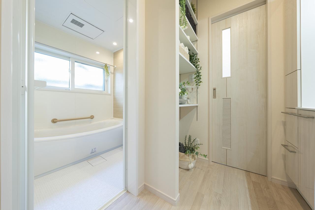 当初は単に浴室をユニットバスにするだけのつもりでしたが、せっかくの機会ですので、増築して浴室・洗面所共に広くスペースをとった事がこだわりの点です。 収納力のあるオープン棚を設置しても、とても開放感のあるスペースになり、ゆとりが感じられるのが嬉しいです。 浴室換気暖房乾燥機で洗濯物を乾かせることに加えて、入浴前にも浴室を温められるのは、寒い冬には嬉しい機能です。夏は涼風も出て爽やかに入浴できそうです。