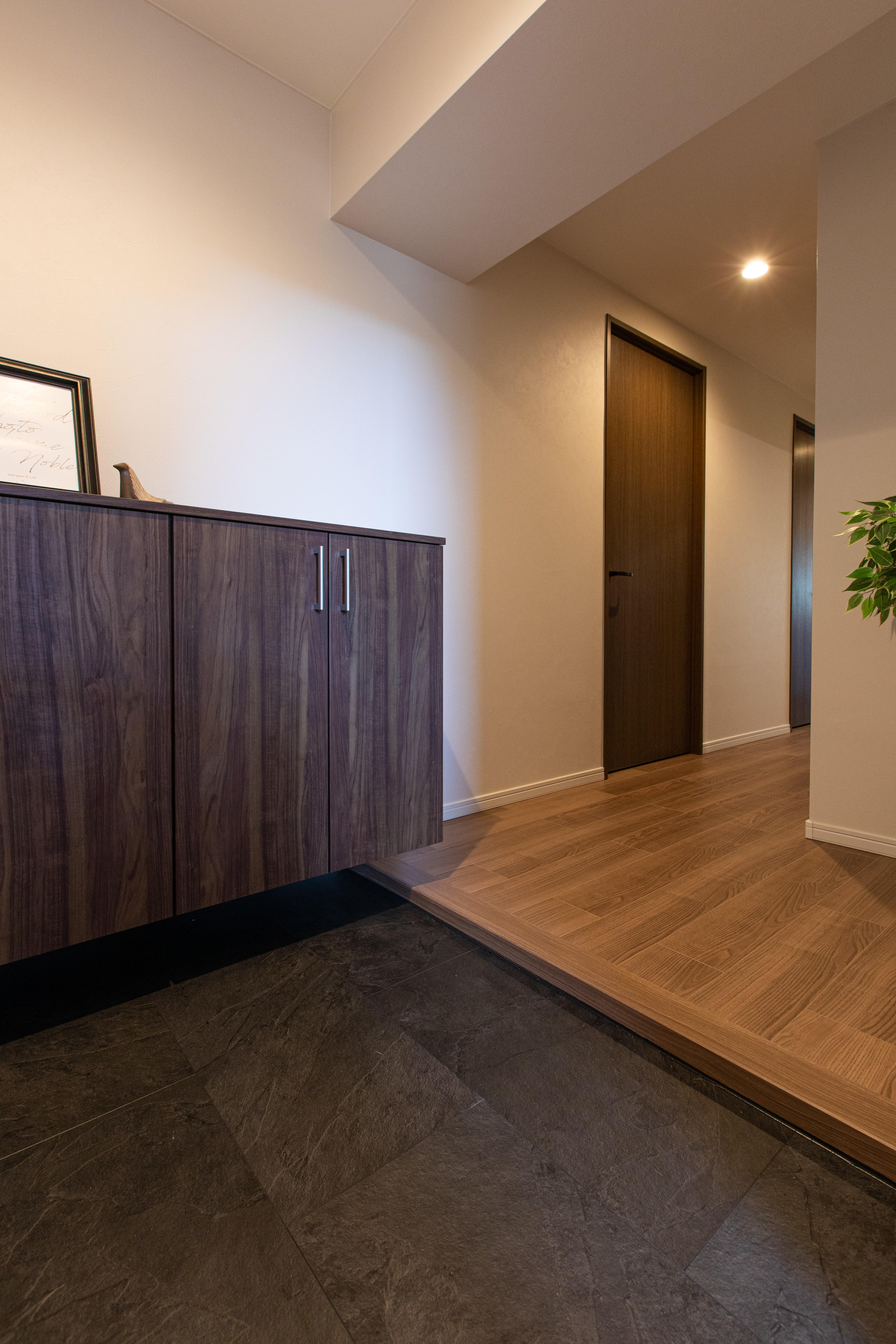 水まわりの設備をアップデートし、玄関まわりも既存のものたちと調和するリフォームを行いました。