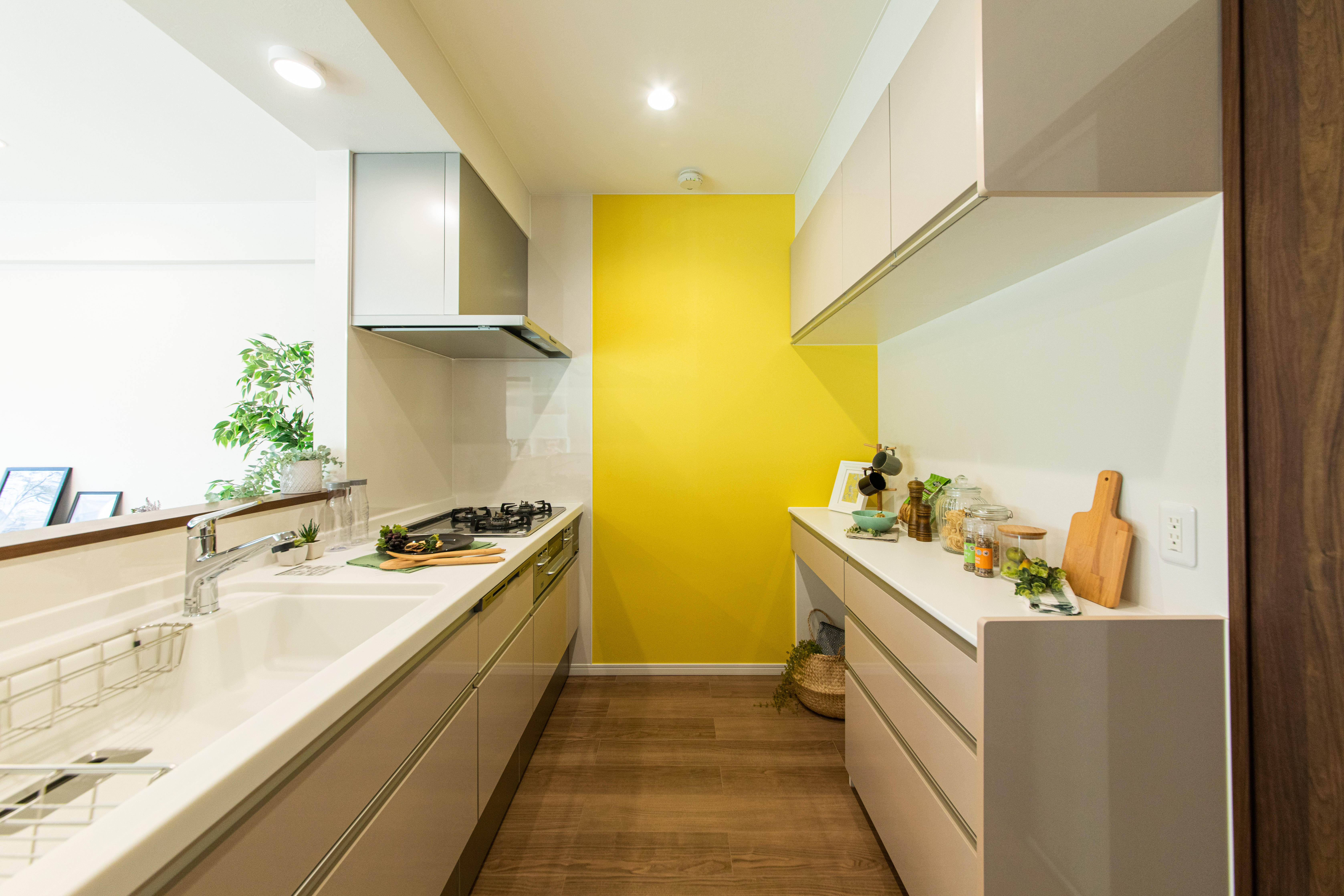 以前は、壁付けタイプのキッチンだったため、壁に向かった状態で家事を行っていました。今回キッチンを新しくするにあたり、対面式キッチンにしたいという奥様のご希望から、リビングダイニングとつながりのあるキッチンに生まれ変わりました。さらに、キッチン壁側を収納スペースとして活用できるようになったことで収納力もアップしました。