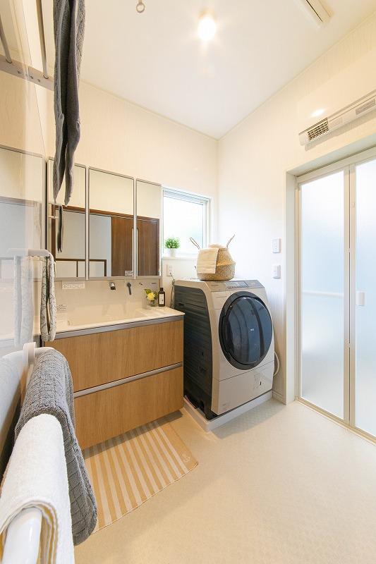 脱衣室には、壁の上部に暖房器具をつけました。建物の断熱性能がアップしているので、冬にお風呂に入る際も、暖かさはバッチリなので安心です。