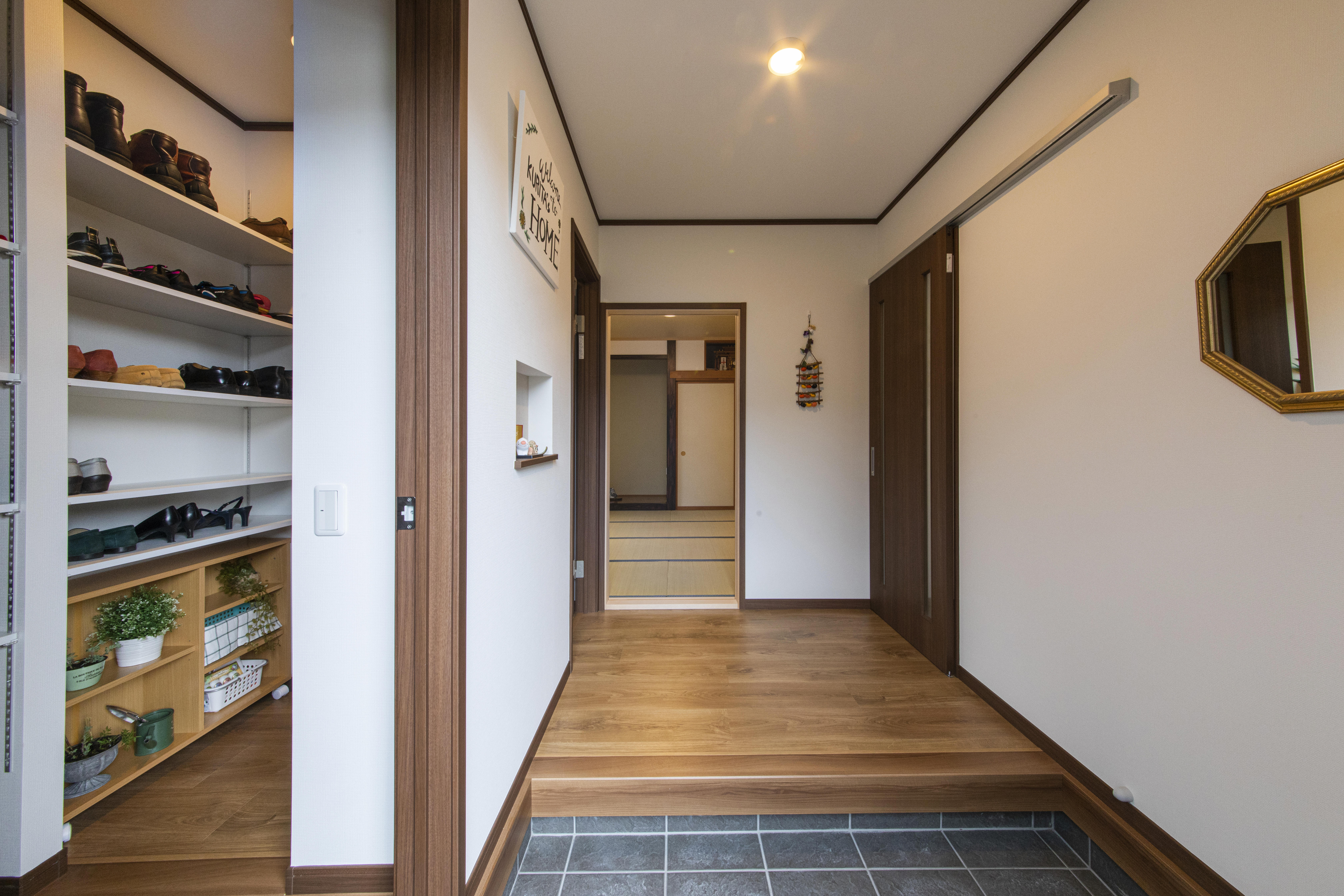 「ゆったりとくつろげるリビングにしたい」というご要望でしたので、リビングを広々と使えるように、“ちょこっと増築”をしました。もともとの玄関部分をリビングのスペースとして取り込んでいます。また、以前の玄関は吹抜けでしたが、2階部分にも床を張り、ホールとして使えるようになりました。室内干しの際にも重宝するスペースです。