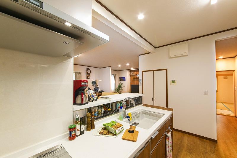 以前のキッチンも対面式でしたが、吊り戸棚がついていました。上部の収納を取り払い、カウンター幅が広いタイプのキッチンにしたことで、すっきり明るいダイニング・キッチンになりました。さらに使いやすく、毎日のお料理が楽しくなりますね。