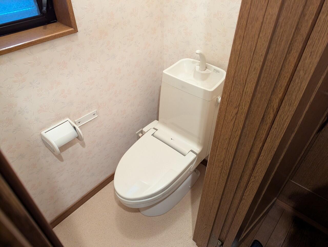 長年使われたINAXのトイレを最新機種に交換いたしました。 床のクッションフロア、壁天井の壁紙も張替えさせていただきました。