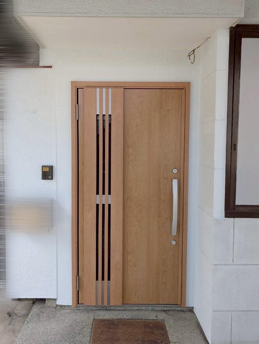 娘様より「一人暮らしのお母様のために安心できる玄関にしたい」とのご要望をいただきました。 昔ながらのガラス入りの框(かまち)ドアを、防犯性と快適さを兼ね備えた現代風の玄関ドアへ交換。 採風タイプを選ばれたことで、ドアを閉めたまま自然の風を取り入れられる心地よい住まいになりました。 使用していただいたLIXIL商品:ジエスタ2※採風タイプ (色:クリエラスク)