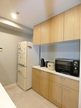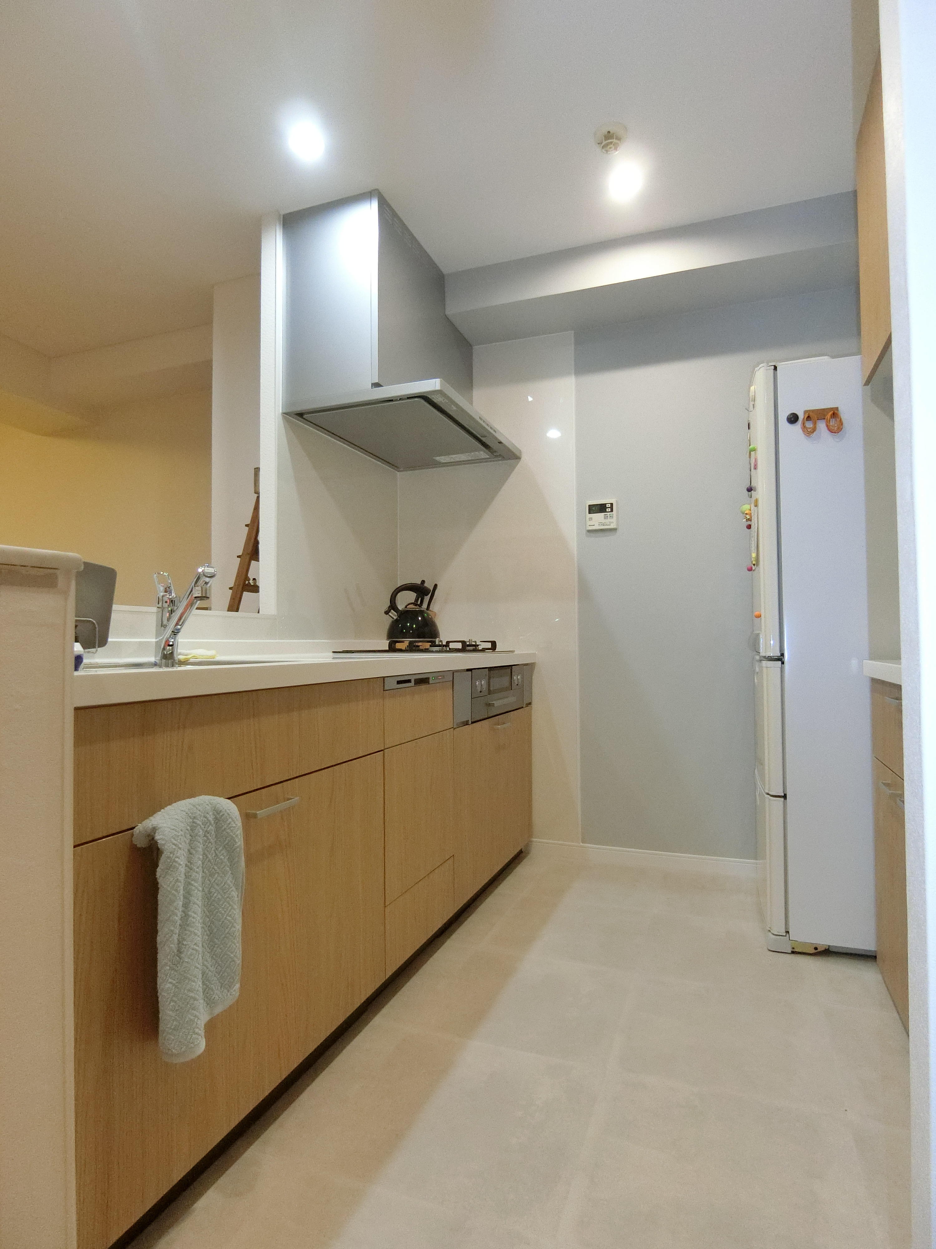 キッチン床は明るく白のフロアタイル貼。壁紙は淡いブルーを差し色にすることで優しい北欧風テイストに!