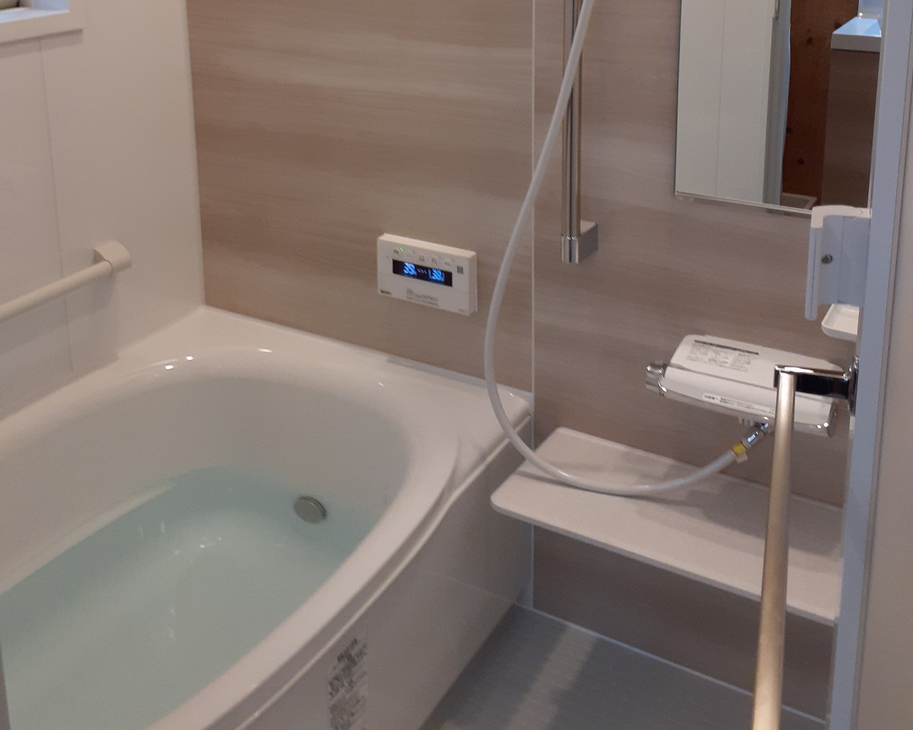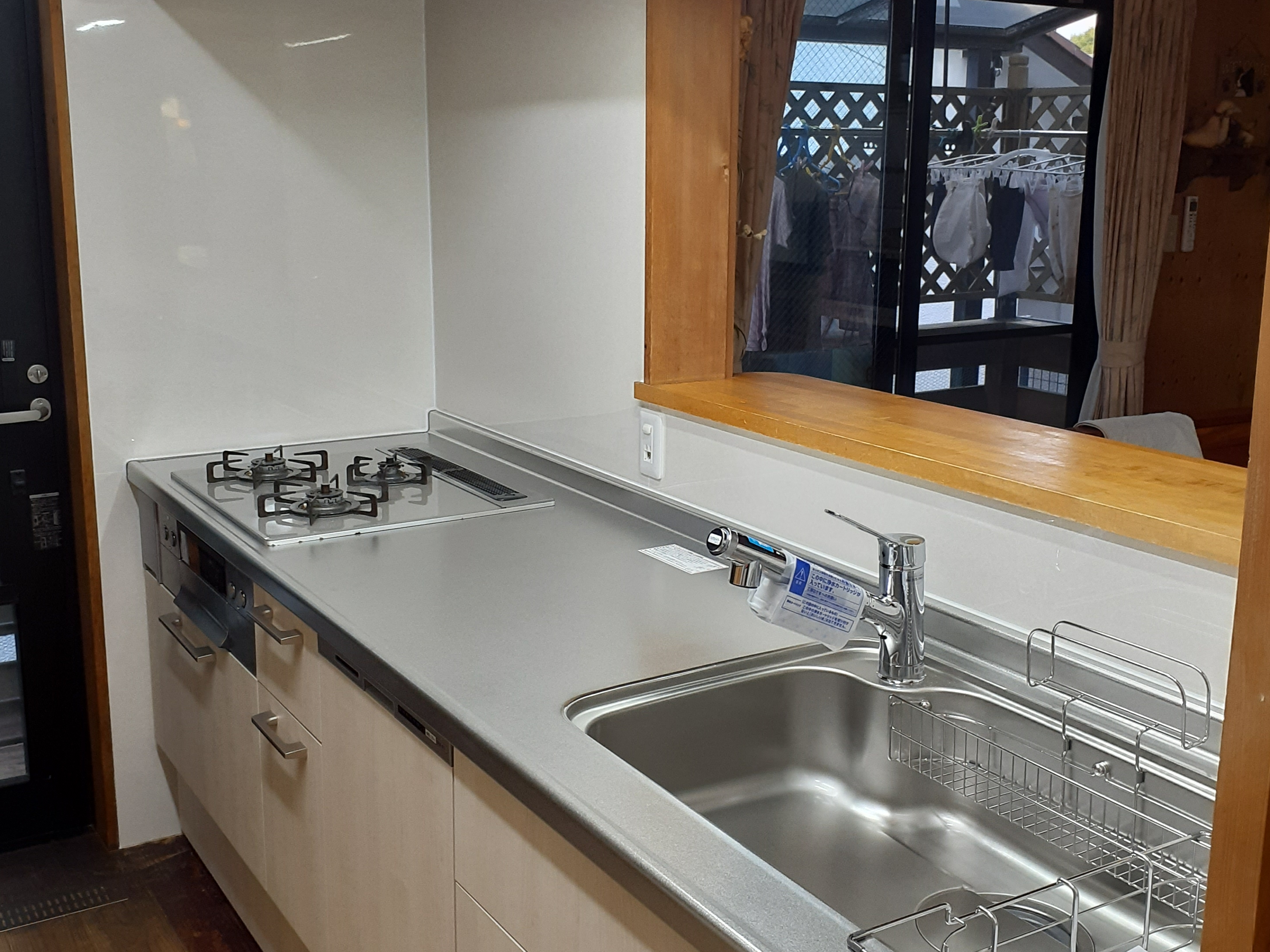 キッチン、お風呂、トイレ、洗面、の水回り設備全てを 20数年の経年をきっかけにフルリフォームされました。 このリフォームに合せて、カップボードも同じ扉カラー で新調され、調和のとれたキッチンスペースを実現され ました。お風呂は保温浴槽と浴室暖房機能で寒い冬も快適 な空間を実現。洗面にはタッチレス水栓を採用され、節水 と清潔な環境も同時に実現されています。