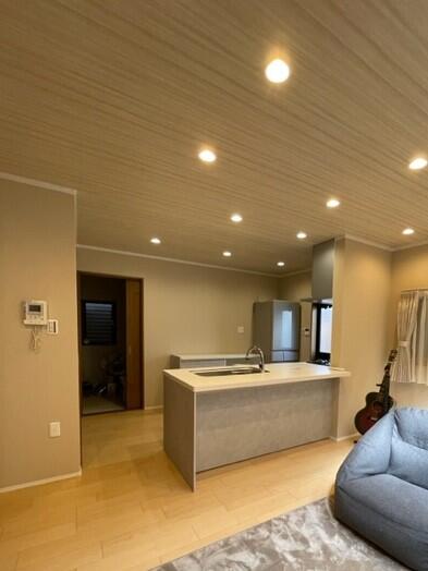 既存の天窓から差し込むやわらかな自然光を引き立てるように、ダウンライトを新たに追加。光が重なり合い、心からくつろげる空間へ。