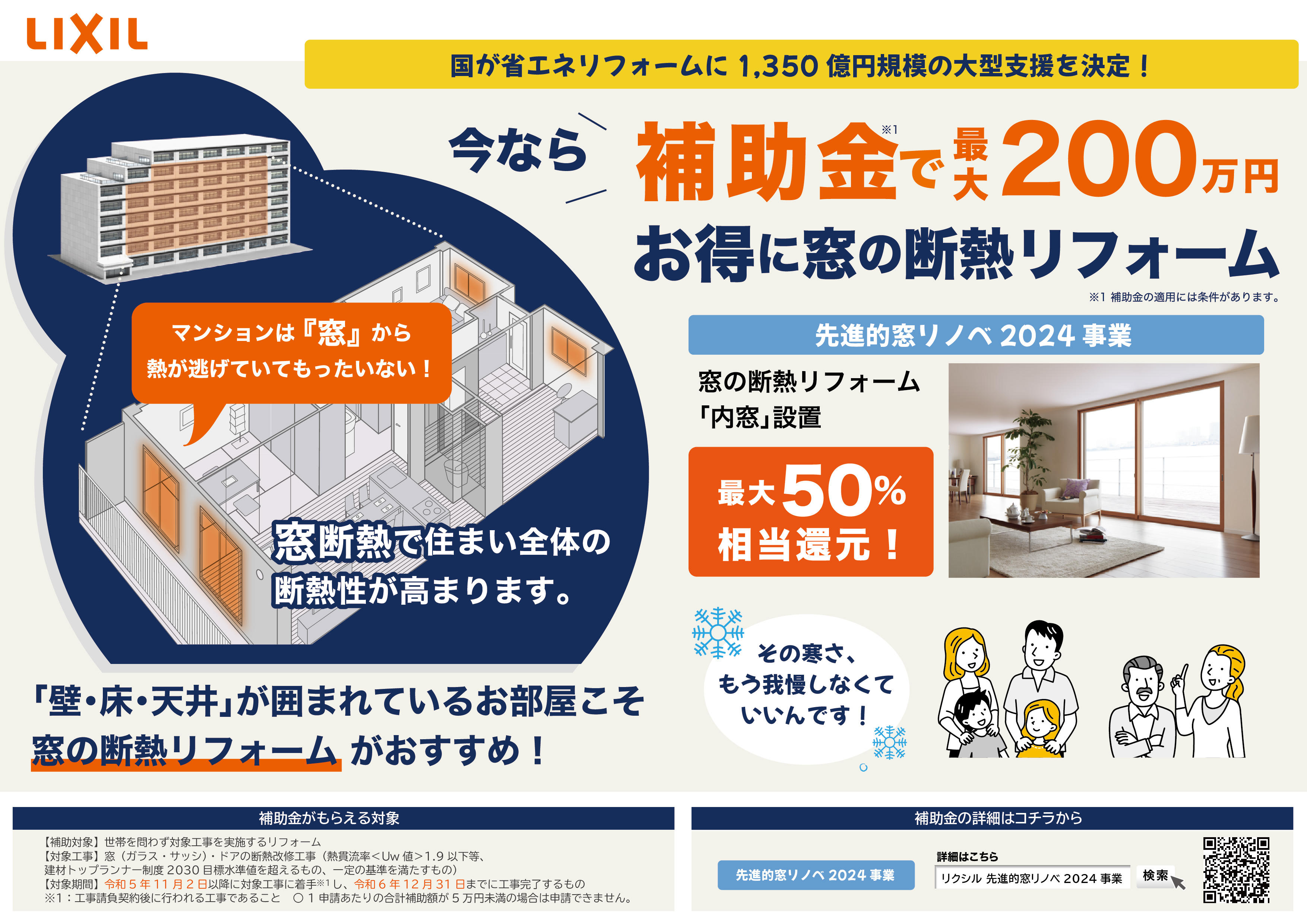 LIXILリフォームショップアーニストホームでは、先進的窓リノベ2024事業の申請手数料はいただいておりません。
