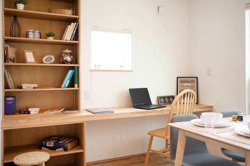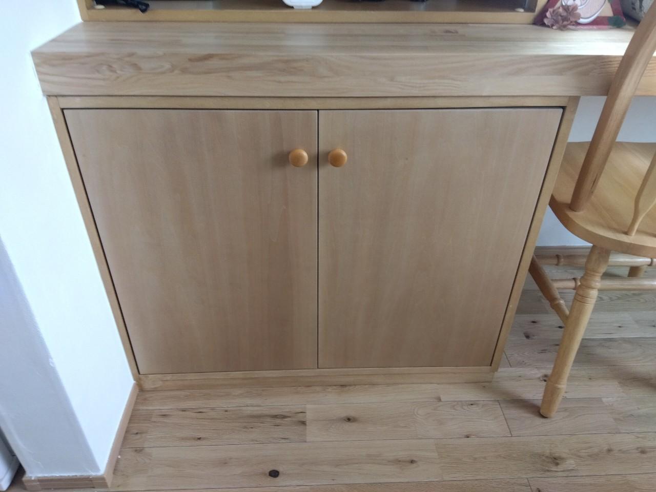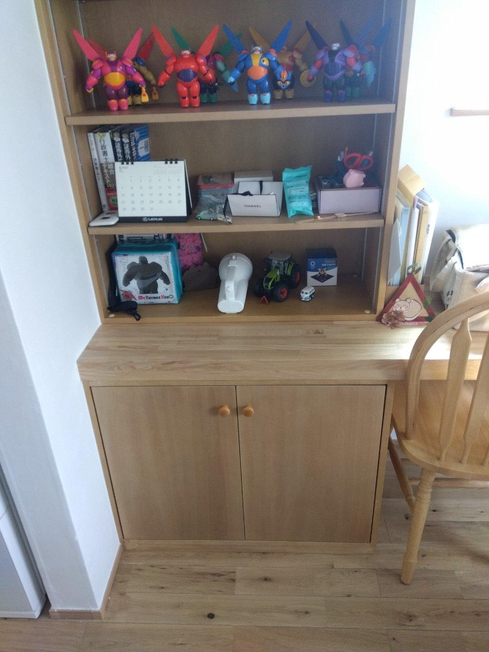 弊社OBのお客様より、壁付けオープン本棚(南海プライウッド社製)の下段に造作扉を付けたいというご要望をいただきました。棚の使い方として下段には本ではなく小物をカゴに入れて収納する方が使い勝手が良いとの事で、キャビネットの様に目隠しをしてスッキリとした見た目になる木製扉をご提案させていただきました。素材は元の本棚と同じアートランバー、色は棚同色、家の雰囲気に合わせた木製のつまみを付けて可愛らしいキャビネットが完成しました。費用は54,000円(税込)でご提案させていただきました。