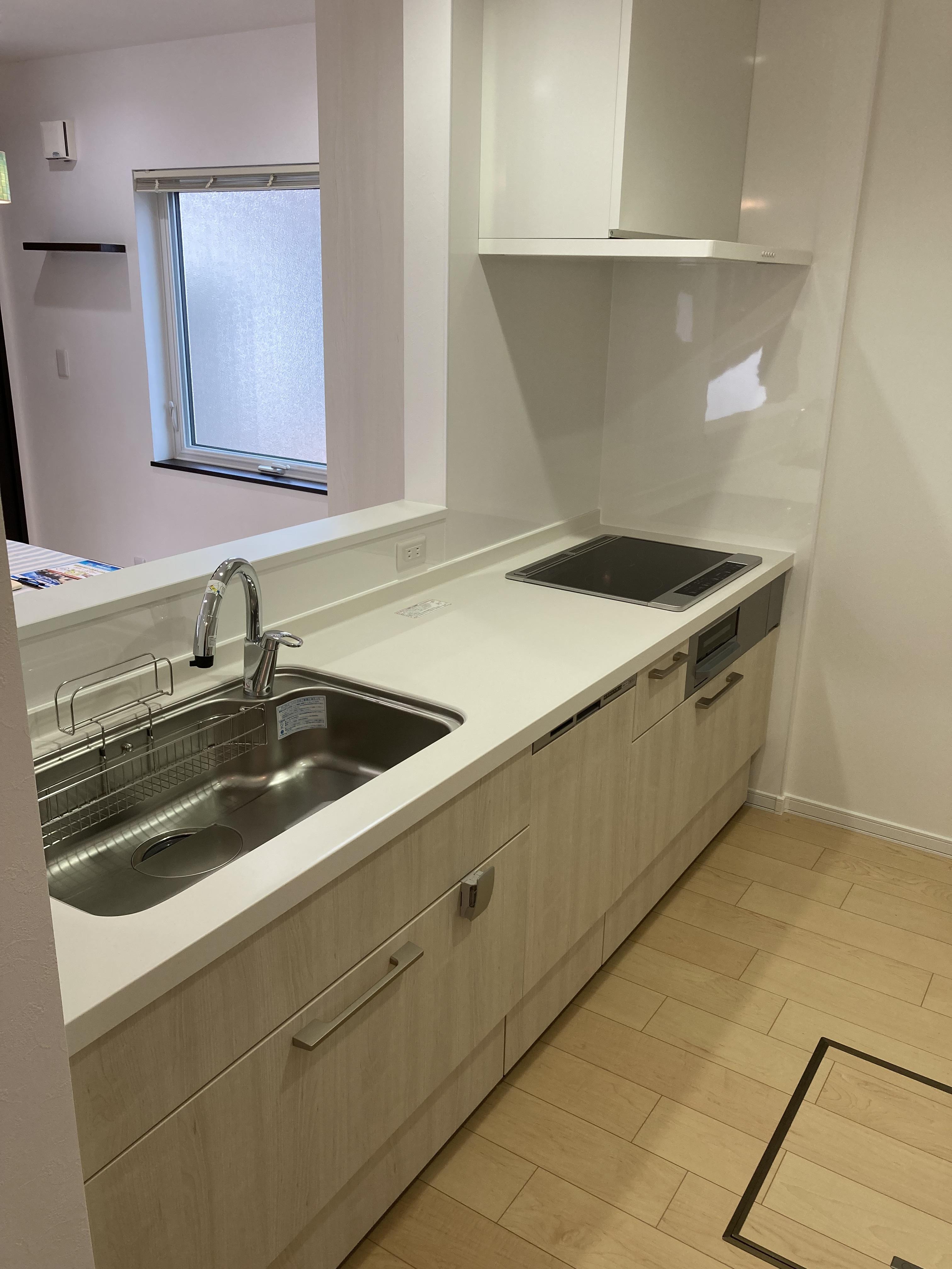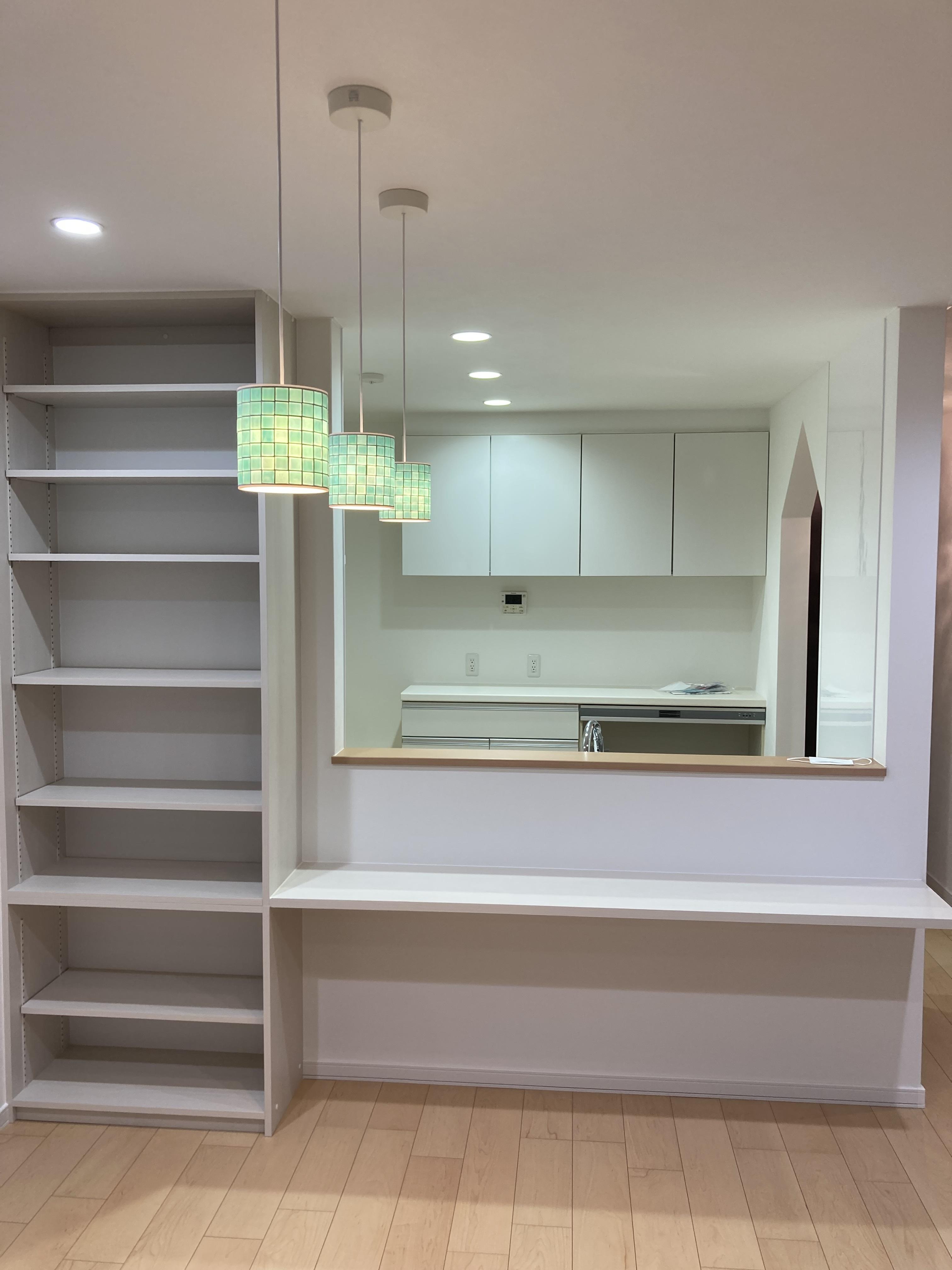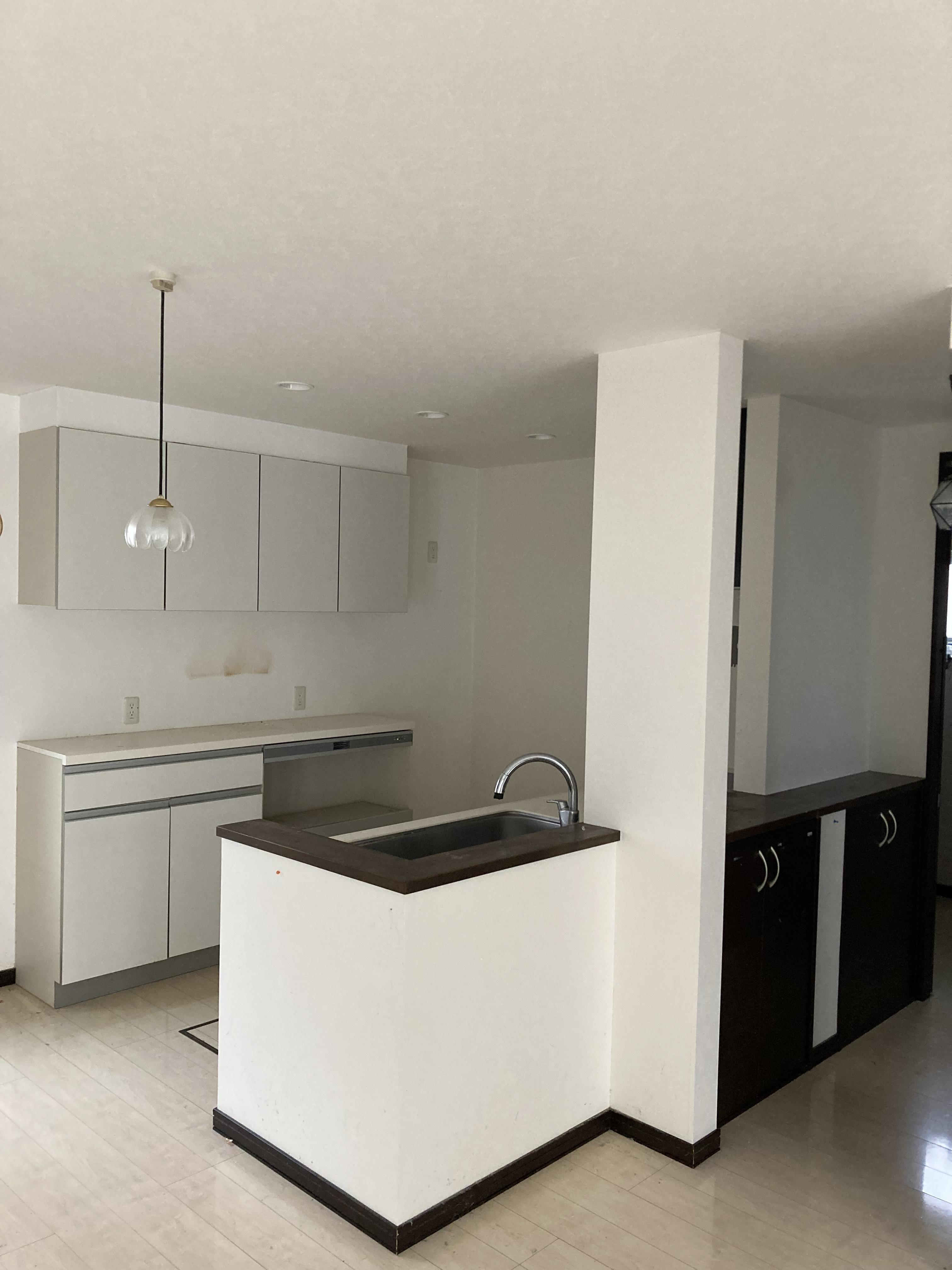 新築後12年暮らしてきましたお施主様より、キッチンから洗面所までの動線が遠いという不便さを感じているというお悩みを伺いました。キッチンを新調するだけに留まらず、キッチンの向きを変える事で洗面所に直ぐに行けるようになるほか、対面に変更し向い側にカウンターや可動棚を設置し動線だけでなく、収納力もアップするリフォームをご提案させていただきました。