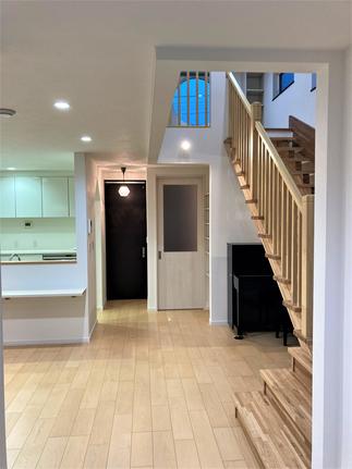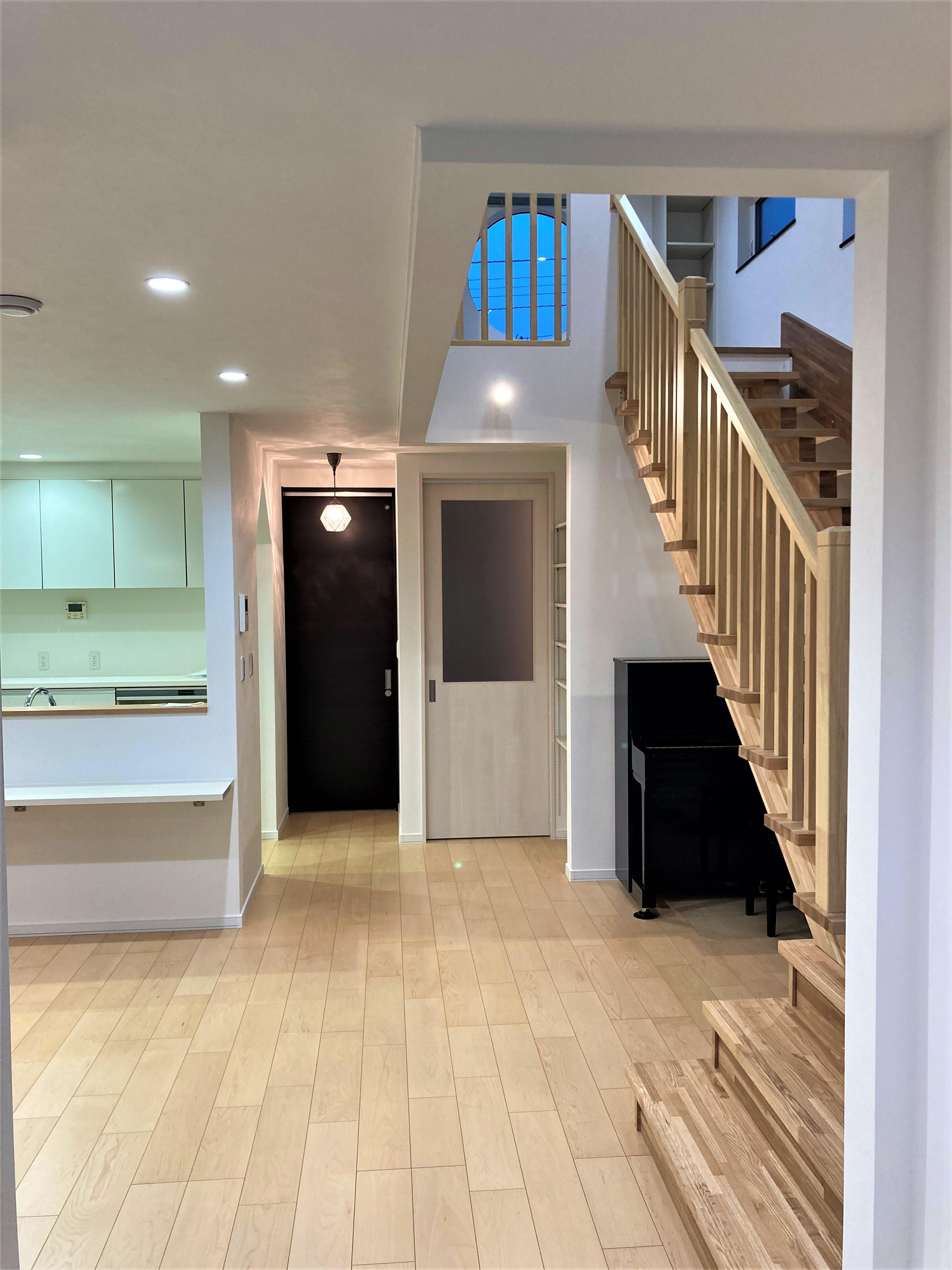 増築により部屋や収納が増えた分、開放的な空間もプラスしたいというお施主様のご要望もあり、階段室を解体して収納に変化させたり、寝室の床を撤去し吹き抜けを造り、兼ねてから希望されていましたスケルトン階段と滑り台を新設し、ちょっと他に無いくらいダイナミックなリビングに変化させていただきました。もちろんピアノもスッキリ収納できました。