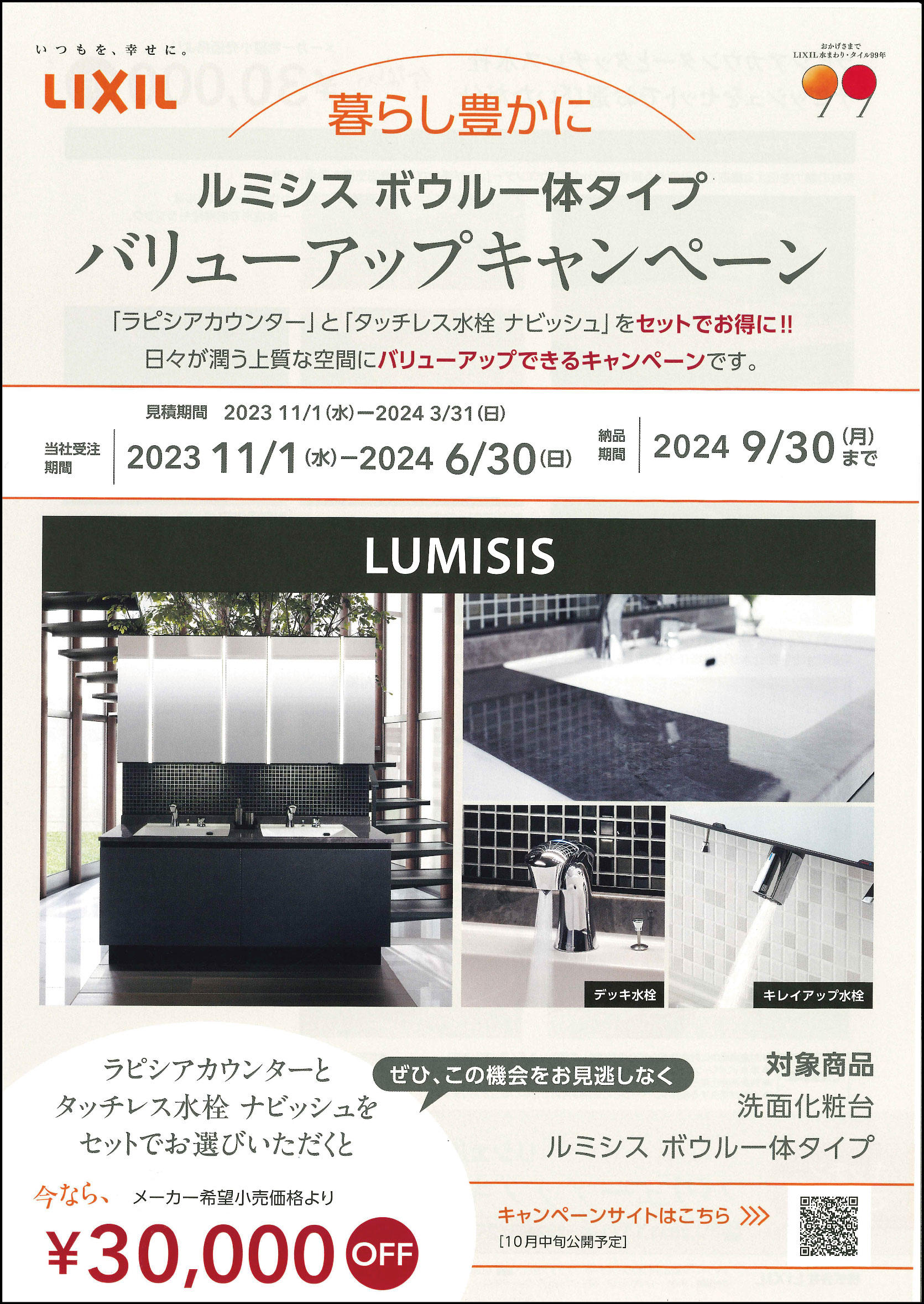 2023年11月1日(水)より、LIXILの洗面化粧台「ルミシス ボウル一体タイプ バリューアップキャンペーン」が開催中です!
