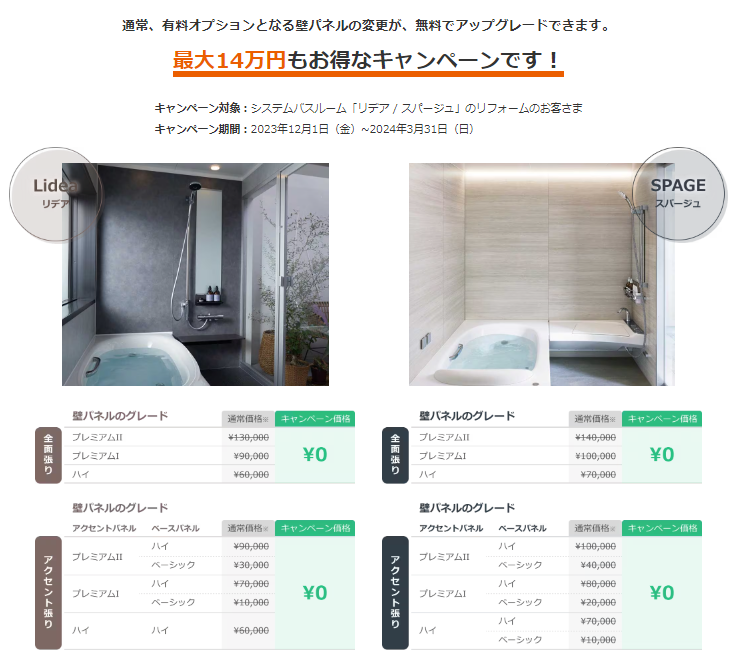 対象商品は、システムバスルーム スパージュ・リデアとなります。