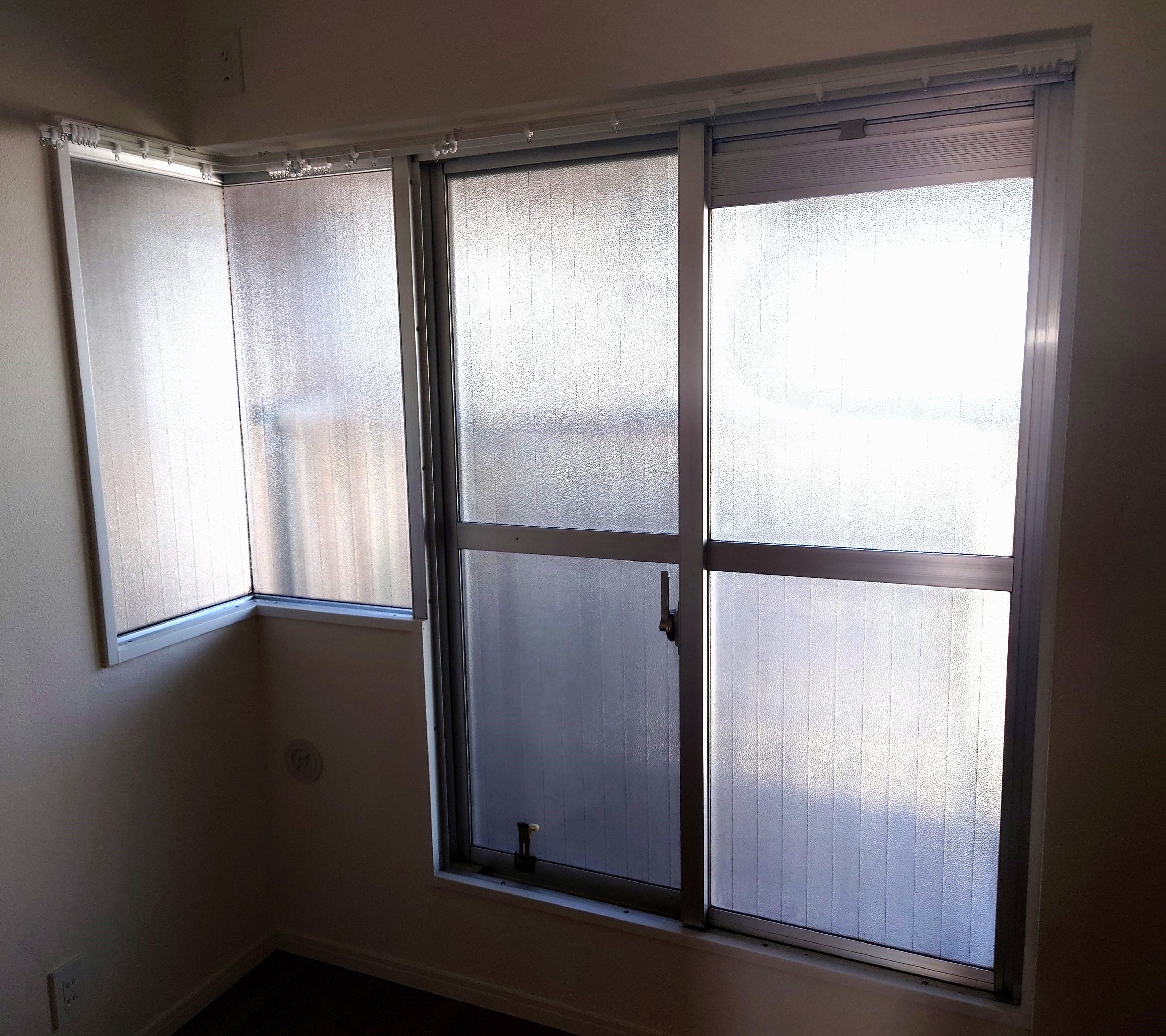 千葉市内のマンションにてインプラスの施工を行いました。 今回は特殊な形状の窓(引き違いサッシ+コーナーサッシ)が2ヵ所、通常の窓が2ヵ所、テラスドア1ヵ所の合計5か所の施工となりました。 特殊形状のサッシはインプラスの標準部材で施工が出来ないため窓枠を造作して取付を行いました。 ※先進的窓リノベ 補助金利用